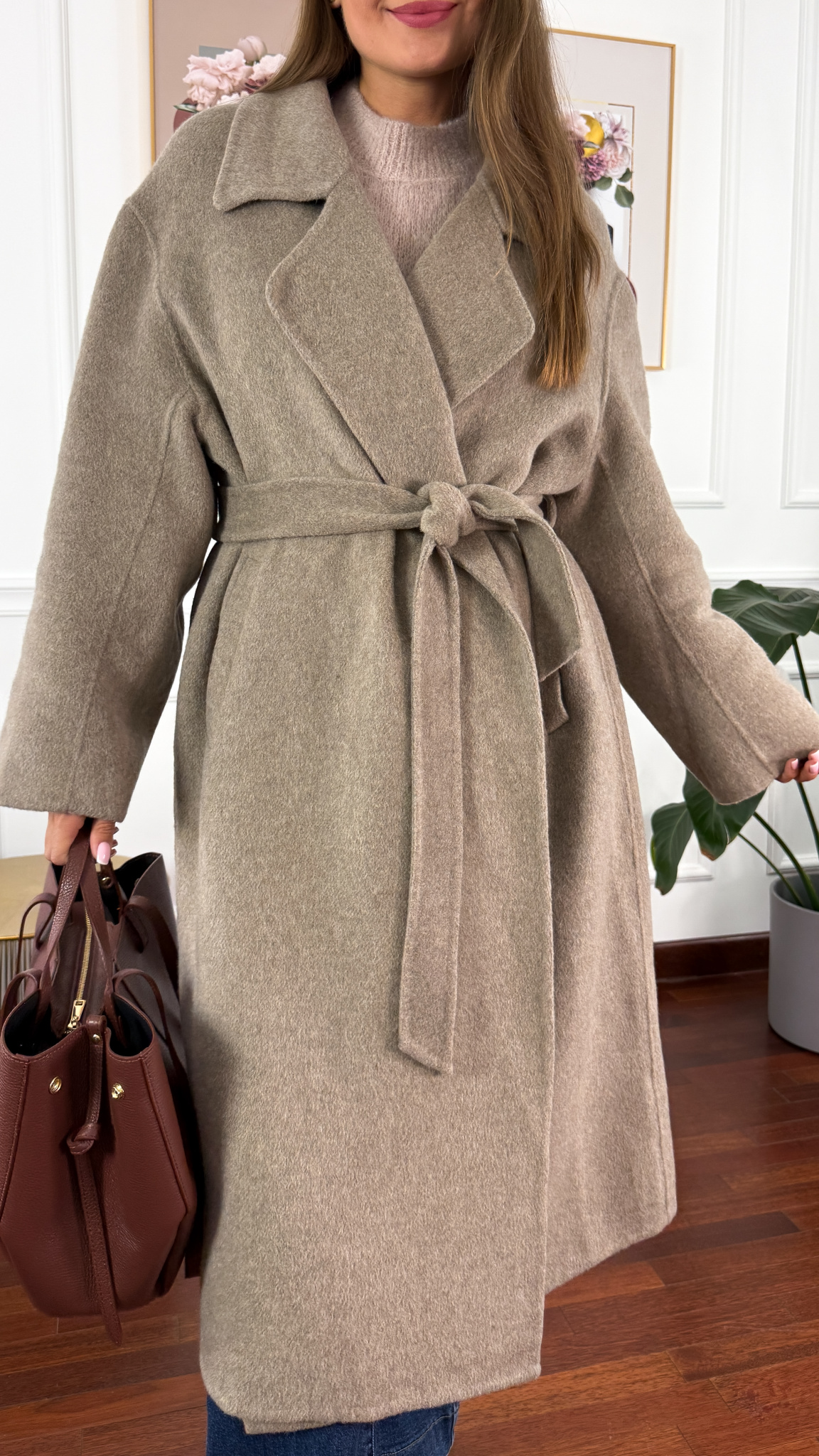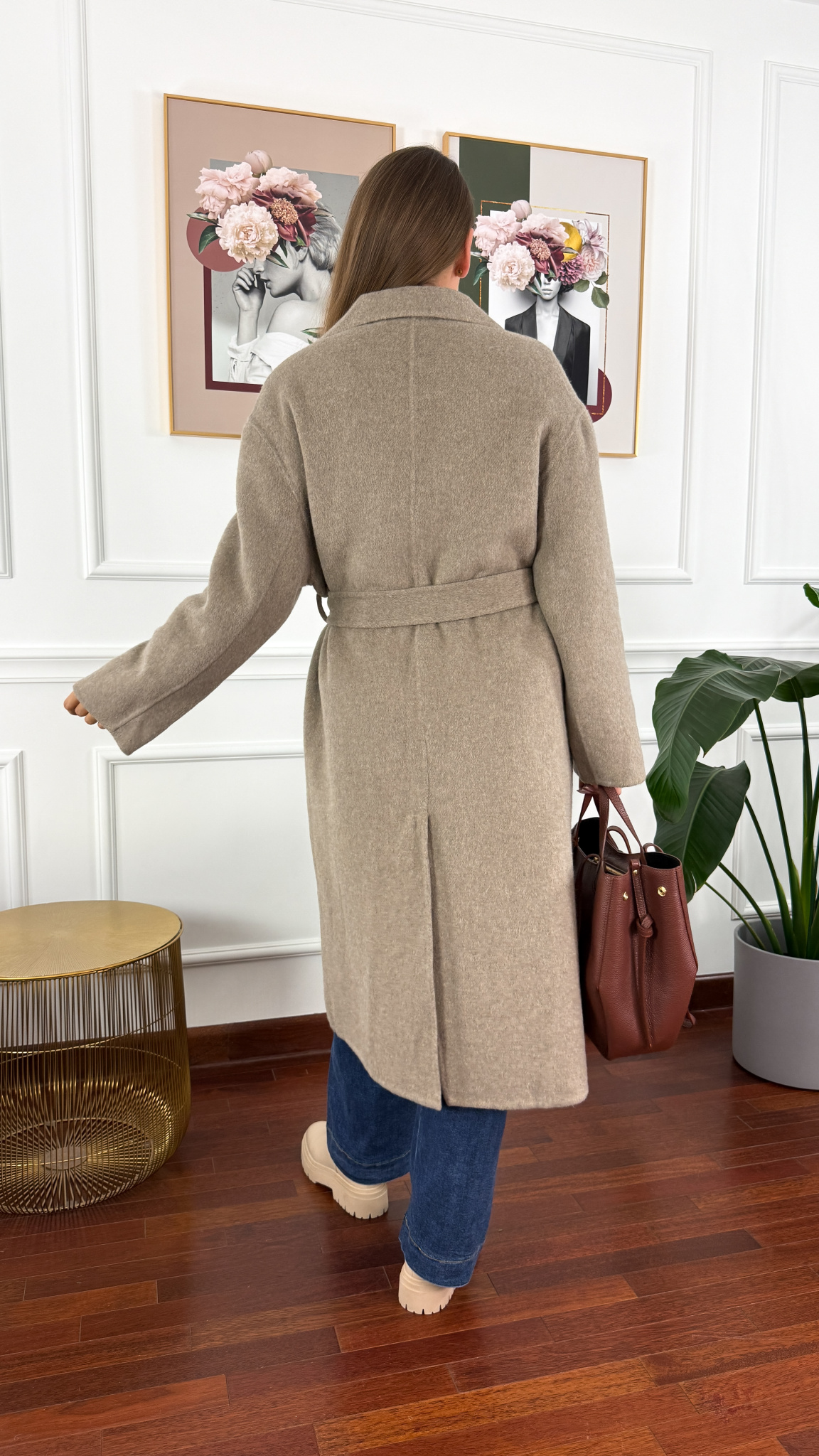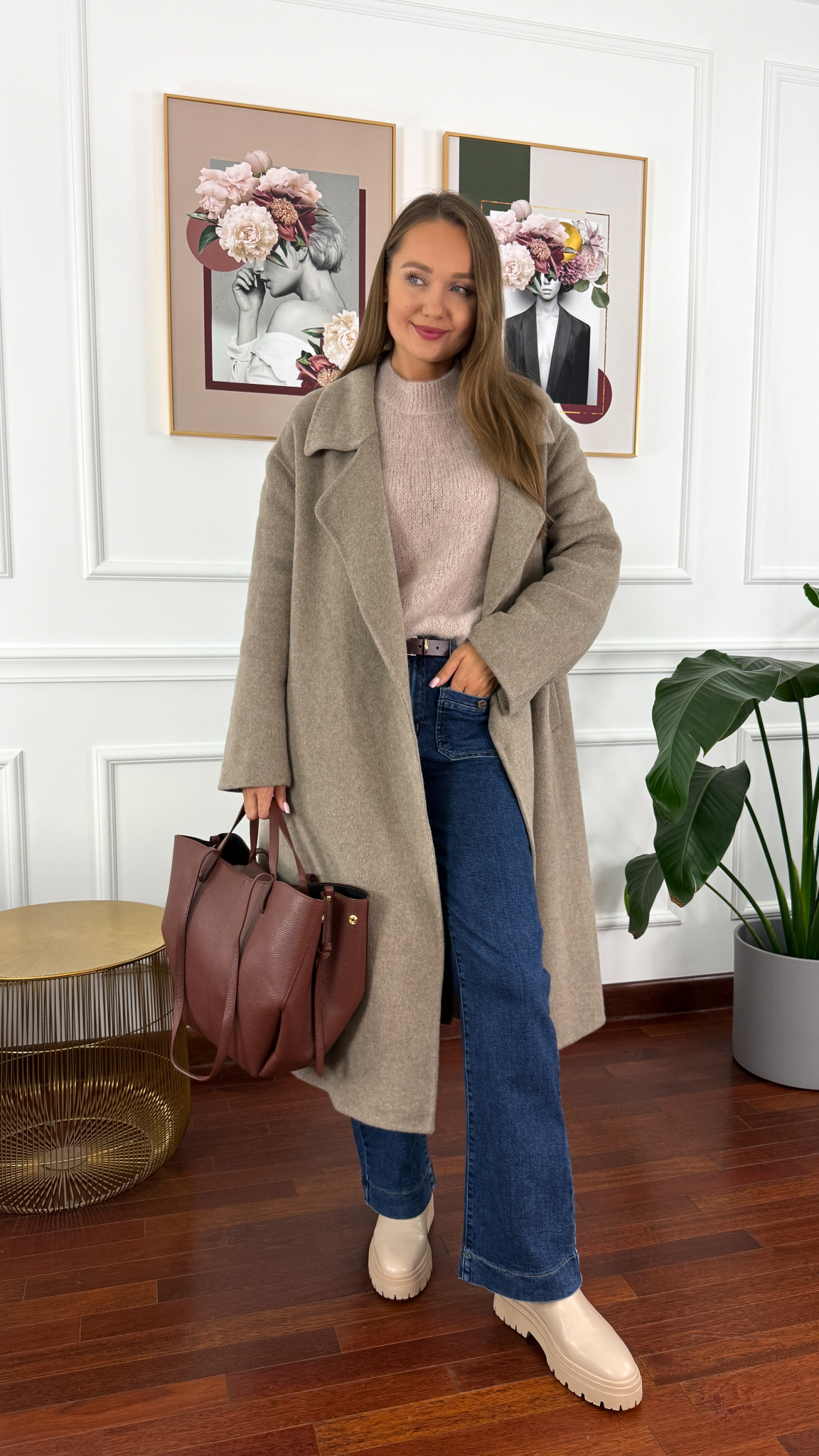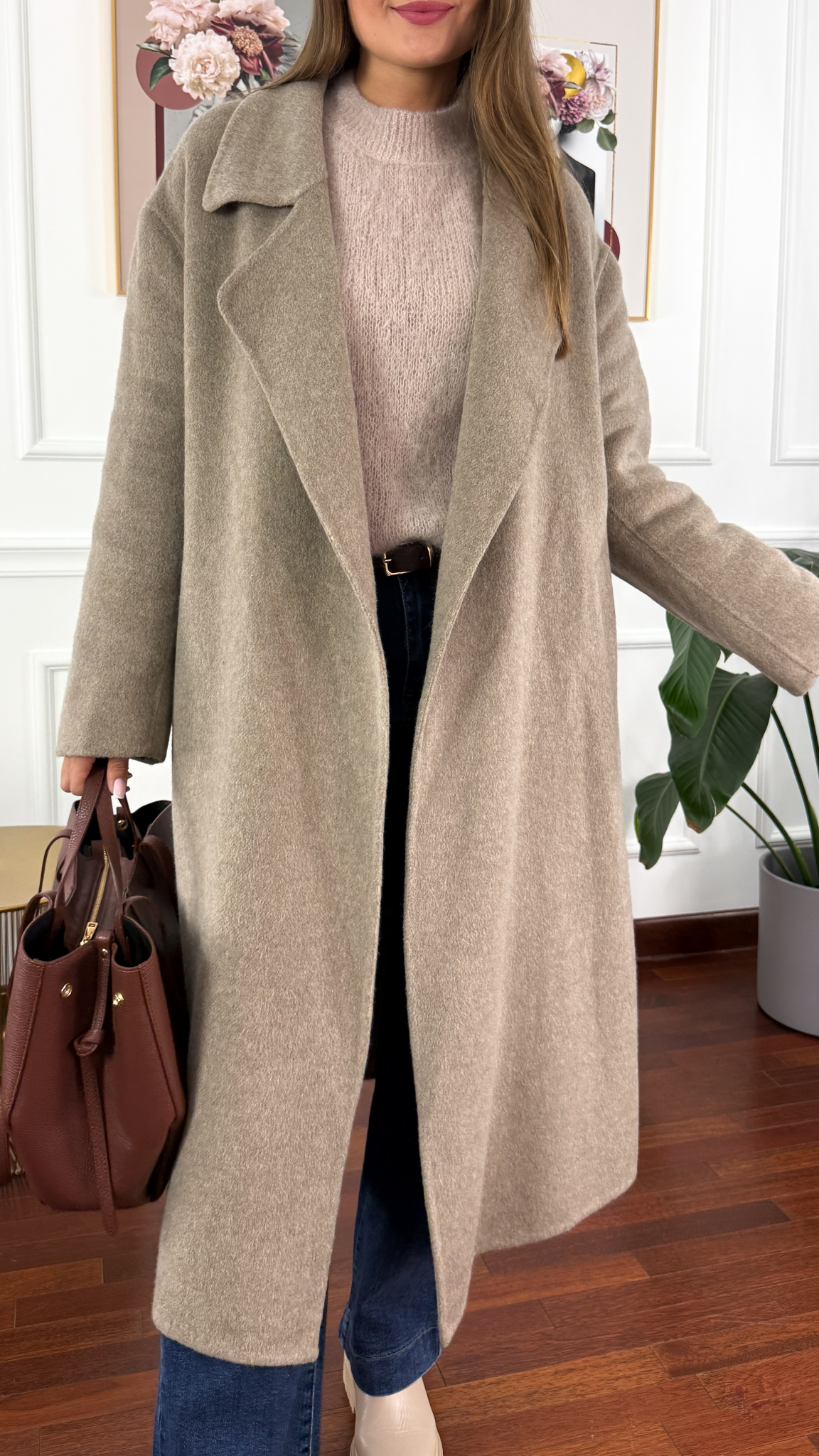 Długi płaszcz zawiązywany w pasie. Posiada praktyczne kieszonki. Rękaw jest prosty z możliwością jego podwinięcia. Nie posiada podszewki.