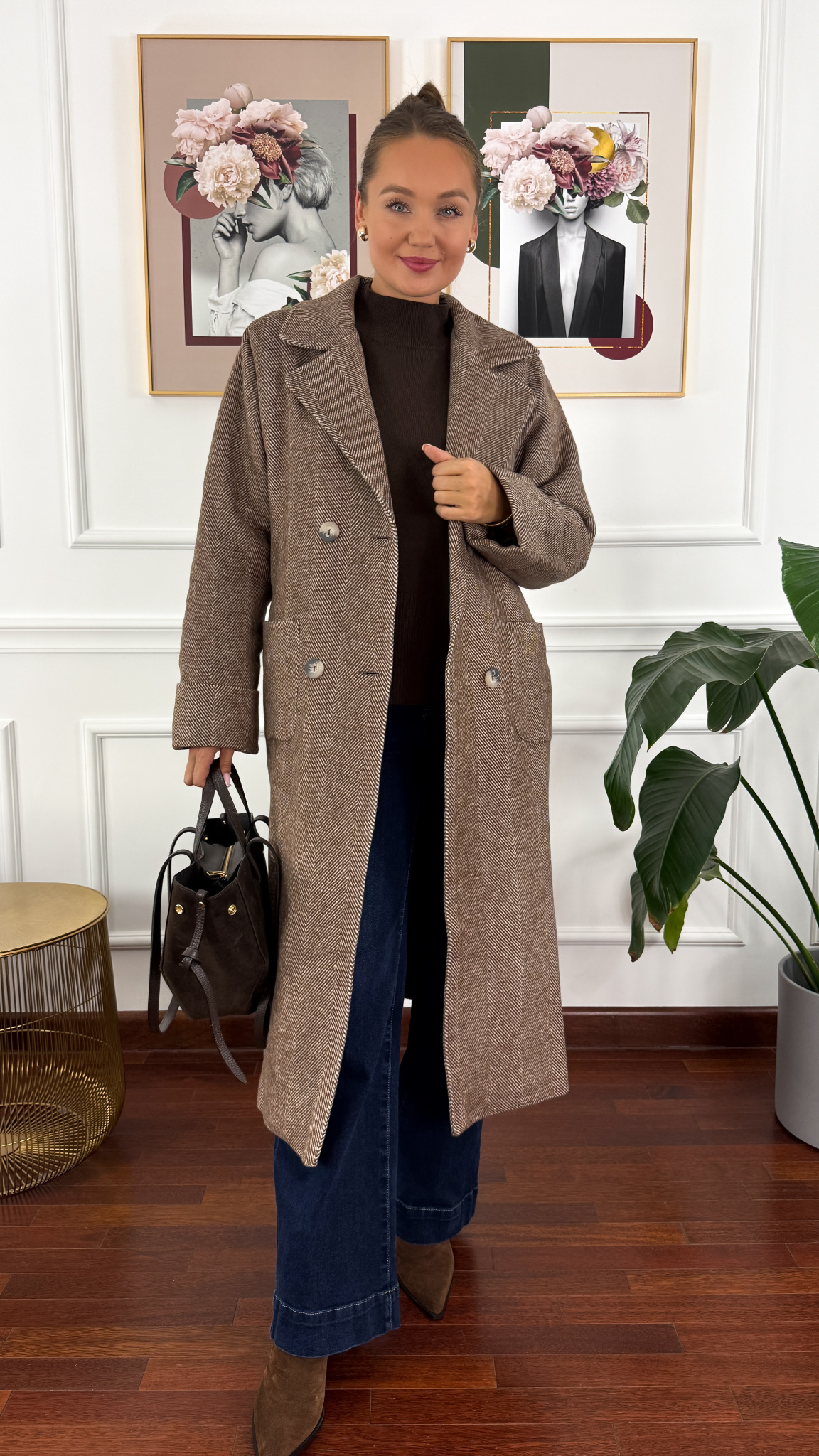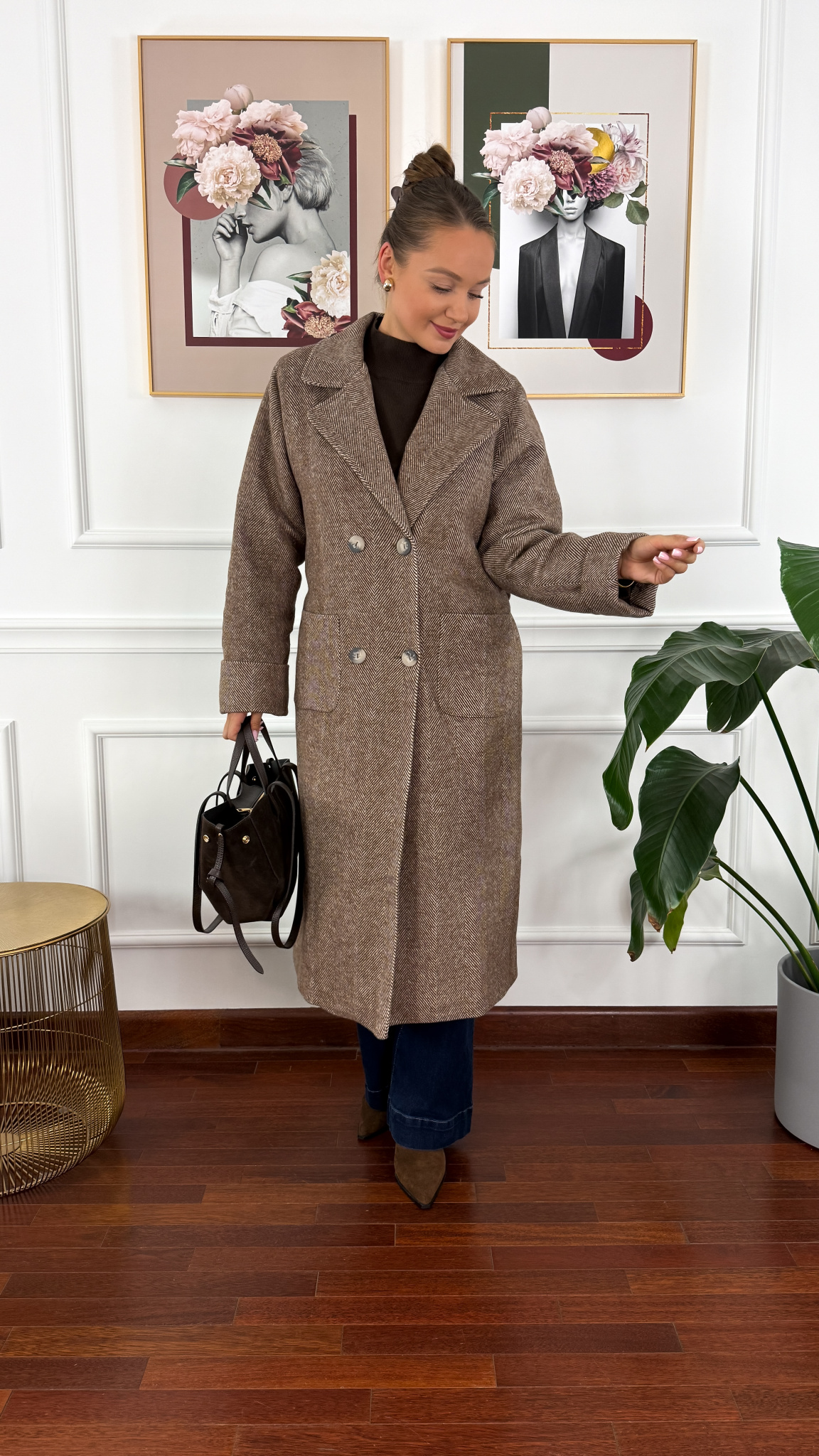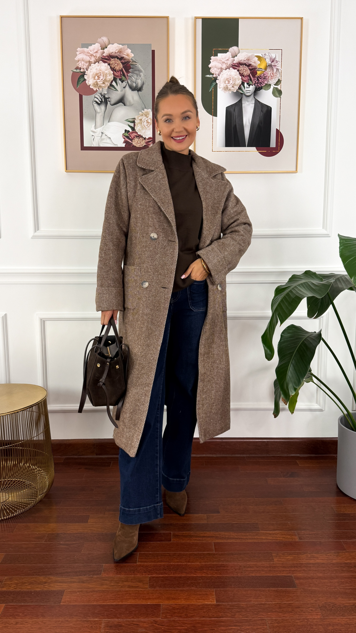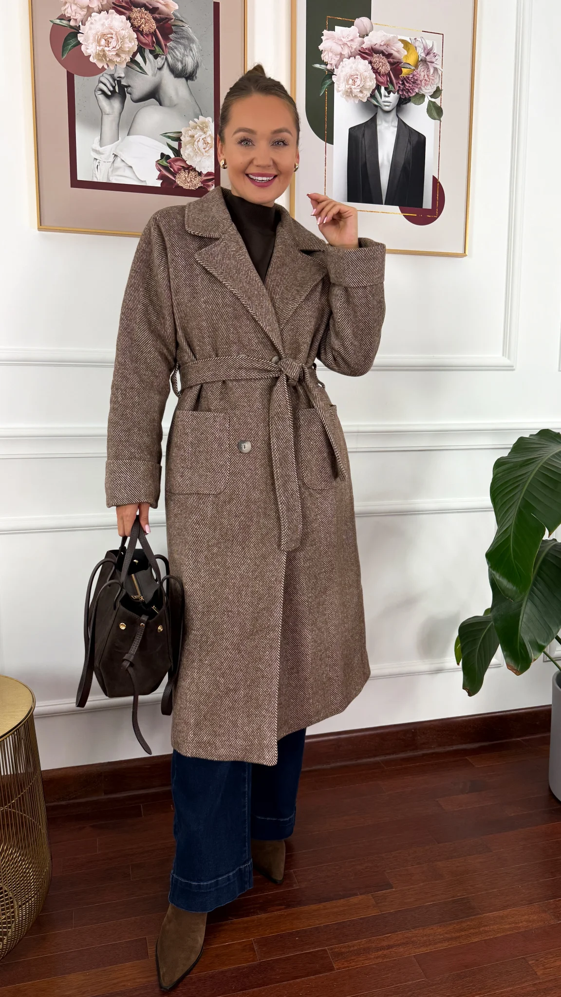 Model sprawdzi się na sylwetkę od S do L. Płaszcz jest zapinany na jeden guziki oraz posiada praktyczne kieszonki. Rękaw jest lekko bufiasty na dole. Podszewka ocieplona watoliną.