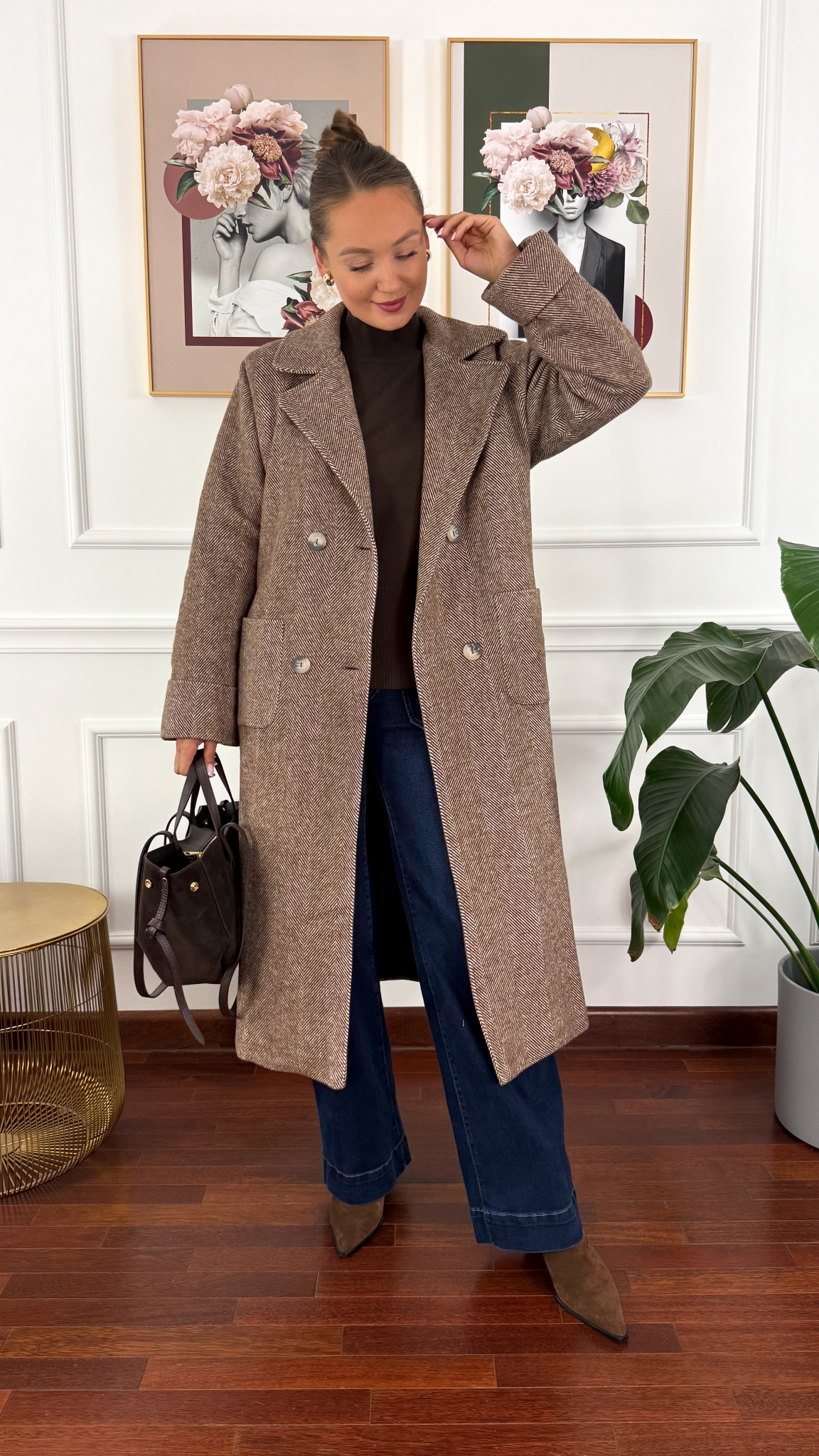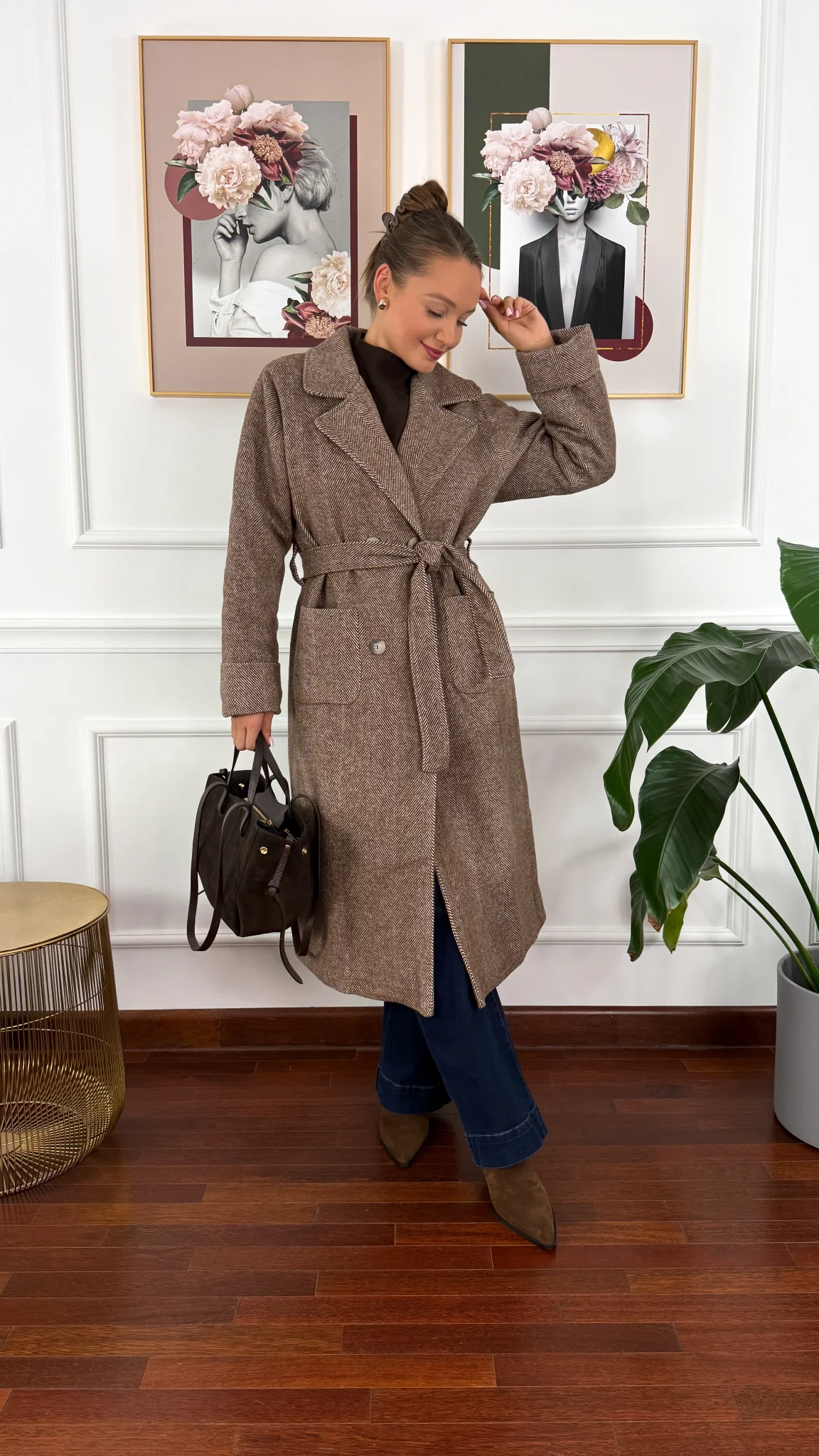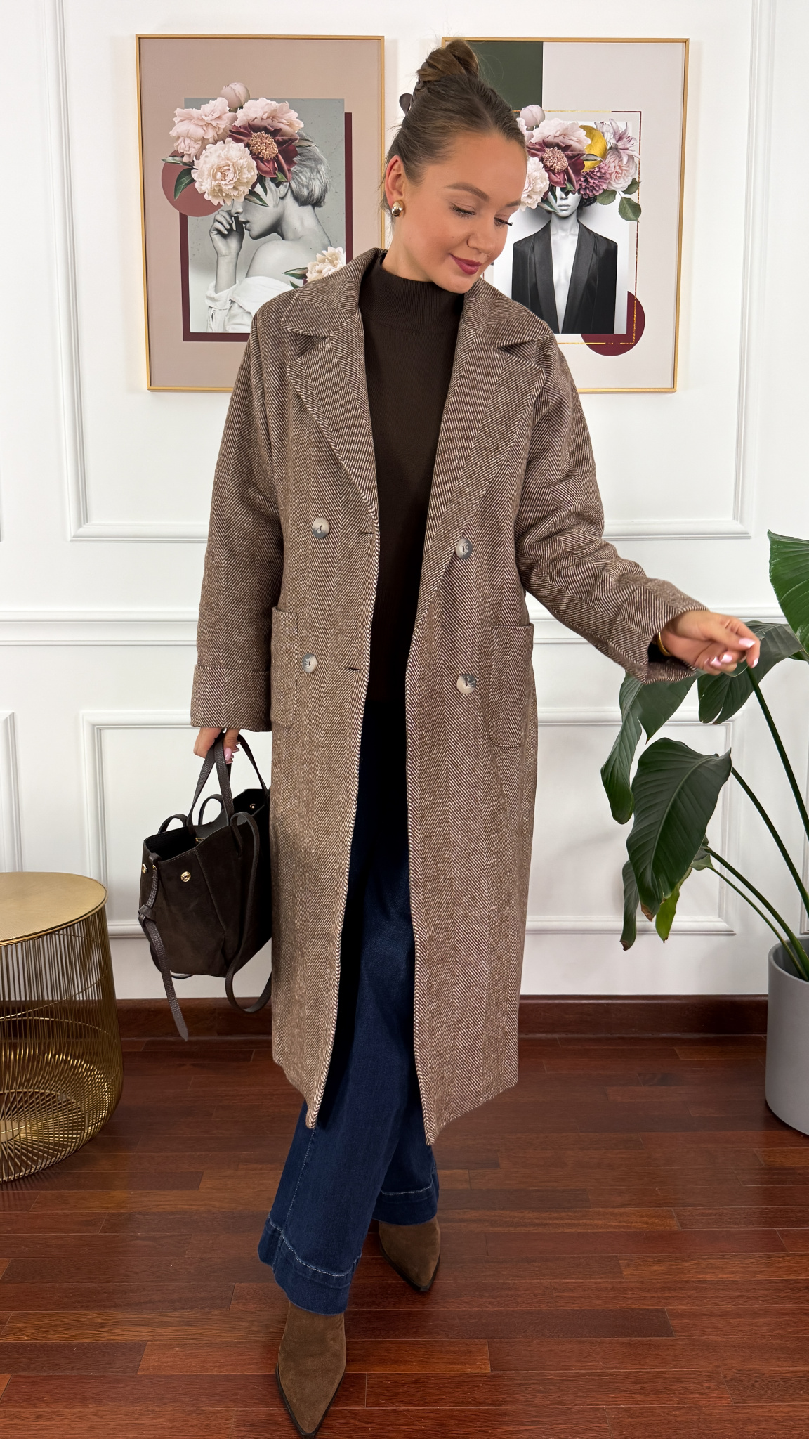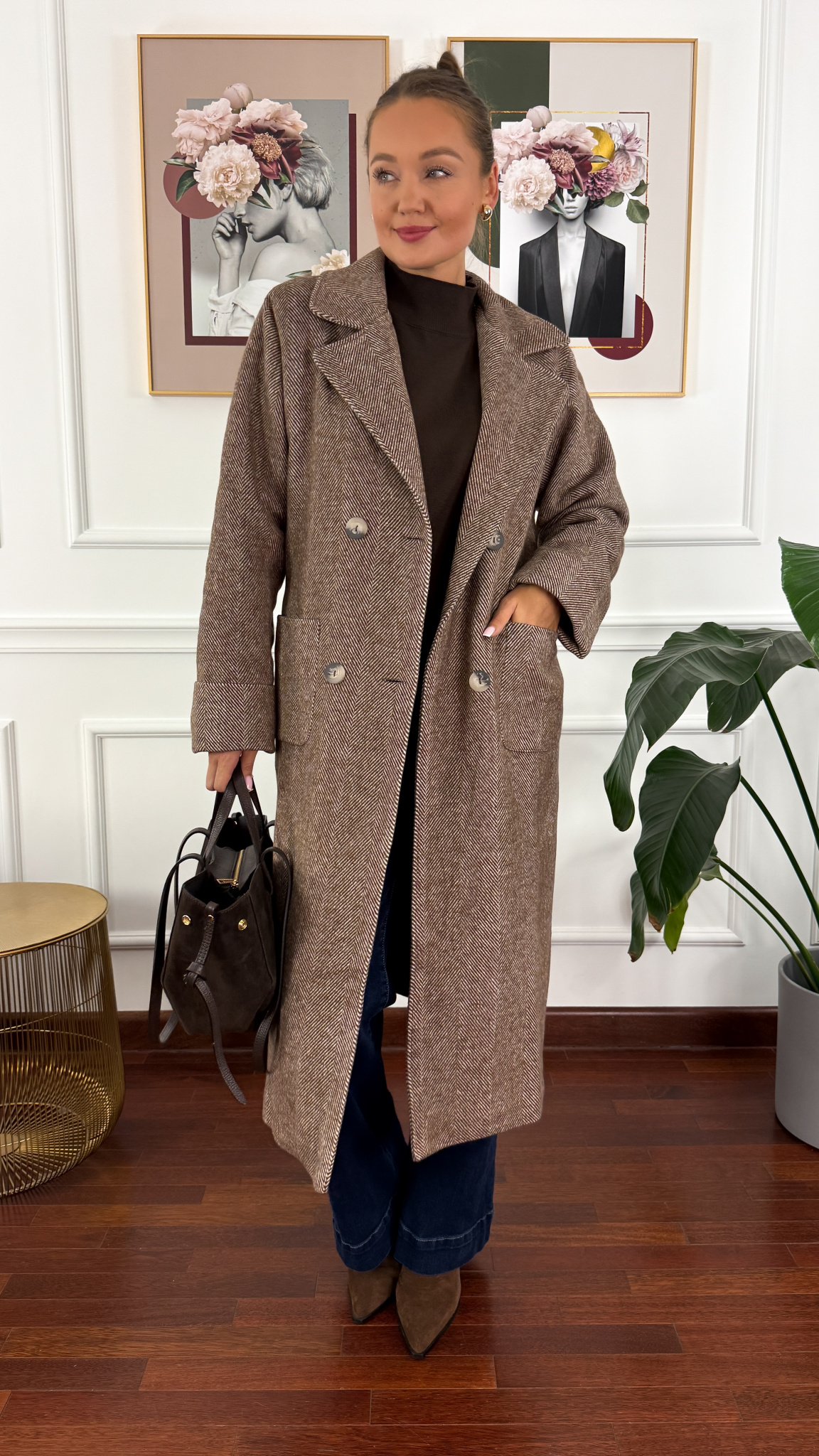 Model sprawdzi się na sylwetkę od S do L. Płaszcz jest zapinany na jeden guziki oraz posiada praktyczne kieszonki. Rękaw jest lekko bufiasty na dole. Podszewka ocieplona watoliną.