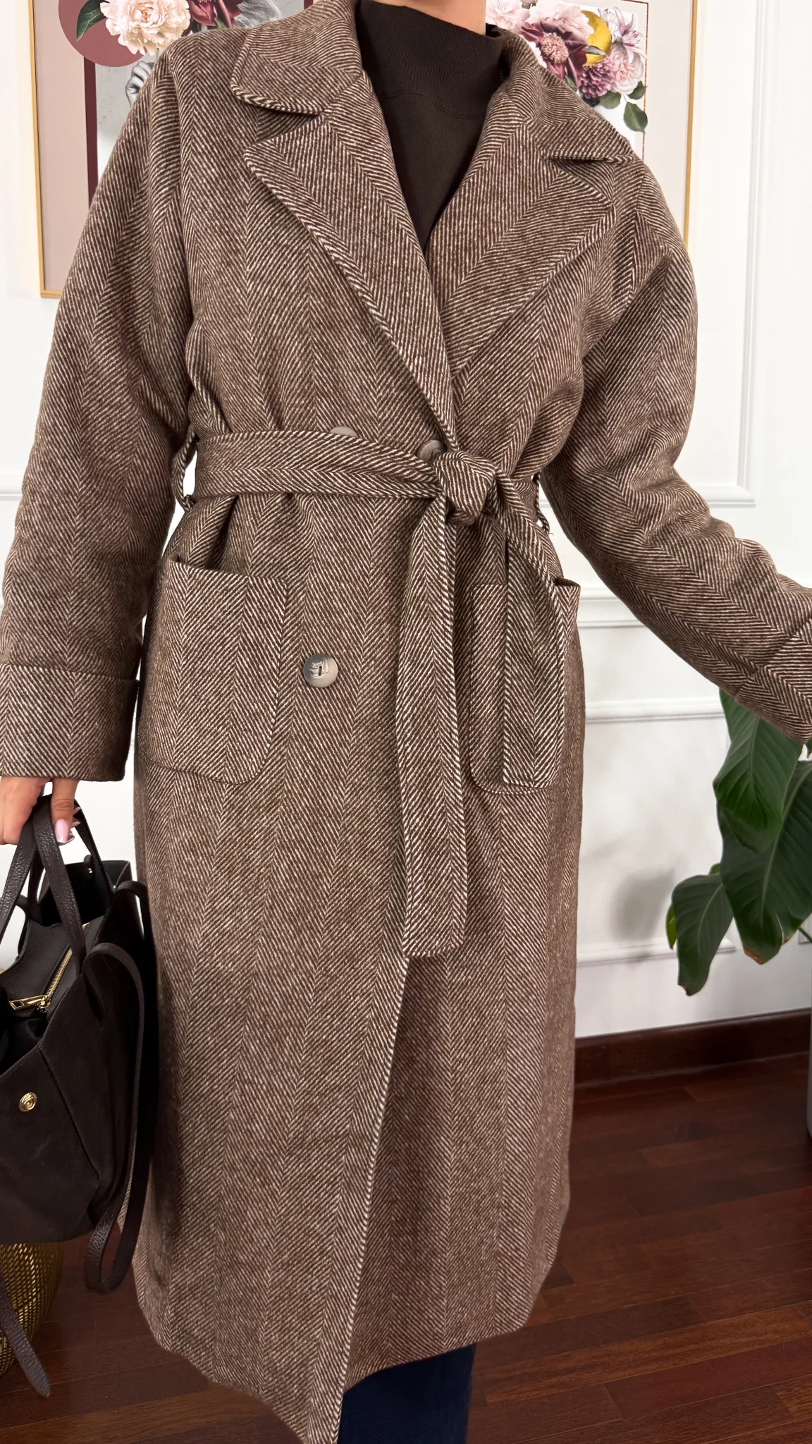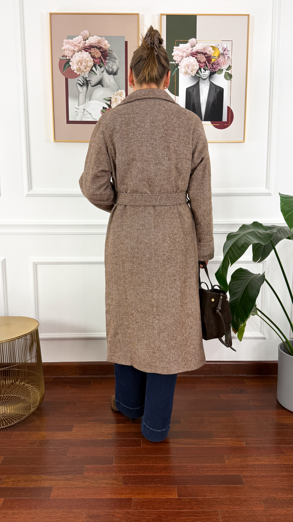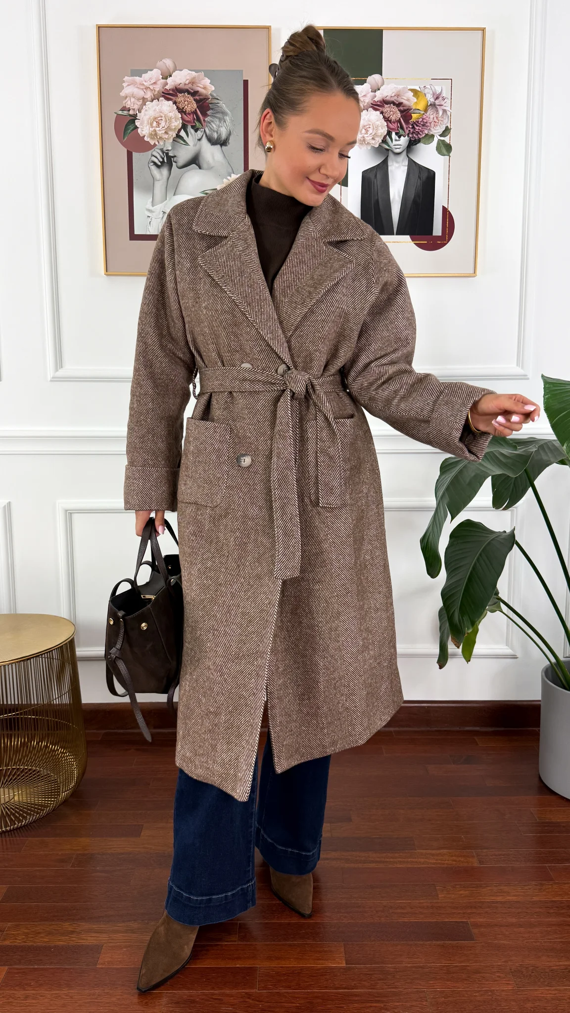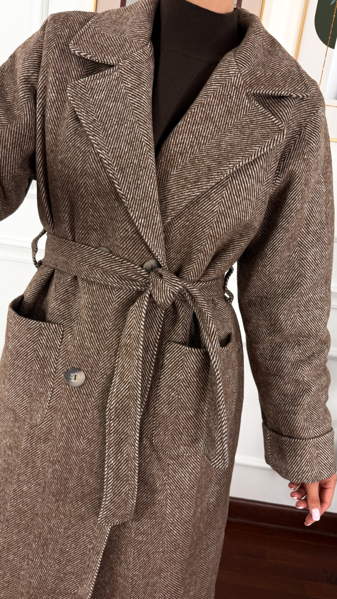 Model sprawdzi się na sylwetkę od S do L. Płaszcz jest zapinany na jeden guziki oraz posiada praktyczne kieszonki. Rękaw jest lekko bufiasty na dole. Podszewka ocieplona watoliną.