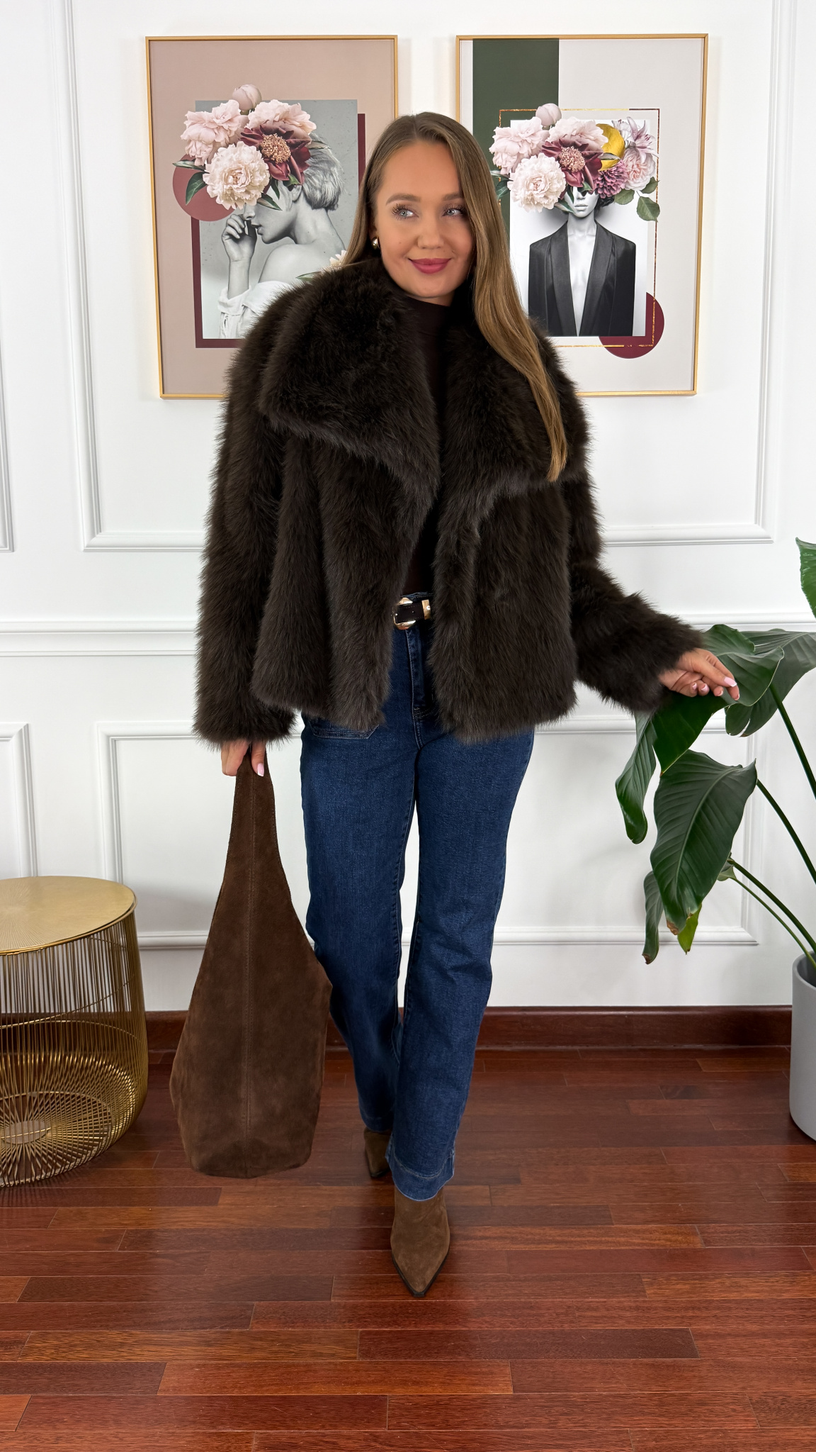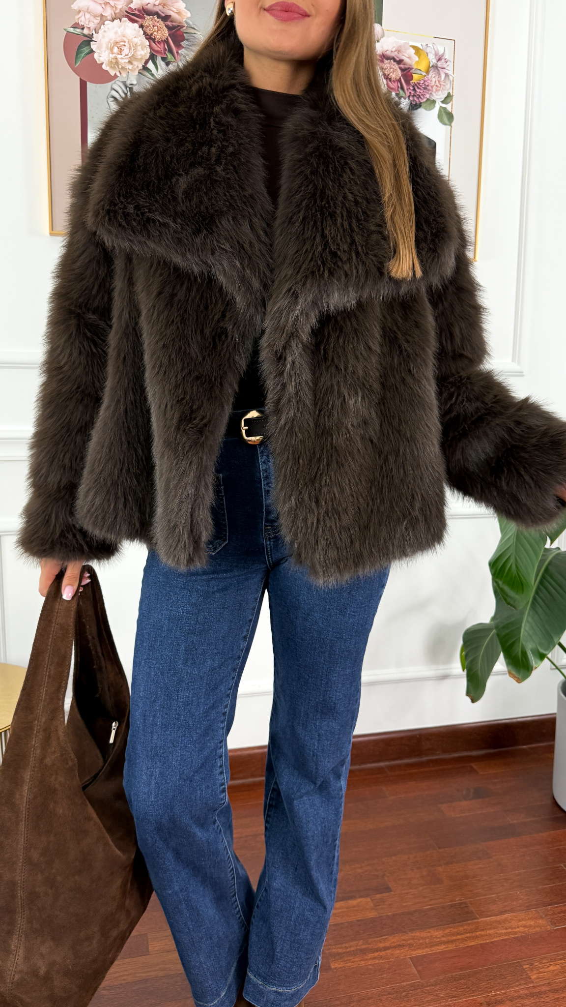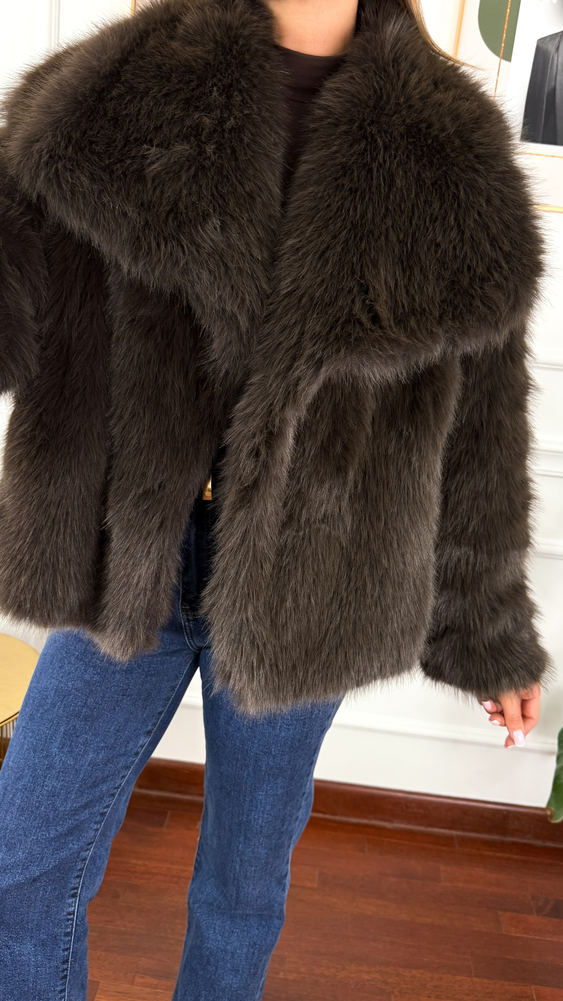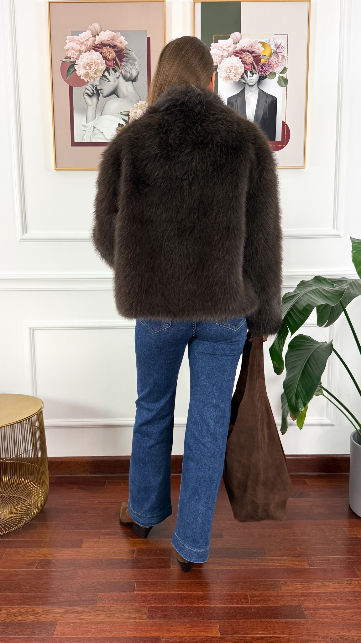 Czekoladowe futerko zapinane na zatrzaski. Posiada praktyczne kieszonki. Rękaw jest prosty z możliwością jego podwinięcia.