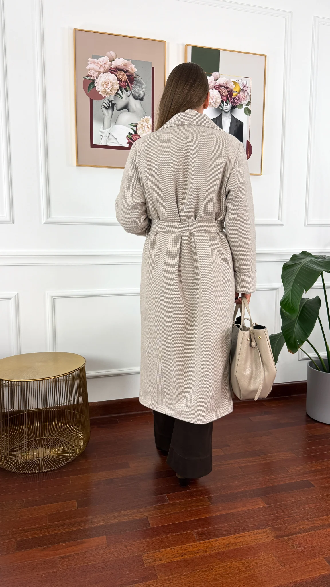 Płaszcz jest zapinany na jeden guziki oraz posiada praktyczne kieszonki. Rękaw jest lekko bufiasty na dole. Podszewka ocieplona watoliną.
