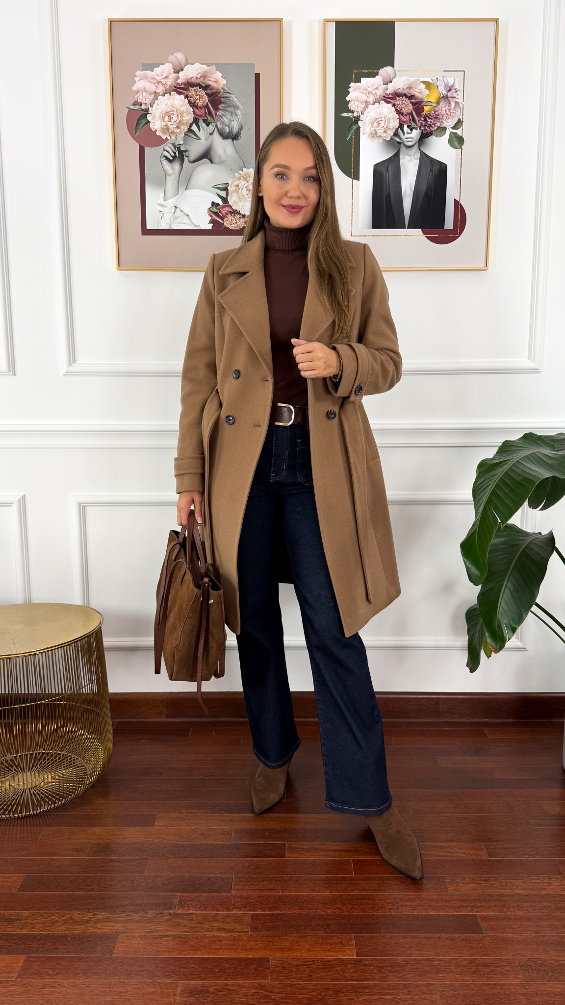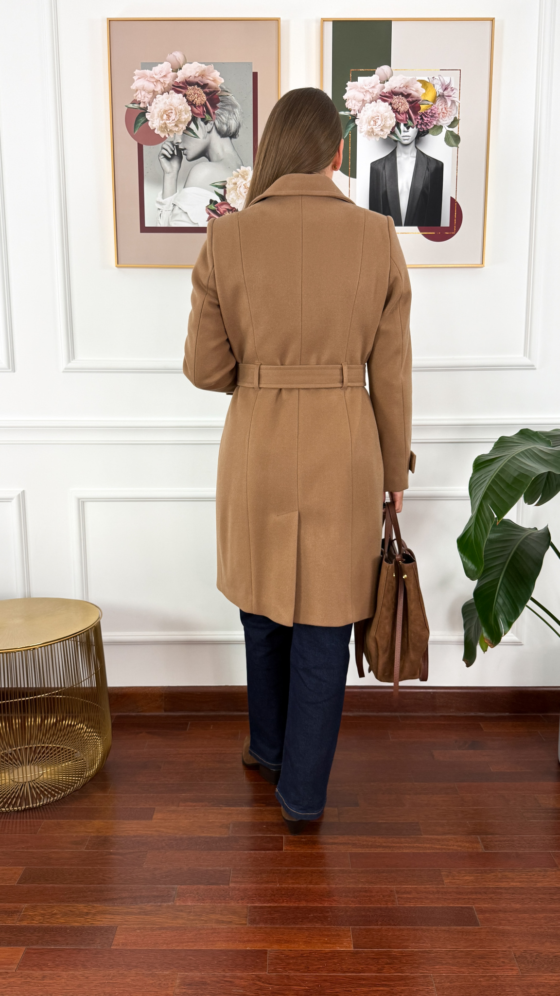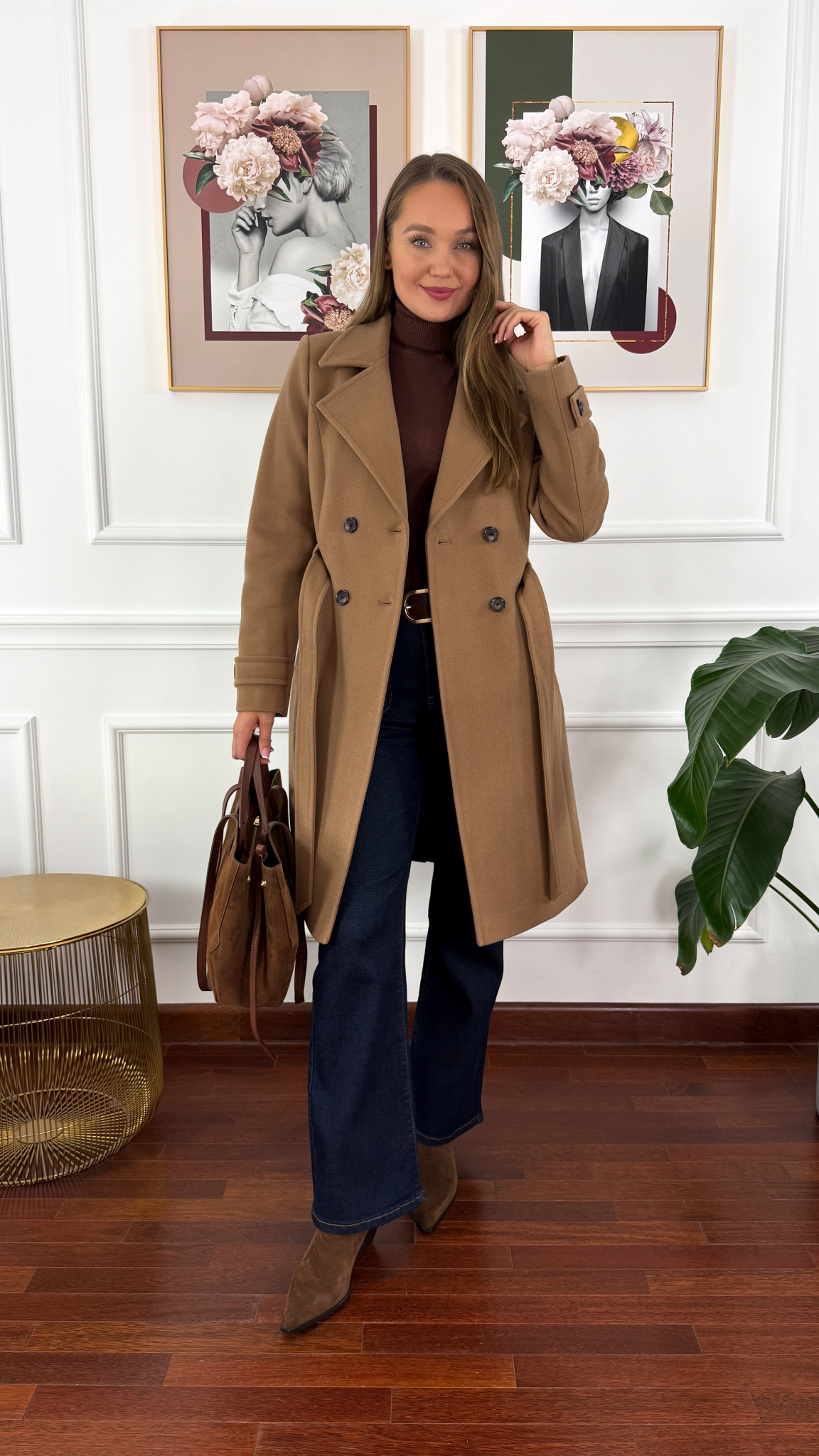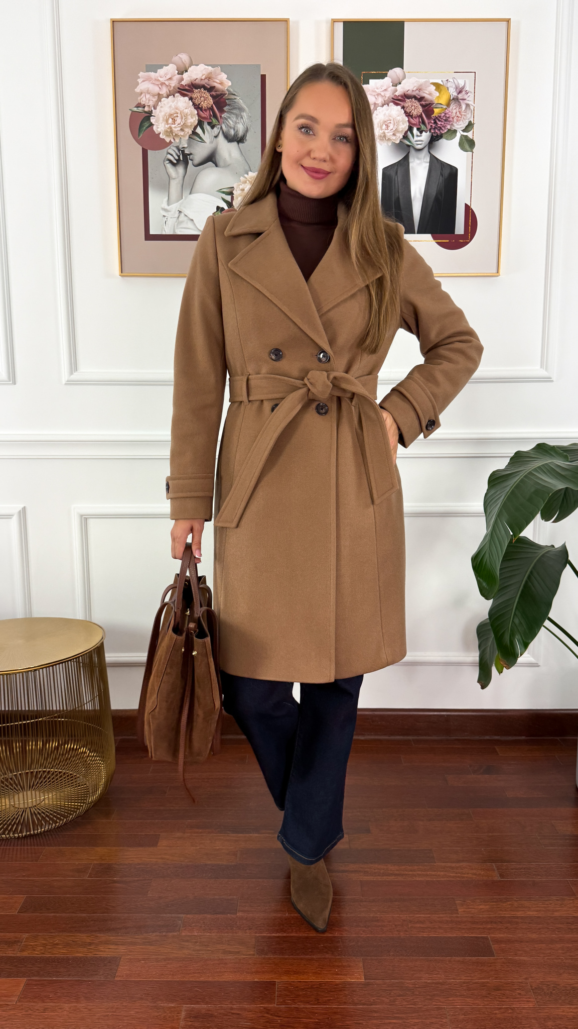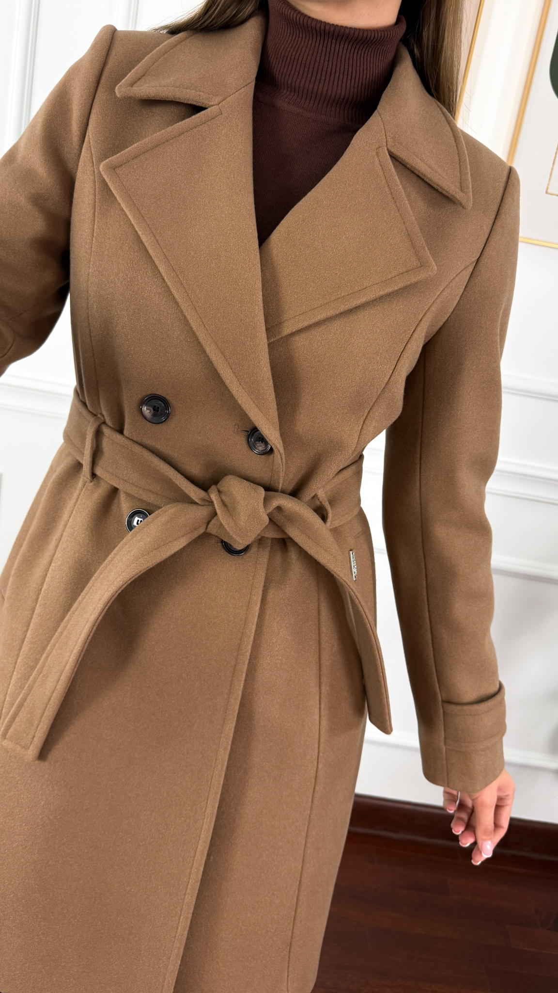 Wełniany płaszcz zapinany na dwa guziki i pasek. Delikatnie taliowany. Posiada praktyczne kieszonki. Rękaw jest prosty. Na ramionach występują pagony.