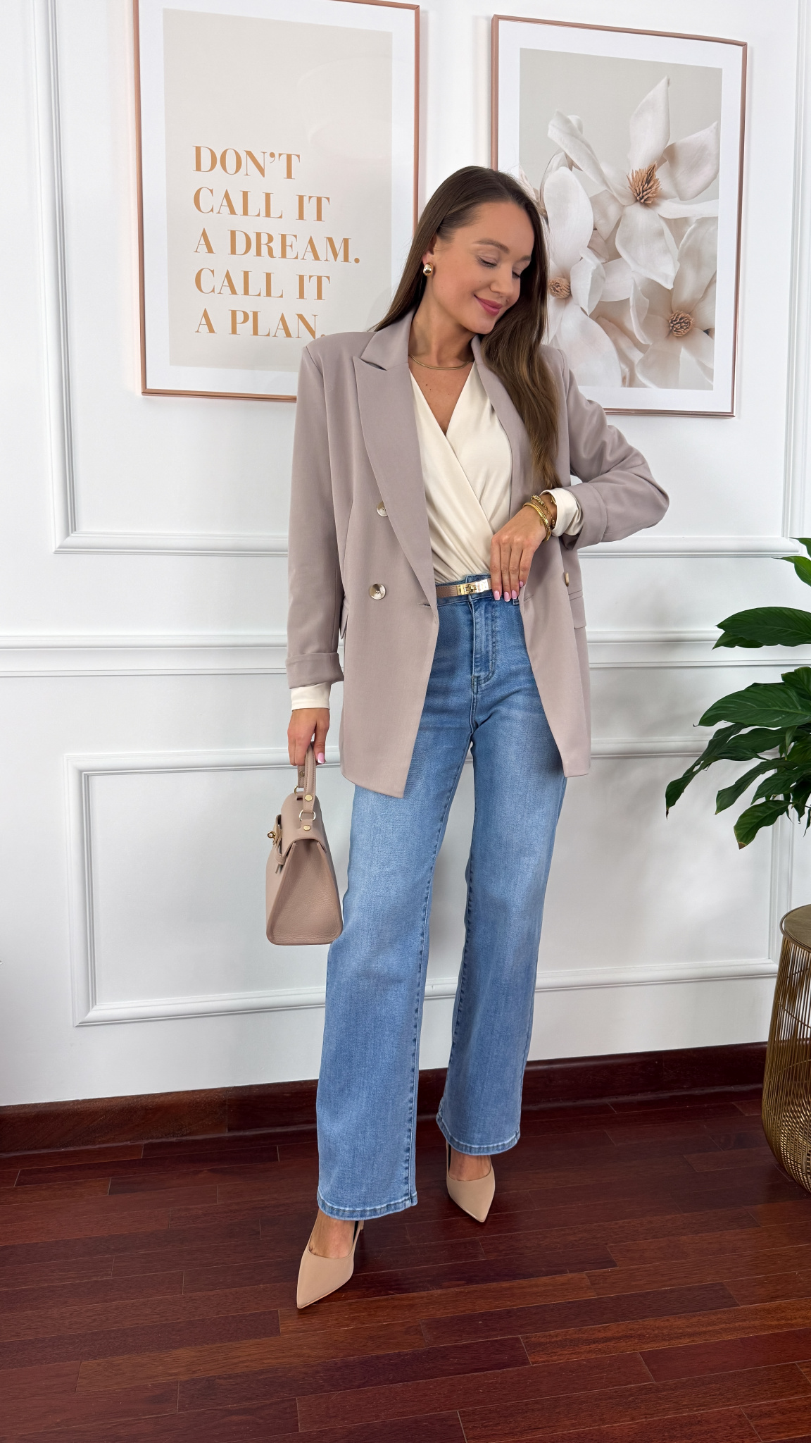 Dłuższa dwurzędowa marynarka. Delikatnie luźniejszy fason, który idealnie sprawdzi się do codziennych stylizacji. Posiada praktyczne kieszonki. Na ramionach wszyte są poduszki.