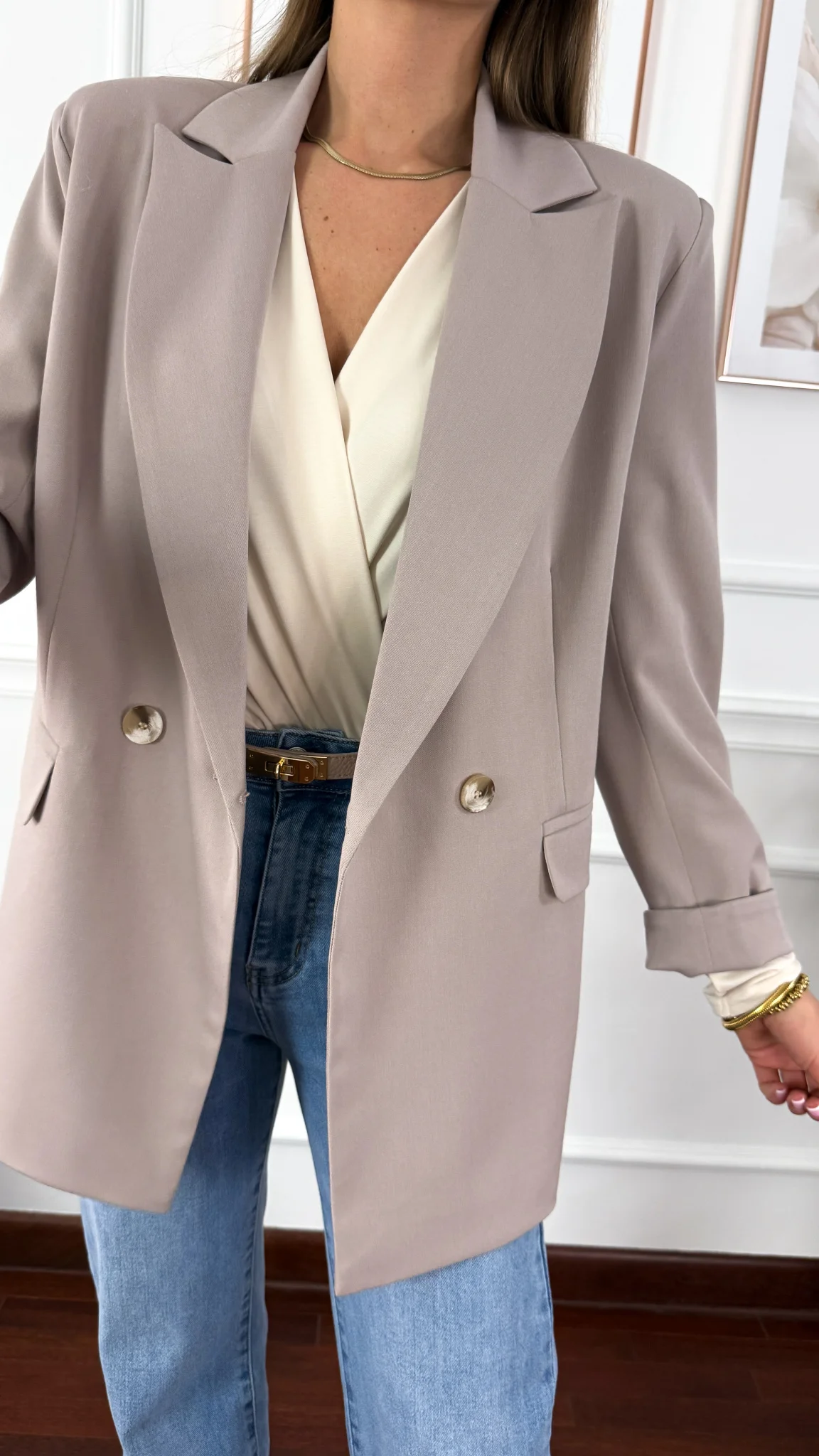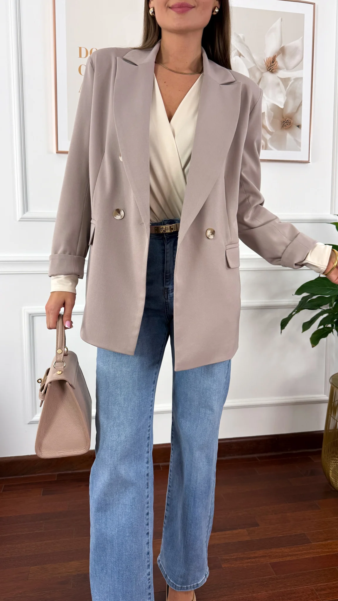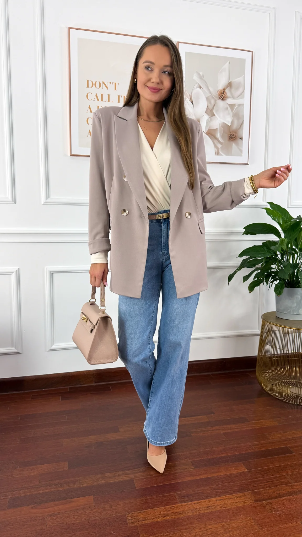 Dłuższa dwurzędowa marynarka. Delikatnie luźniejszy fason, który idealnie sprawdzi się do codziennych stylizacji. Posiada praktyczne kieszonki. Na ramionach wszyte są poduszki.
