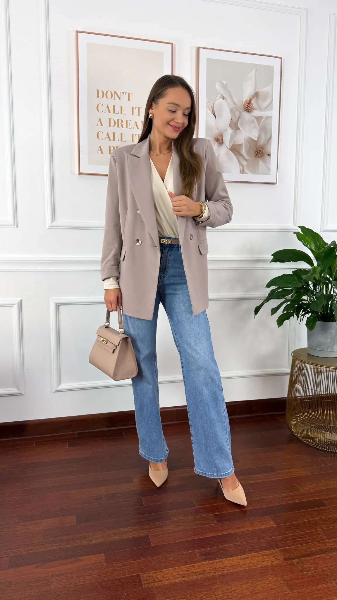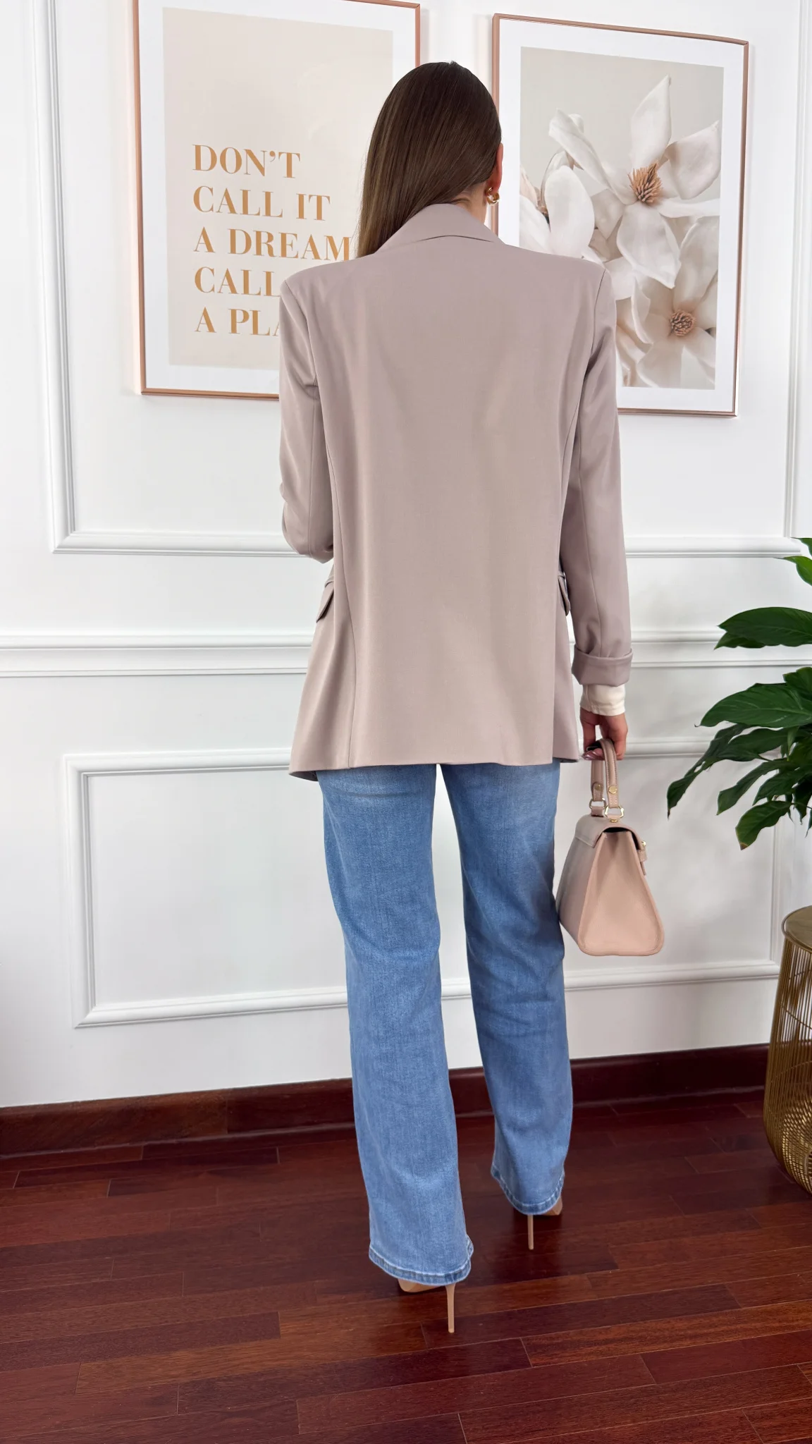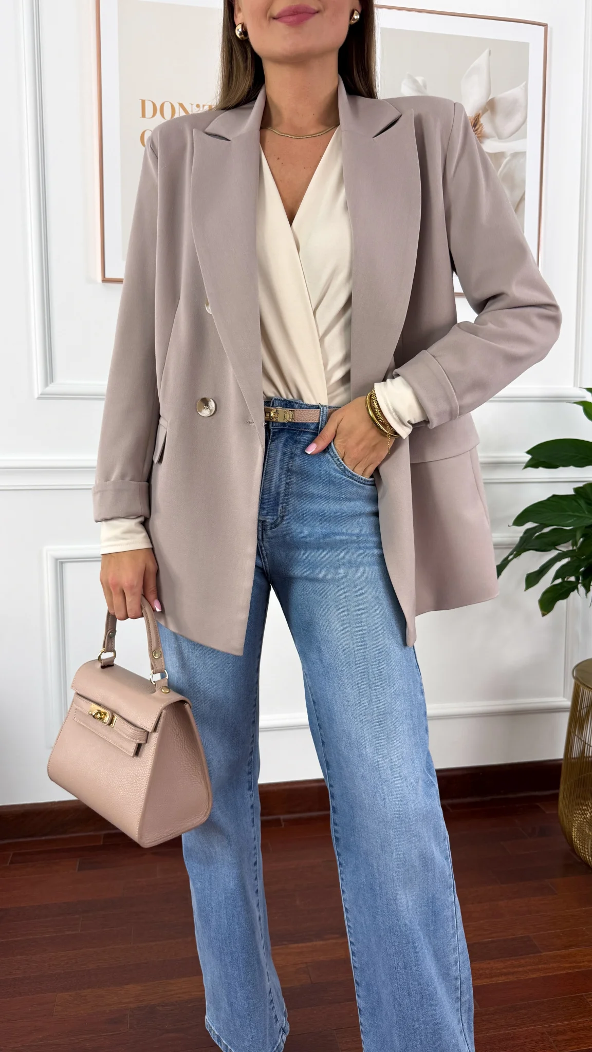 Dłuższa dwurzędowa marynarka. Delikatnie luźniejszy fason, który idealnie sprawdzi się do codziennych stylizacji. Posiada praktyczne kieszonki. Na ramionach wszyte są poduszki.