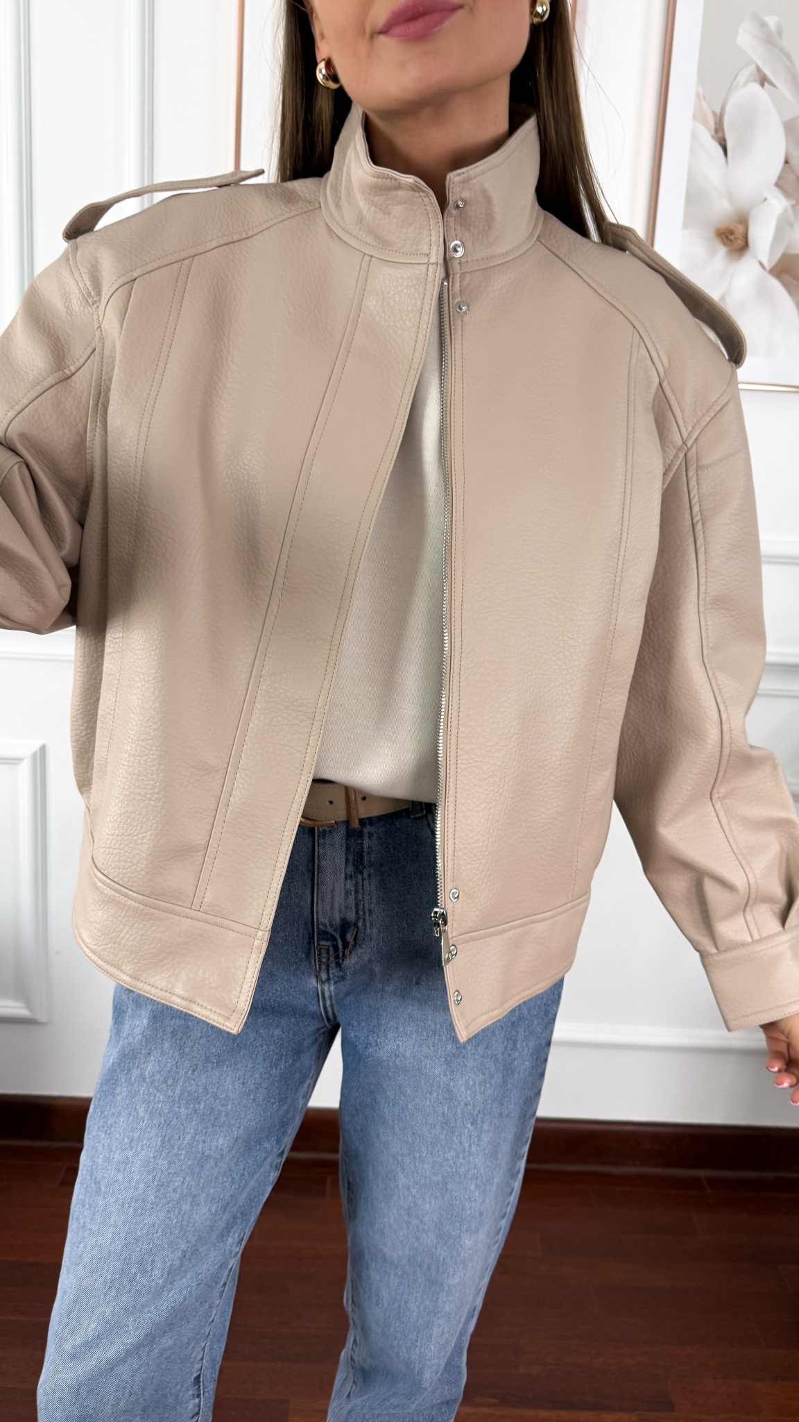 A'la skórzana ramoneska zapinana na zamek. Od przodu posiada praktyczne kieszonki ukryte za dodatkową warstwą materiału. Rękaw zakończony mankietem zapinanym na zatrzask.