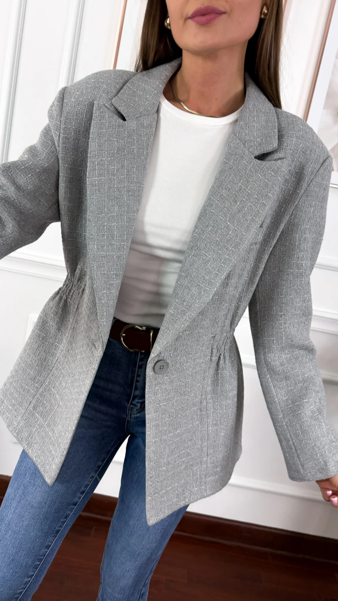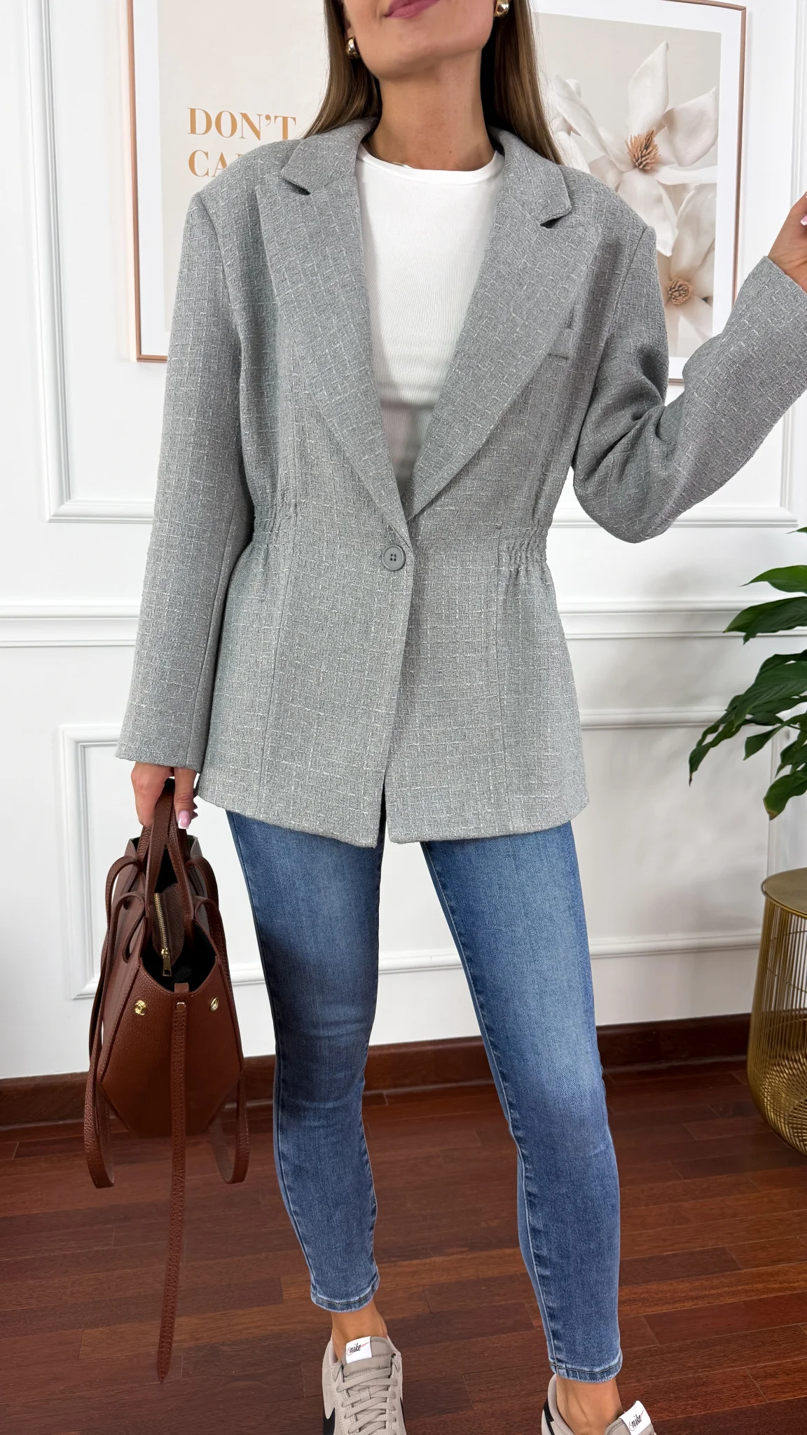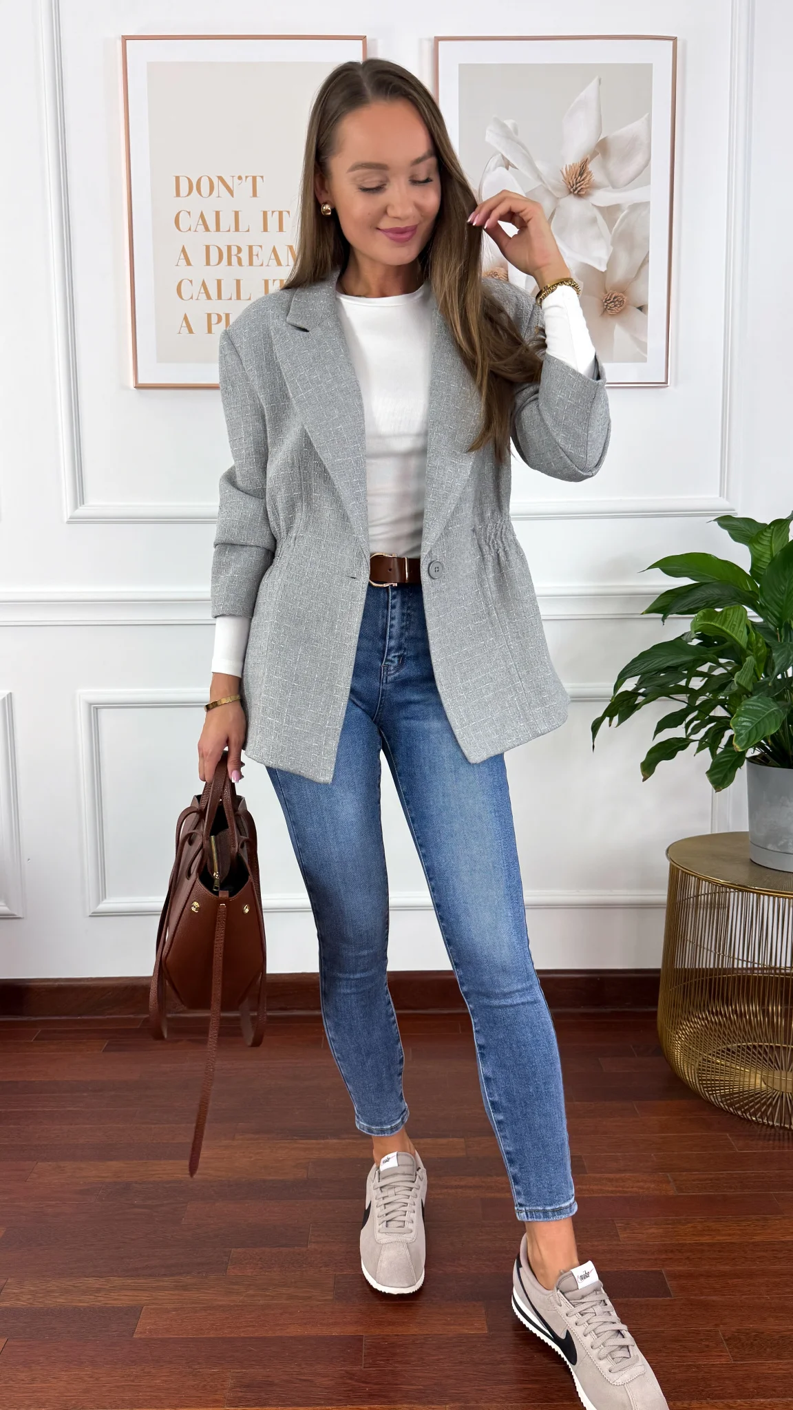 Marynarka taliowana zapinana na jeden guzik. W tali wszyto szerszą gumę. Idealnie sprawdzi się do codziennych stylizacji. Na ramionach wszyte są poduszki.