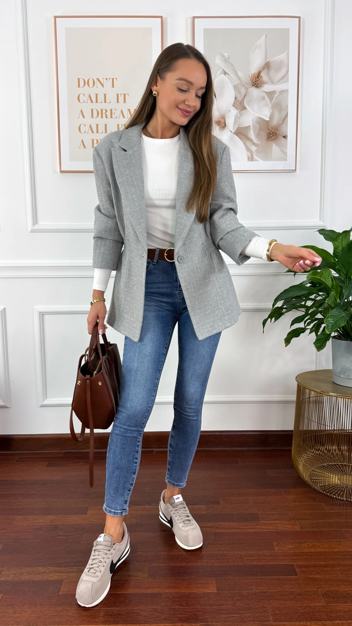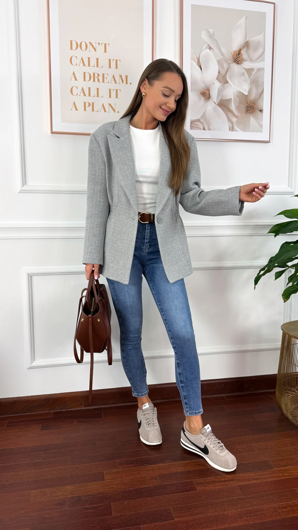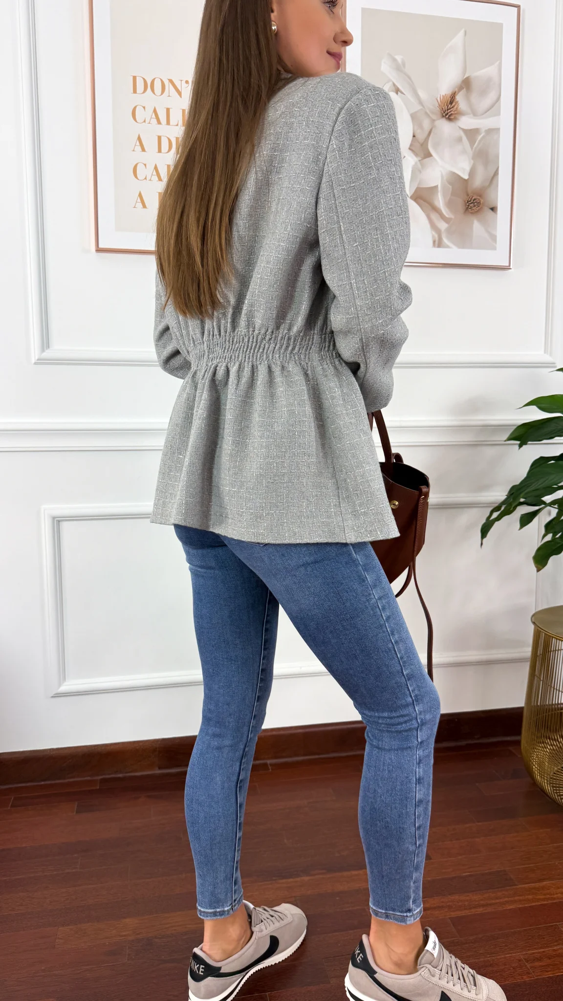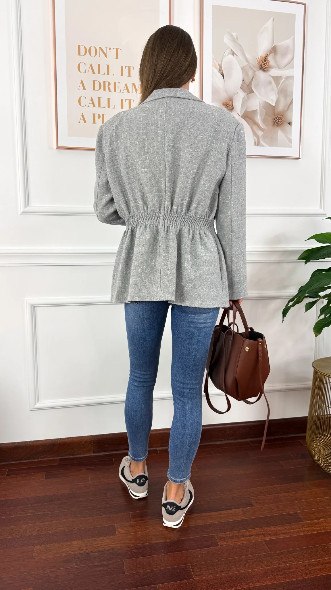 Marynarka taliowana zapinana na jeden guzik. W tali wszyto szerszą gumę. Idealnie sprawdzi się do codziennych stylizacji. Na ramionach wszyte są poduszki.
