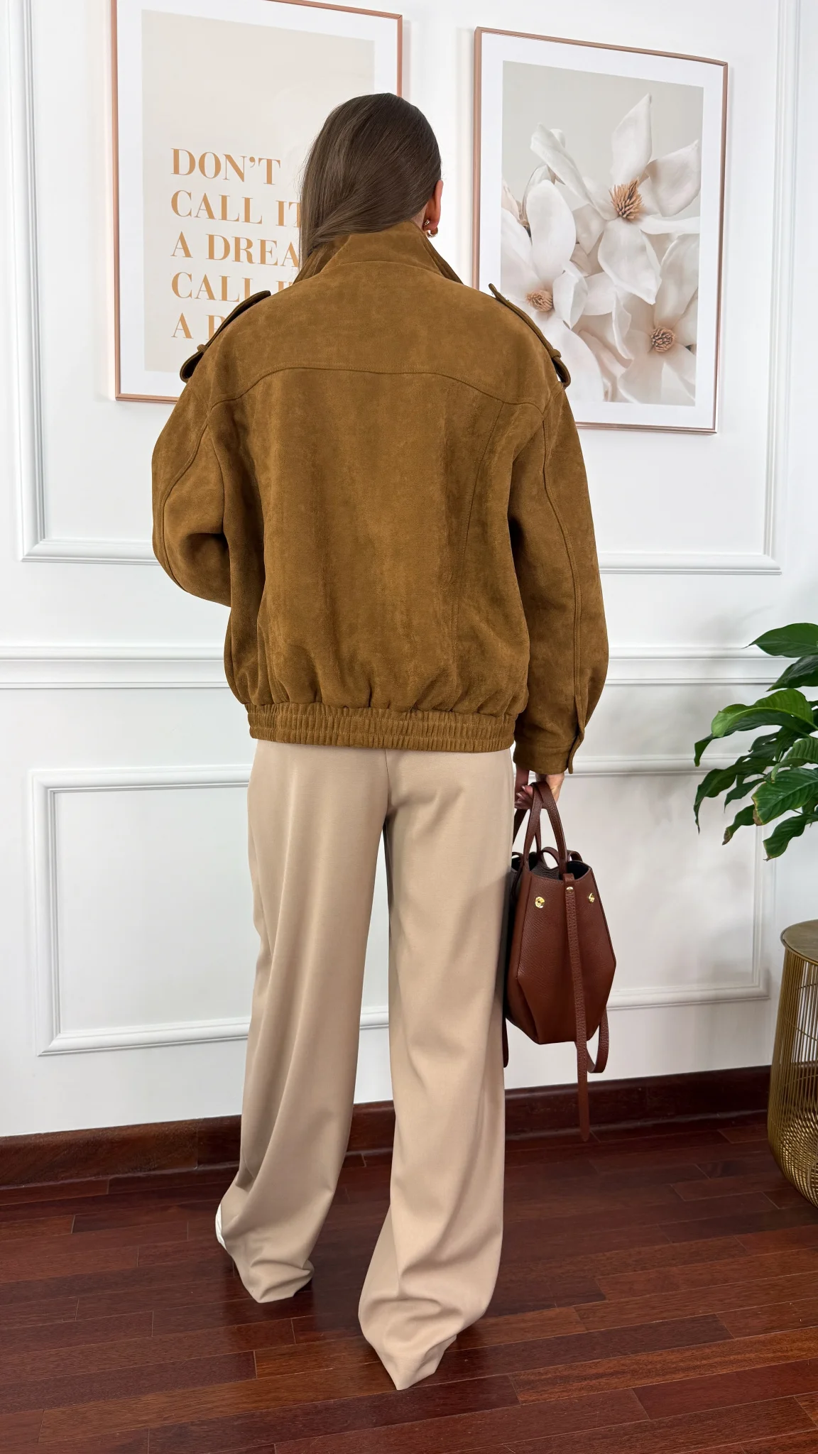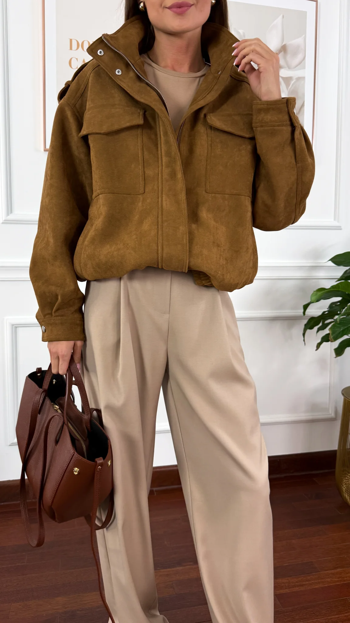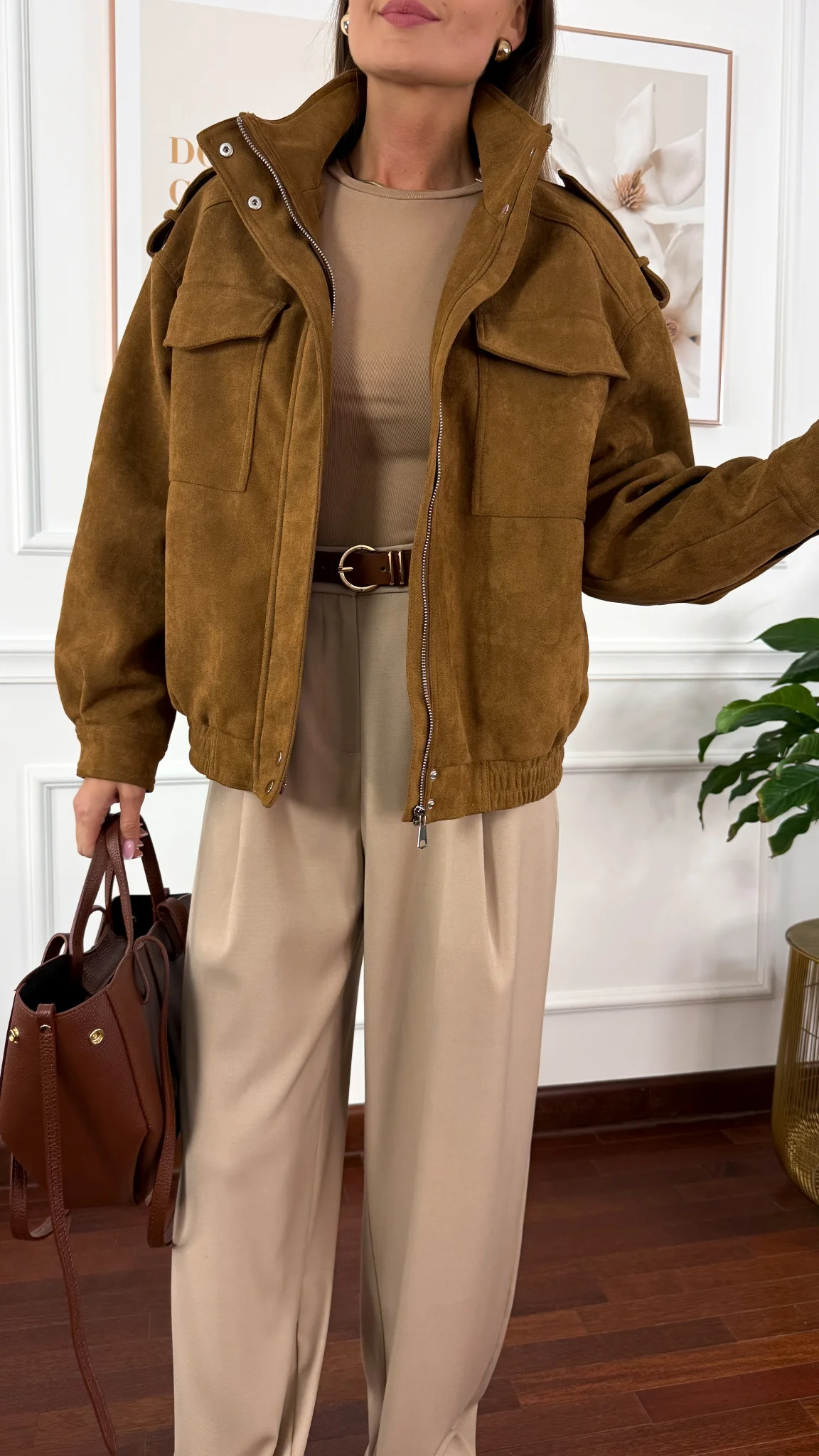 Kurtka ala zamszowa, zapinana na zamek. Posiada ozdobne pagony na ramionach oraz praktyczne kieszenie. W dolnej części zakończona ściągaczem.
