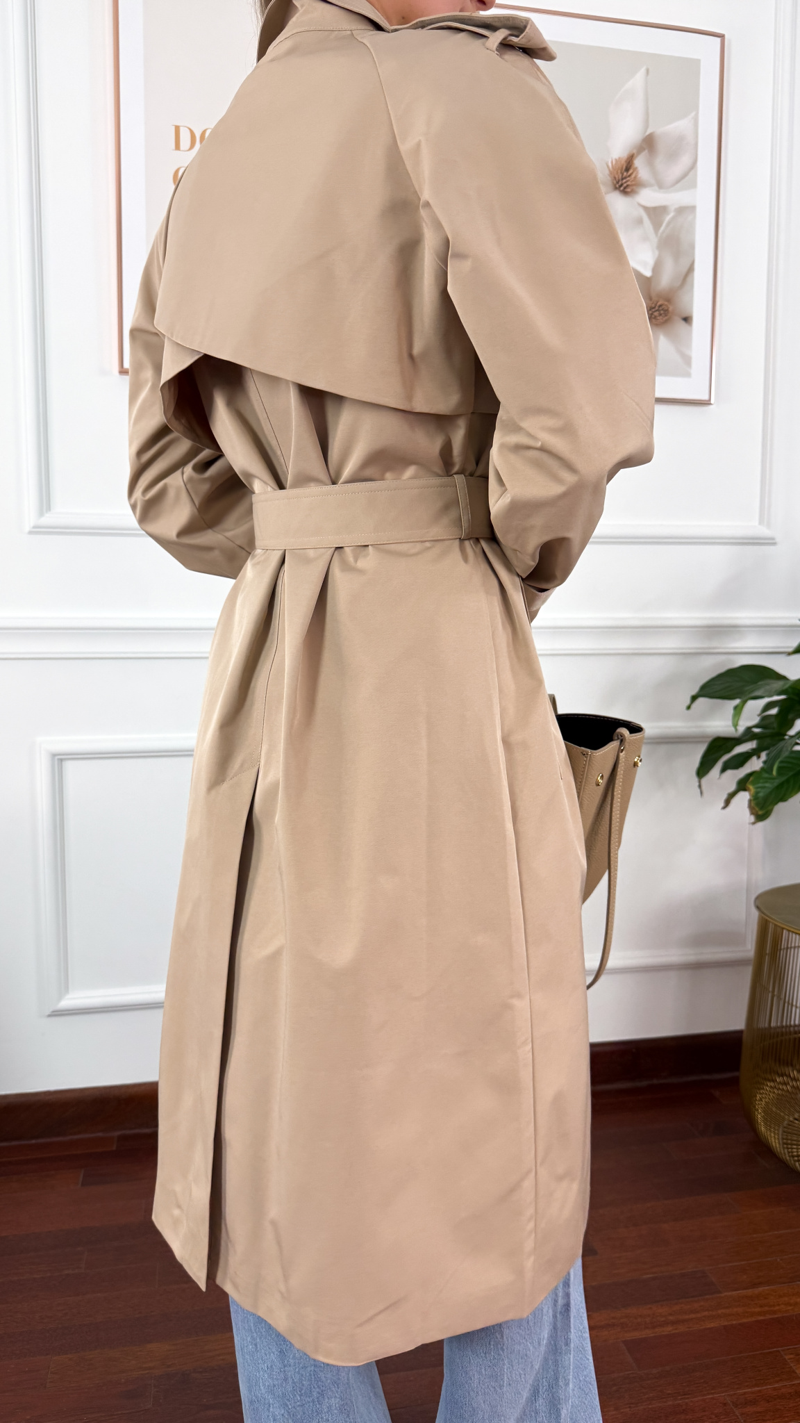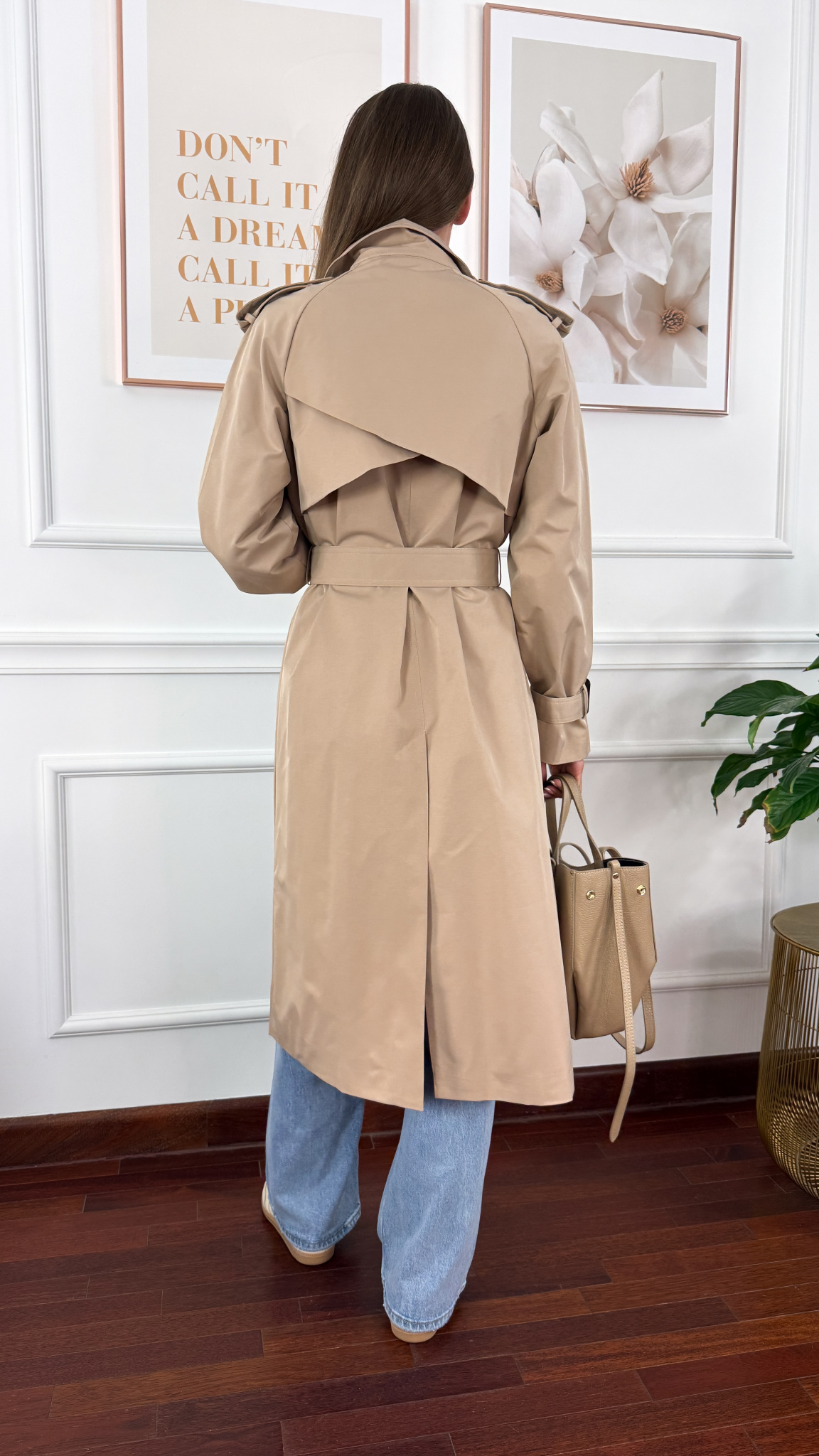 Bawełniany trzyrzędowy długi trencz. Zapiana na trzy guziki oraz wiązany w pasie sznurkiem. Na ramionach występują pagony. Delikatnie luźniejszy fason, który idealnie sprawdzi się do codziennych stylizacji. Posiada praktyczne kieszonki.