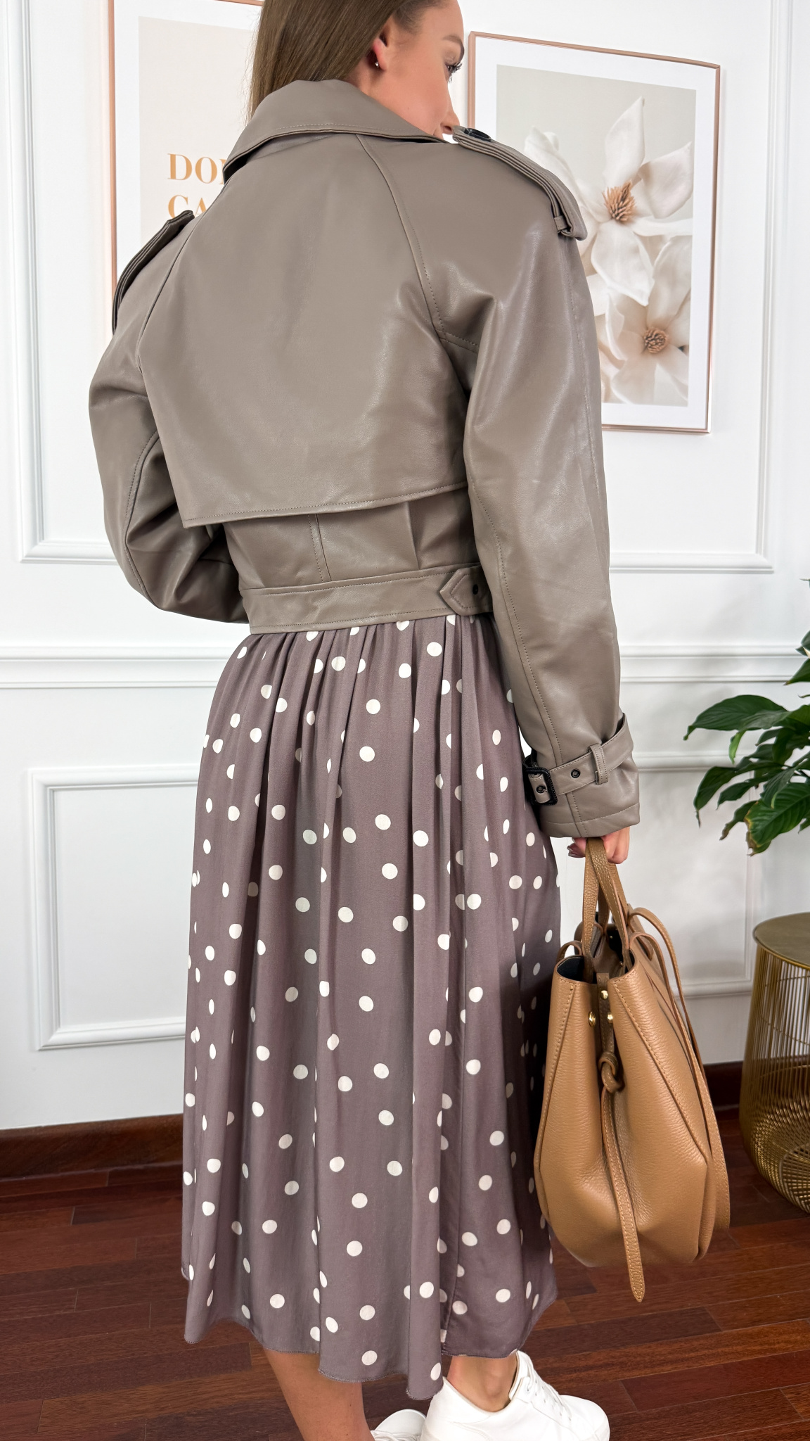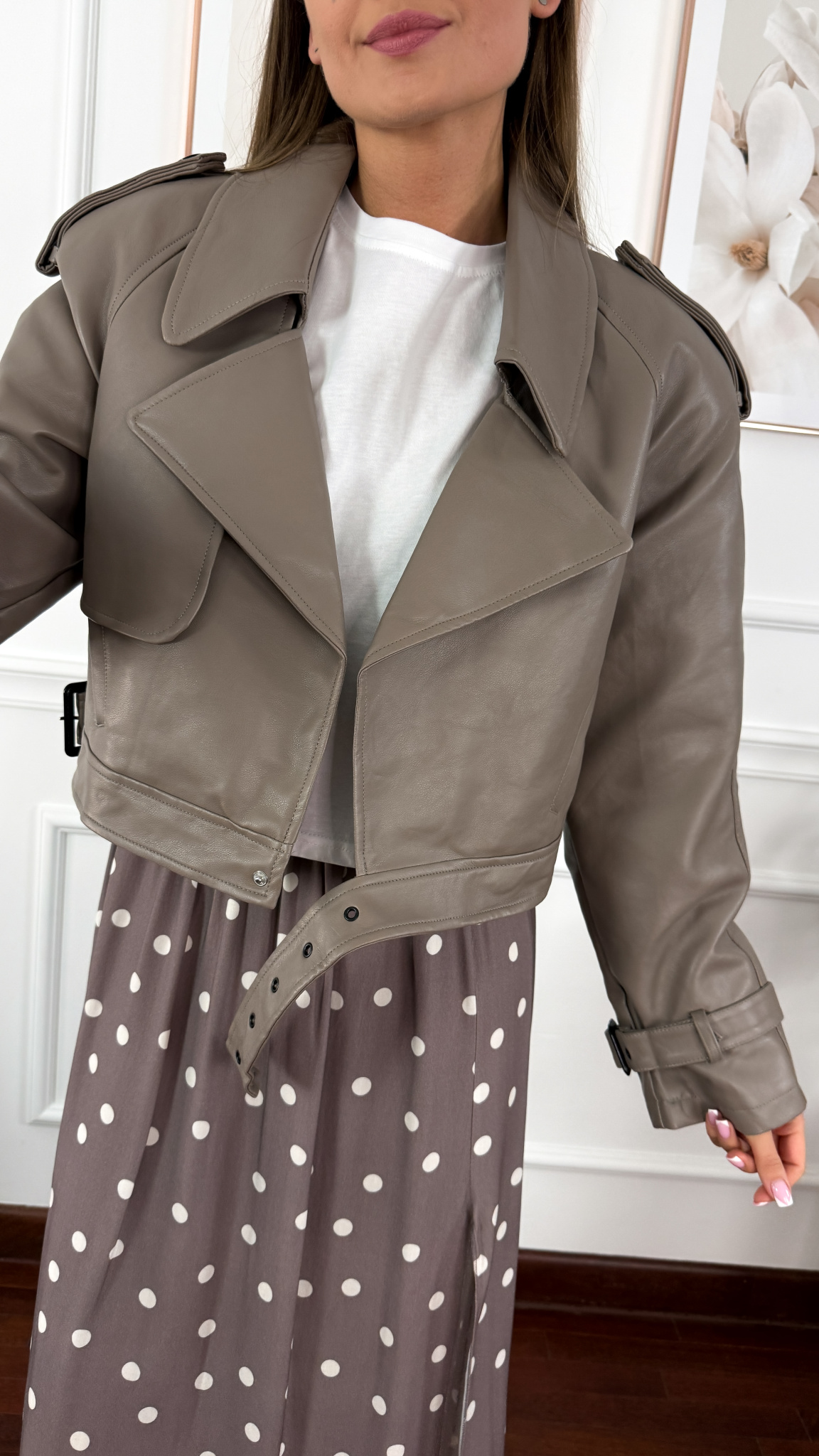 A'la skórzana ramoneska z krótszym stanem. Model przekładany, zapinany na zatrzask od wewnątrz. Na dole występuje ozdobne zapięcie na klamrę. Od przodu posiada praktyczne kieszonki. Elementy wykończenia są w kolorze czarnym.