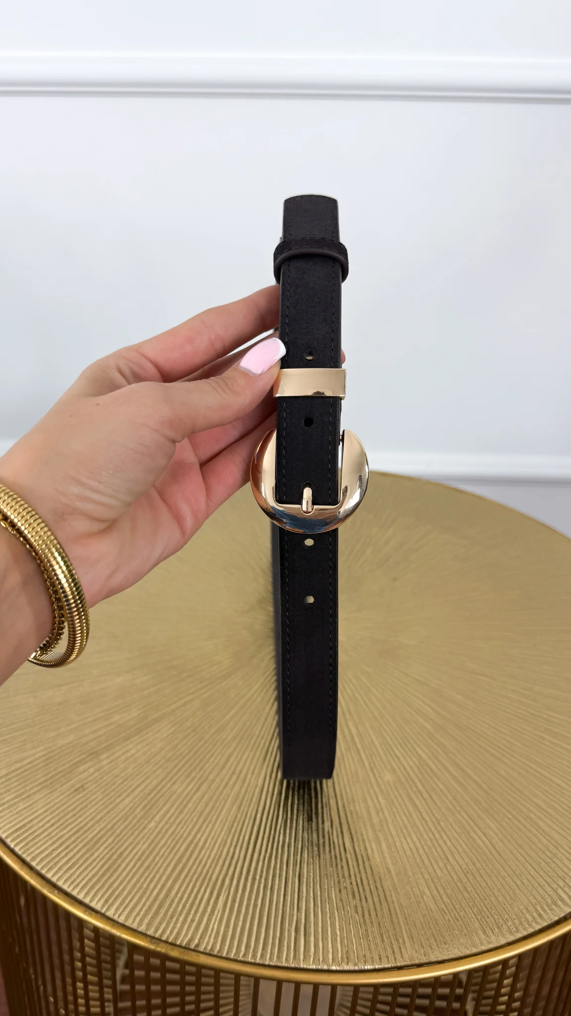 Stylowy pasek wykonany z skóry naturalnej zamszowej z pozłacaną klamrą. Rewelacyjna jakość.