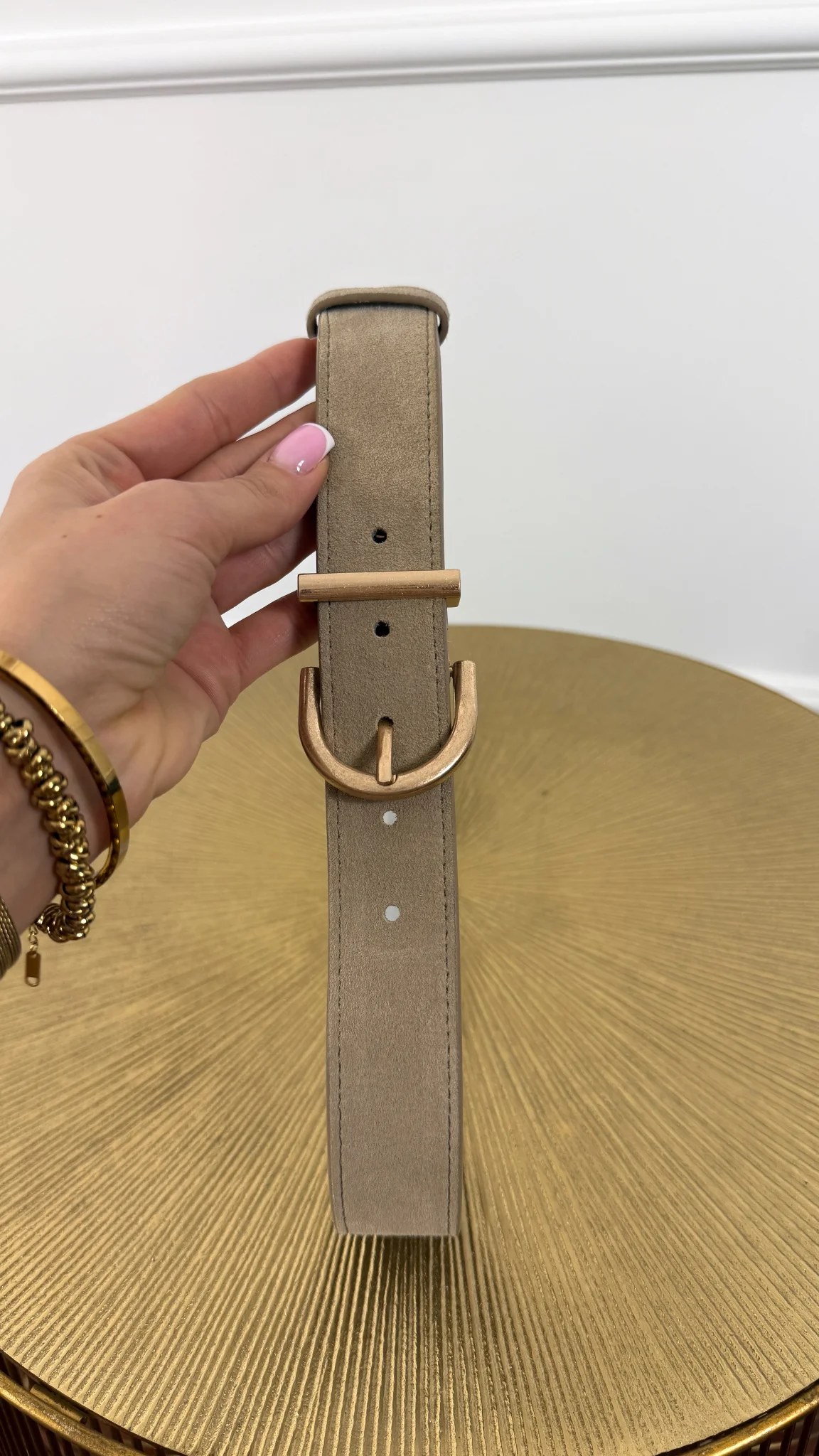 Stylowy pasek wykonany z skóry naturalnej zamszowej z pozłacaną klamrą. Rewelacyjna jakość.