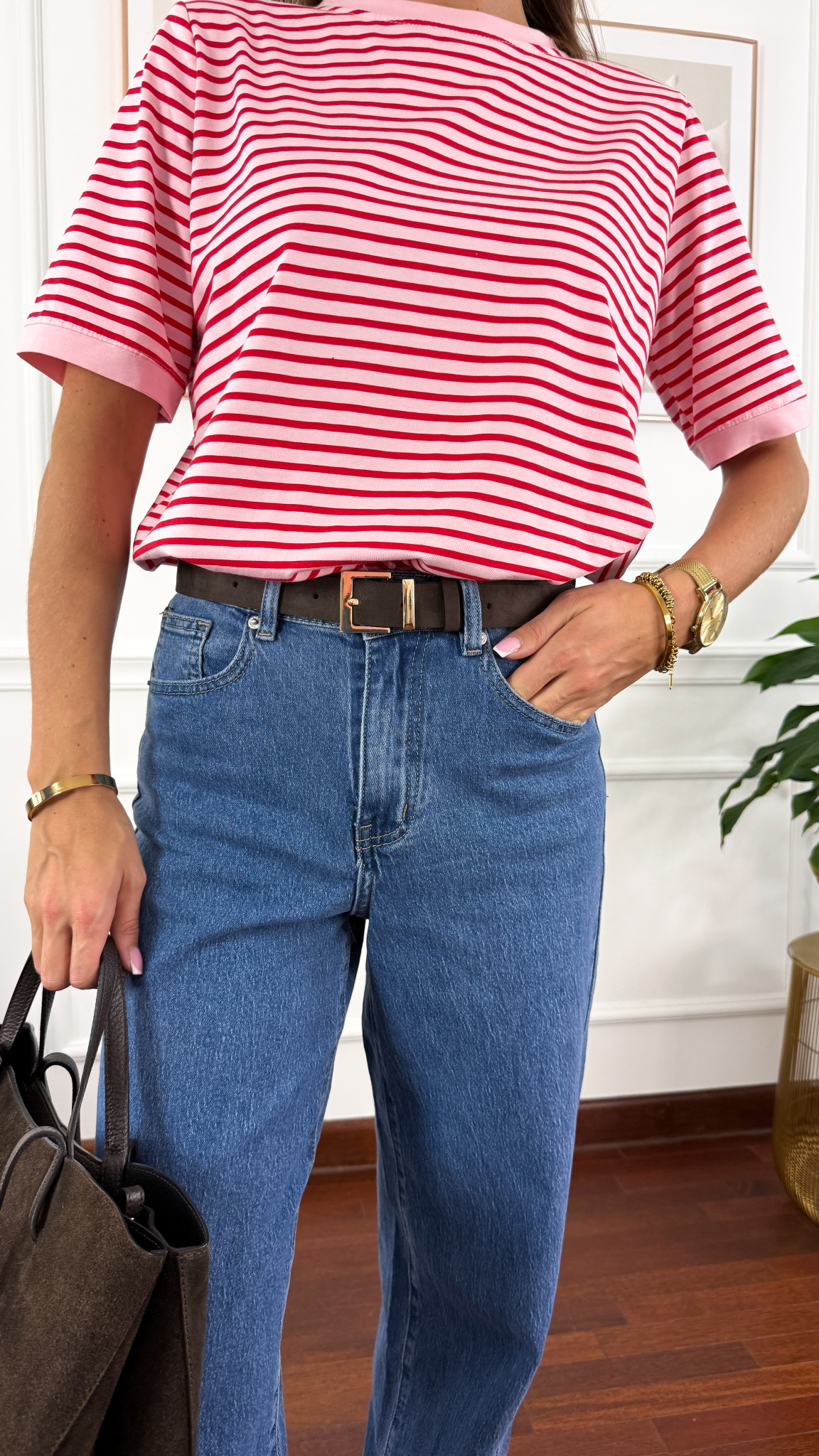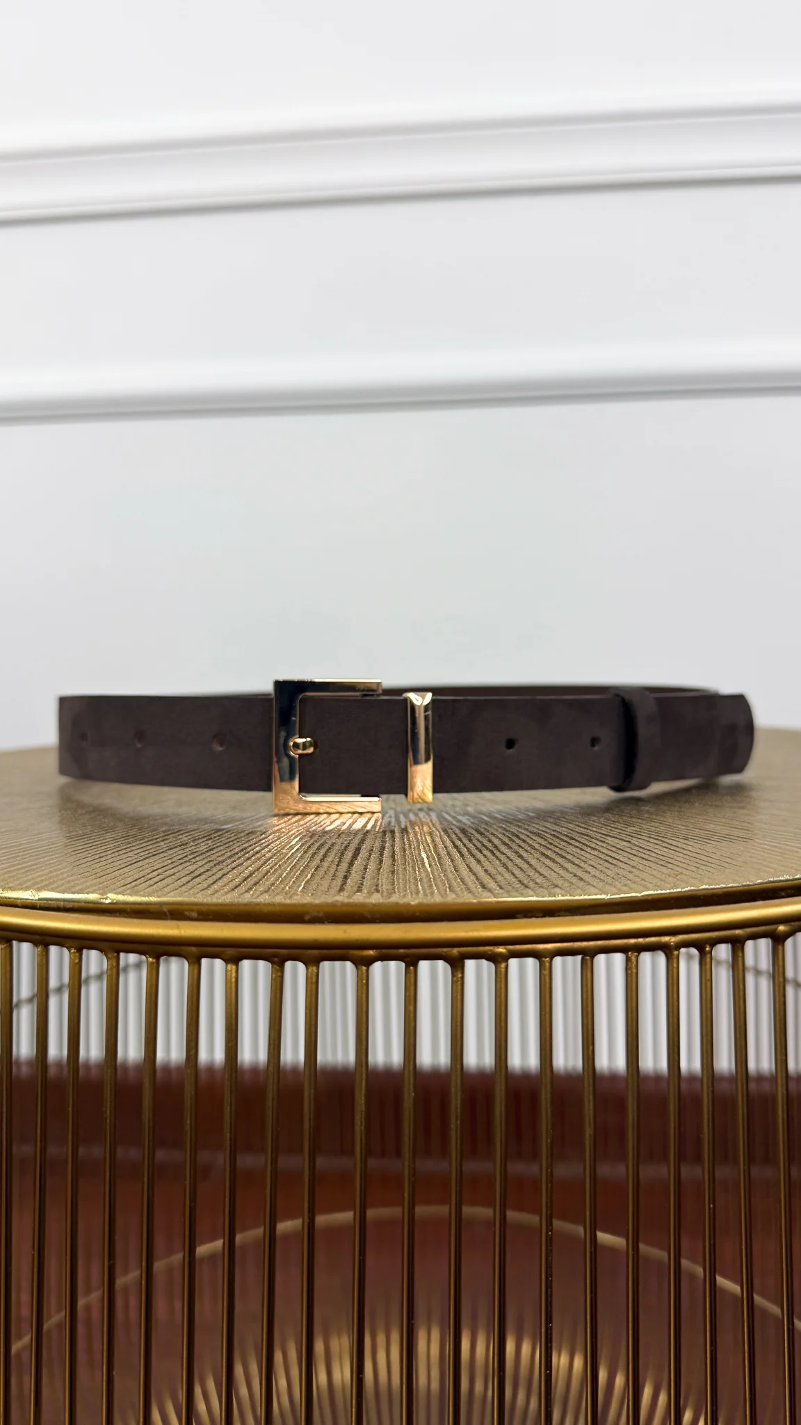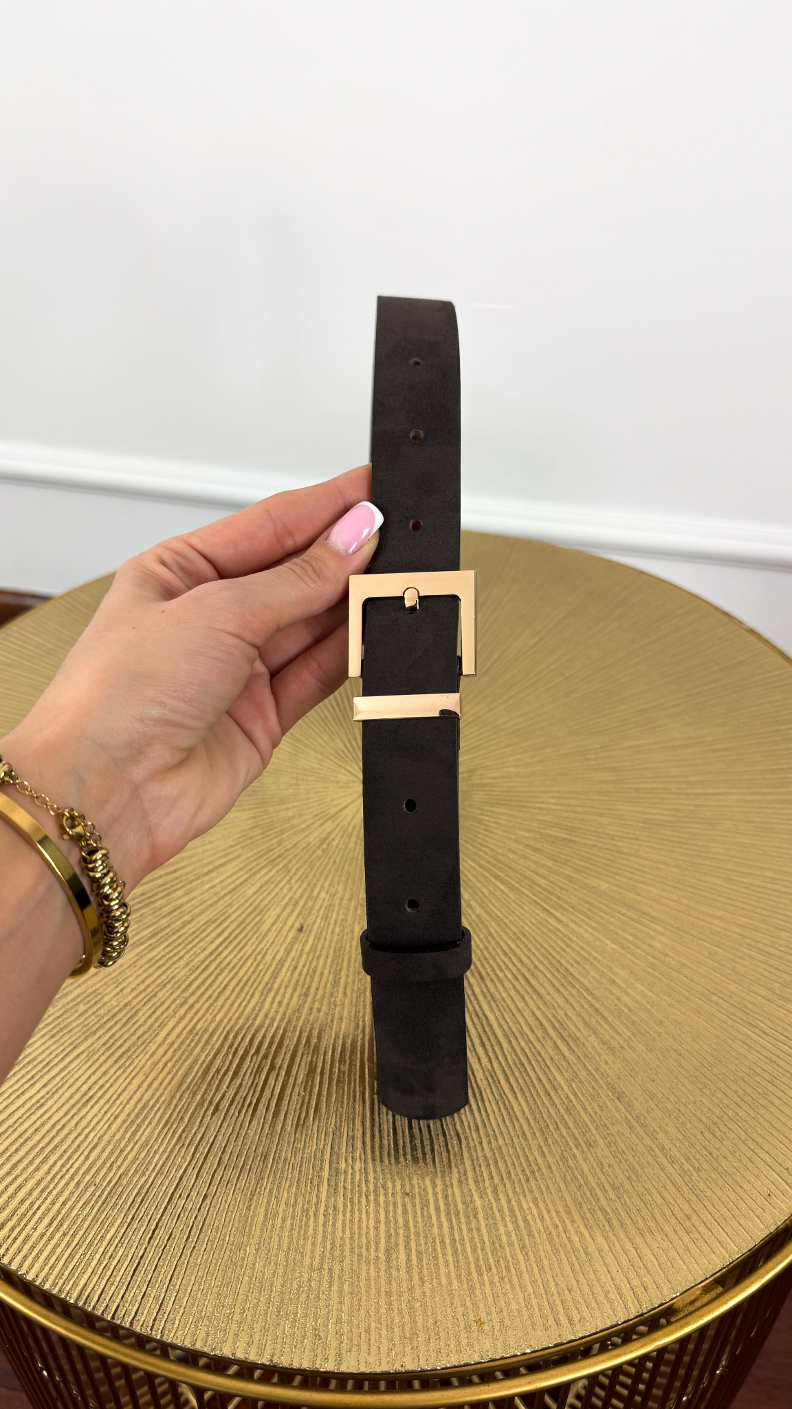 Pasek skórzany Harlow zamsz czekoladowo-złoty
