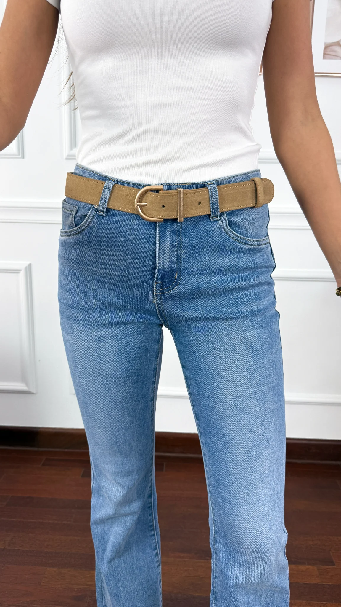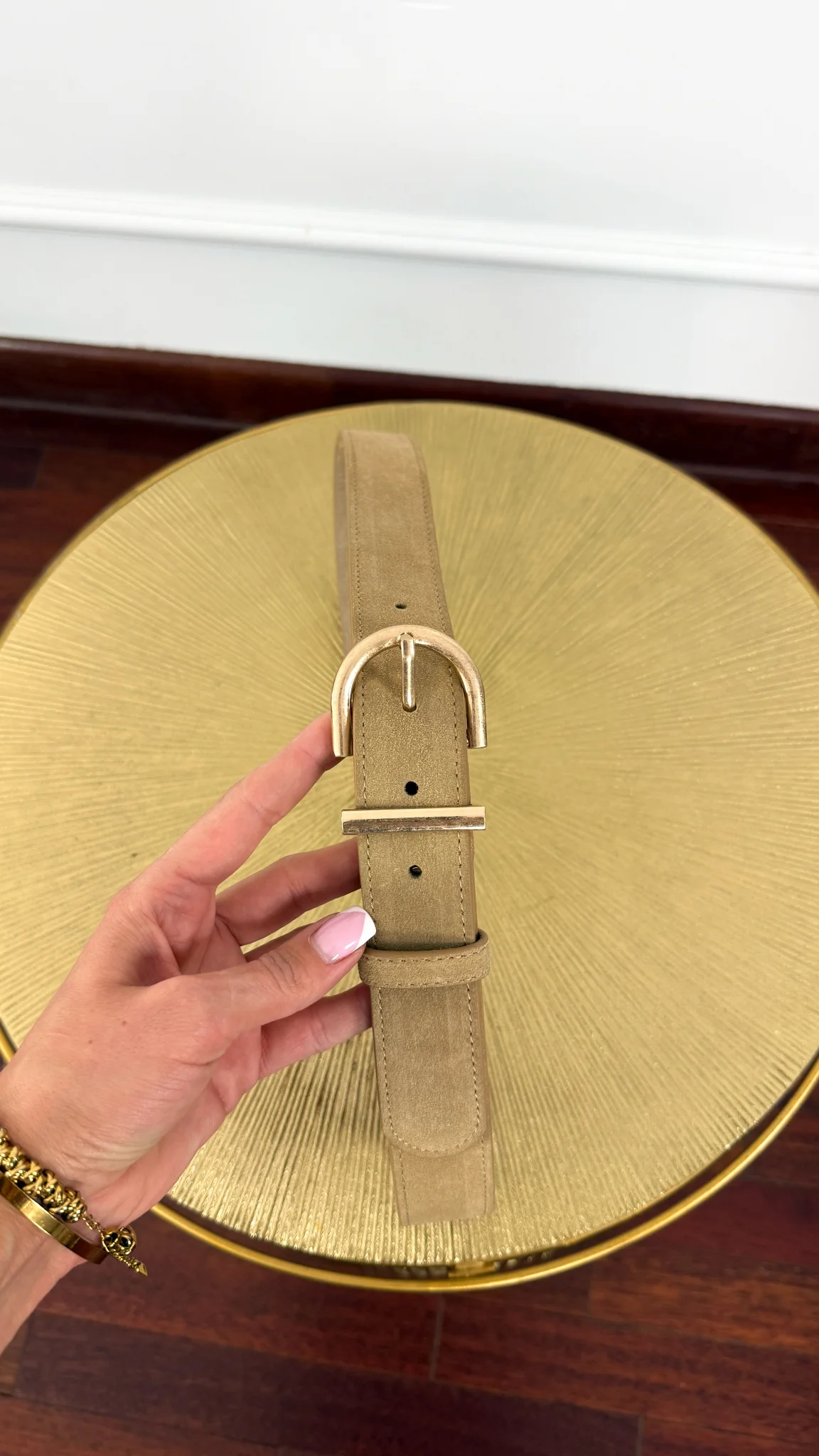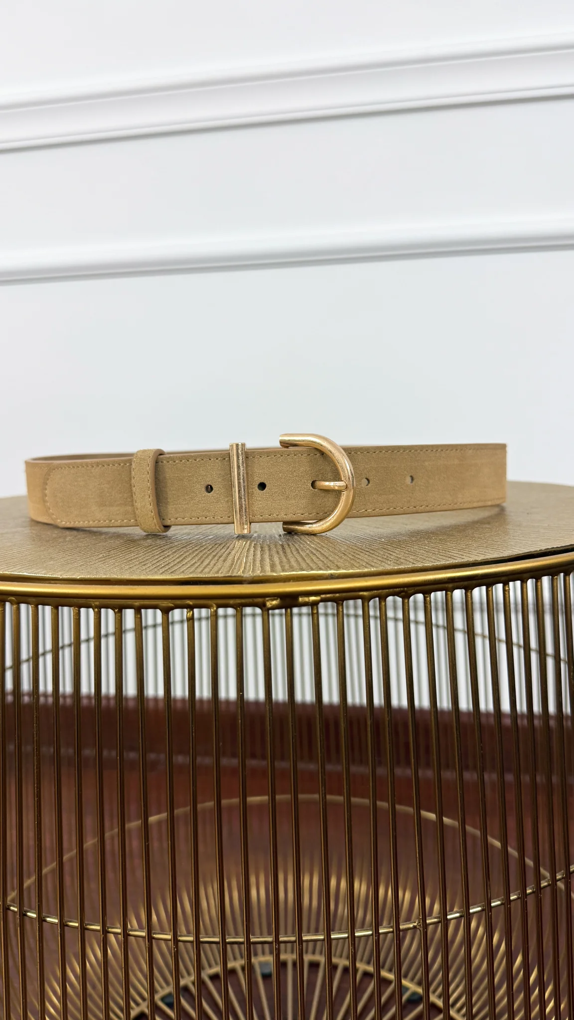 Stylowy pasek wykonany z skóry naturalnej zamszowej z pozłacaną klamrą. Rewelacyjna jakość.