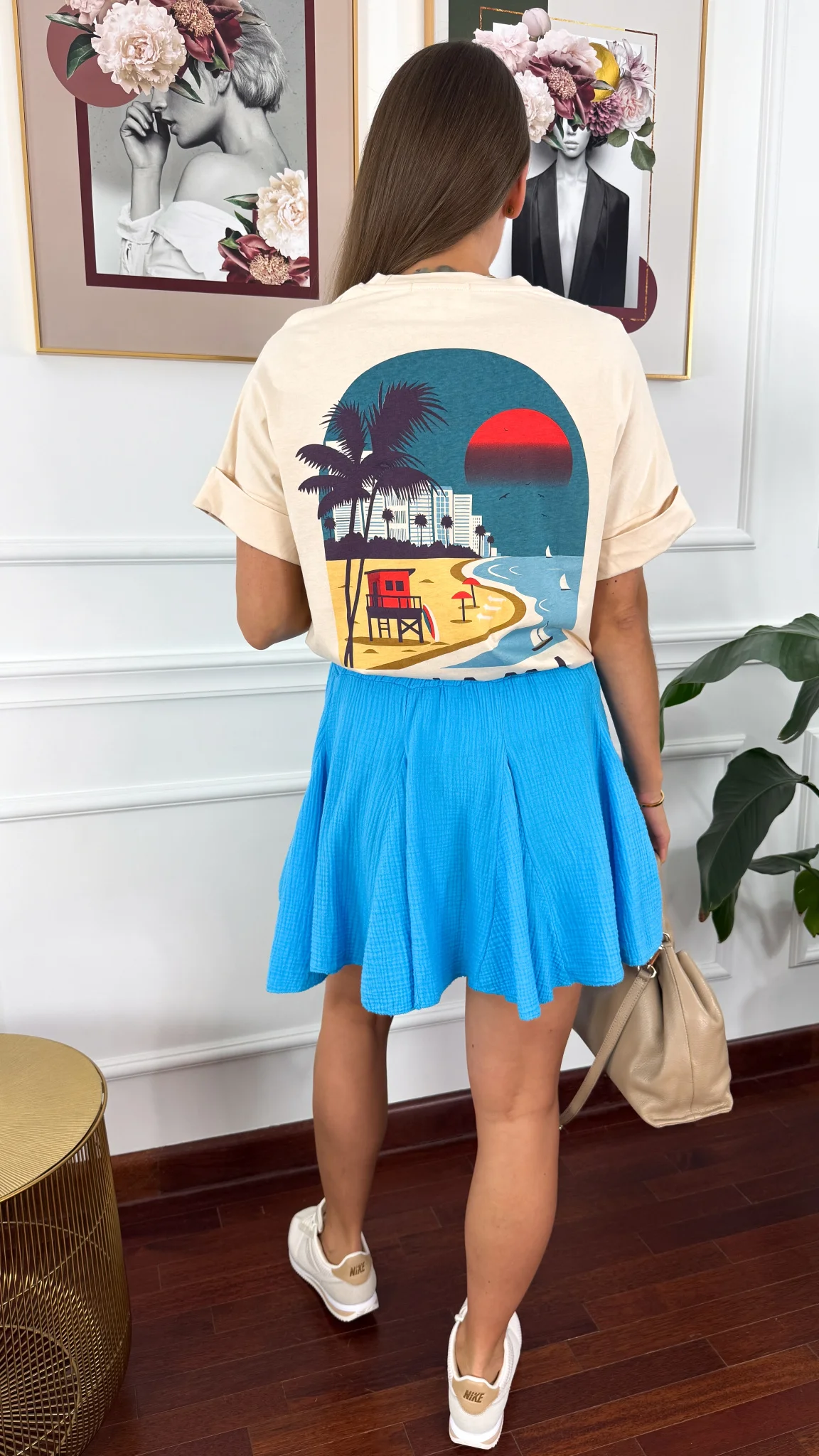 Spódnica sprawdzi się na sylwetkę w rozmiarze od S do L. Muślinowy rozkloszowany model. W pasie wszyta jest gumka oraz sznurek.