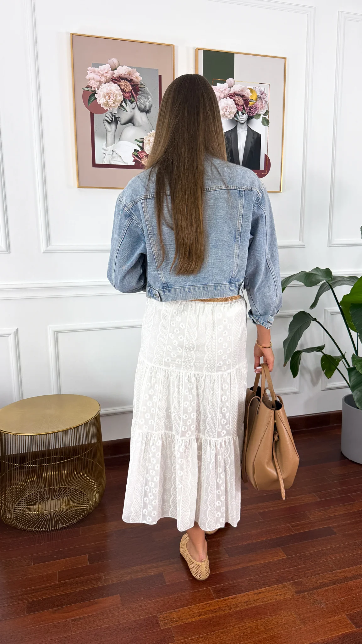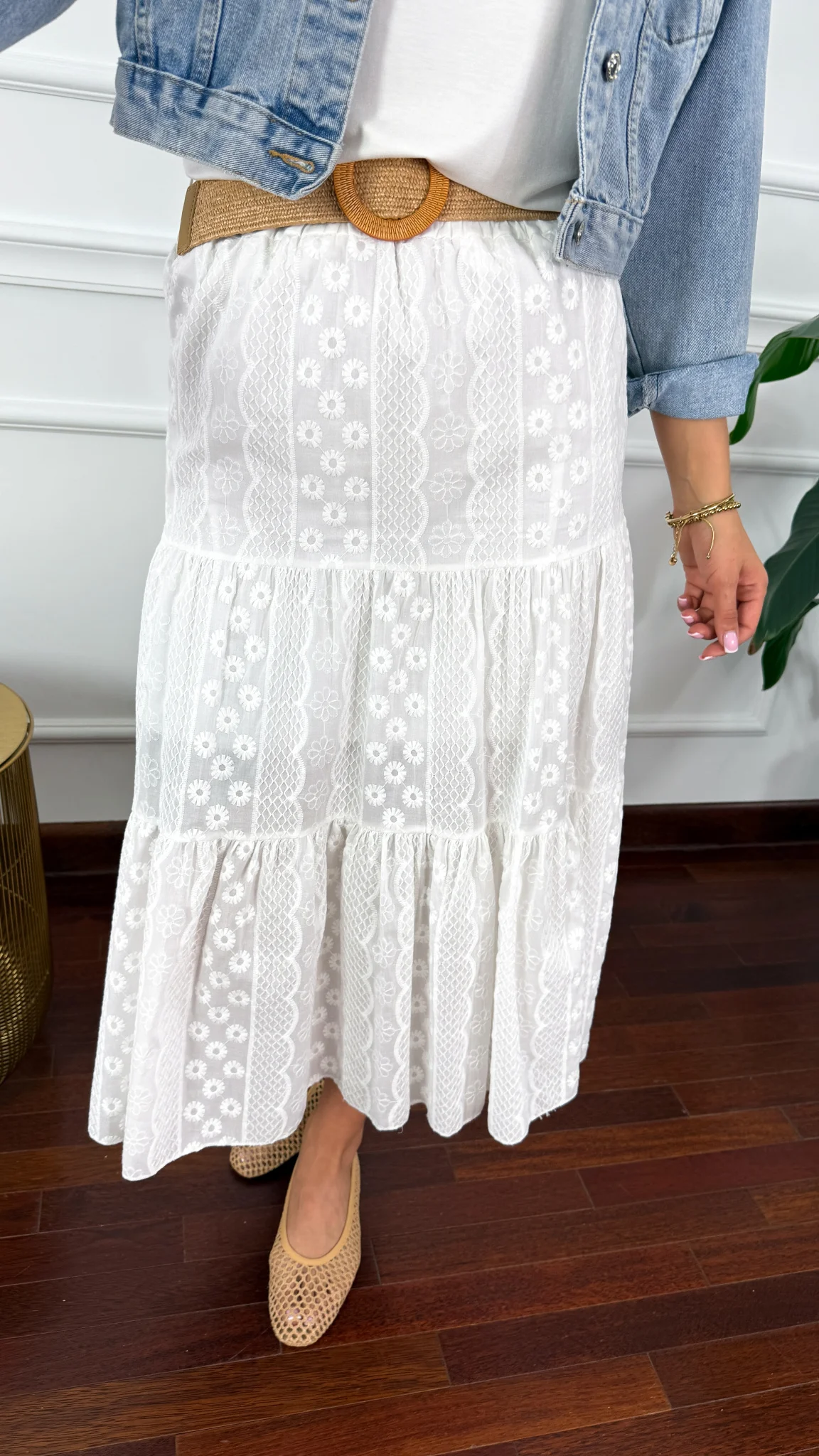 Model sprawdzi się na sylwetkę w rozmiarze od S do małej L. Ażurowa spódnica midi. Sprzedawana w zestawie z parcianym paskiem.