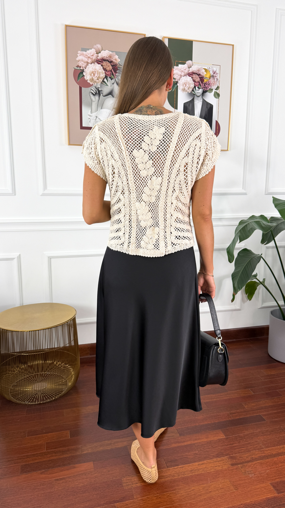 Spódnica midi sprawdzi się na sylwetkę w rozmiarze od S do L. Delikatny, nieprześwitujący materiał. W pasie znajduje się bardzo elastyczna gumka. Model jest cięty po kole.
