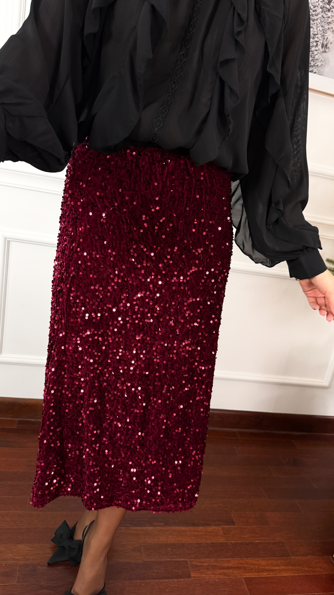 Welurowo cekinowa spódnica midi. W pasie wszyto gumkę. Posiada podszewkę.