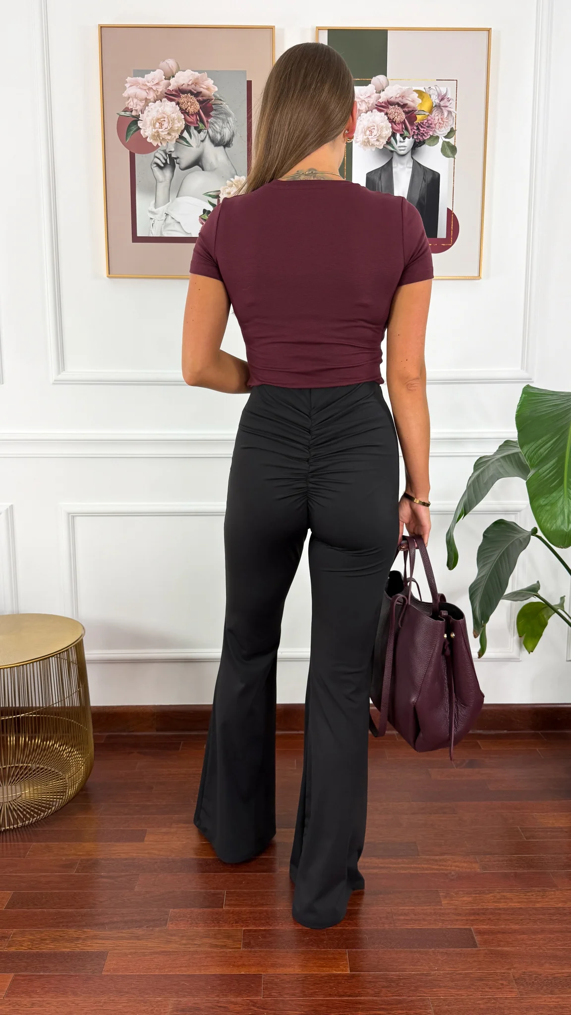 Elastyczne spodnie w typie dzwonów. Na przodzie oraz tyle spodni występuję marszczenie. Bardzo wygodne.
