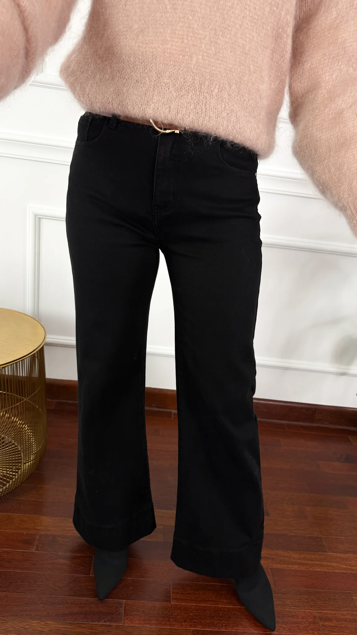 Jeansowe spodnie typu dzwony. Posiadają wyższy stan. Z przodu i z tyłu spodni wszyto praktyczne kieszonki.