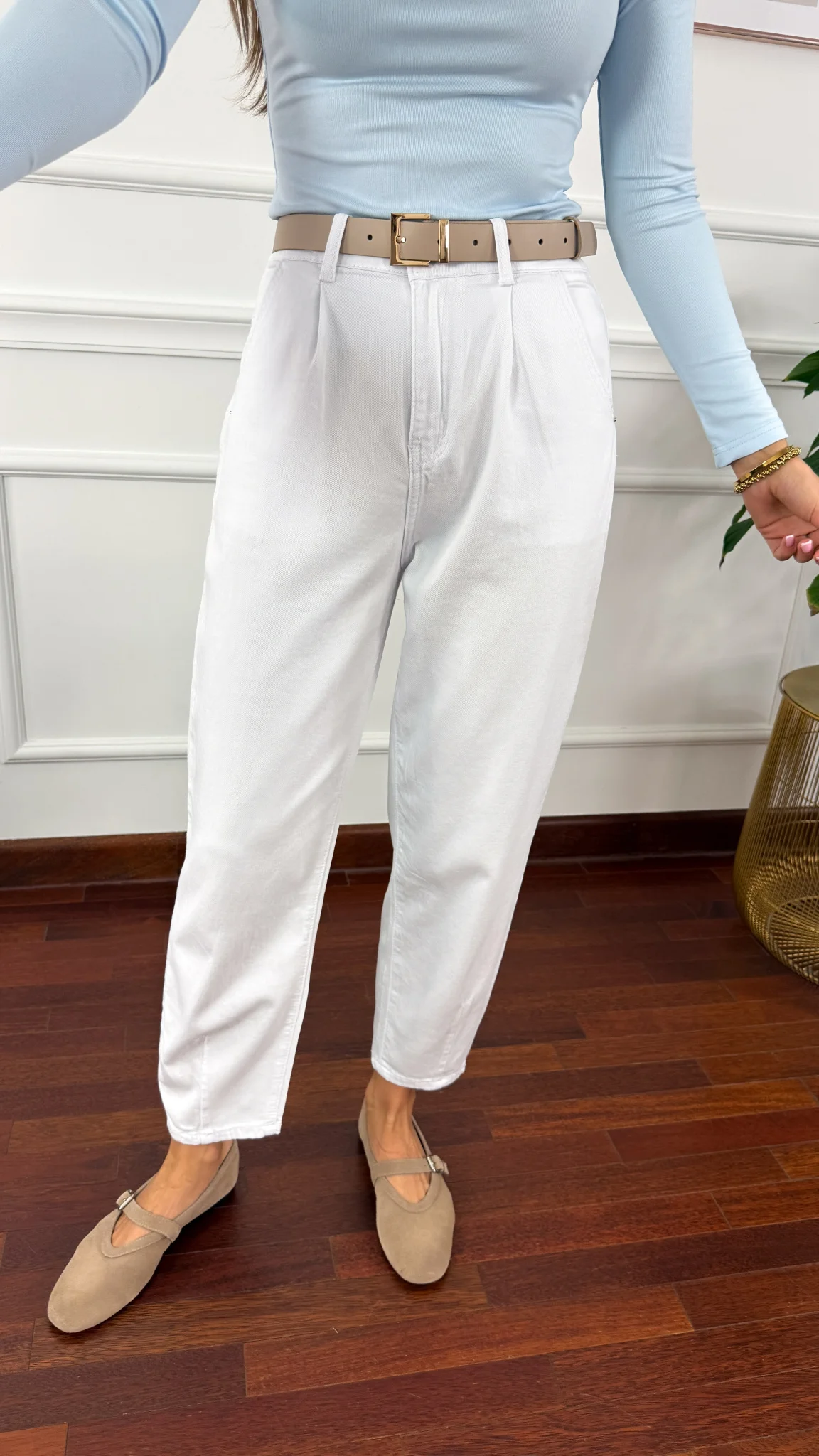 Bawełniane elastyczne spodnie typu balloon. Na pośladkach kieszenie. Biały kolor nada Twojej stylizacji wiosennego look'u. Bardzo elastyczny materiał.