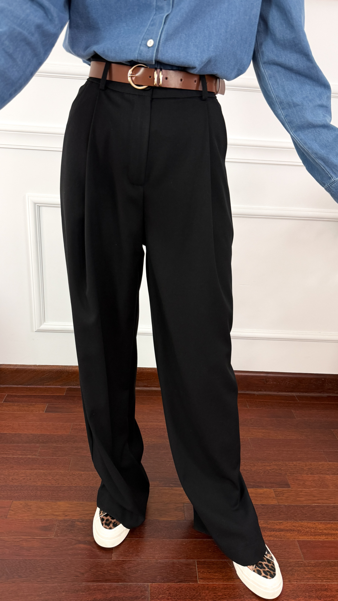 Materiałowe spodnie z szeroką nogawką w kant. Zapinane na zamek oraz guzik. Posiadają szlufki oraz praktyczne kieszonki. Spodnie bez problemu można skrócić u krawca, aby idealnie dopasować ich długość do swojej sylwetki. Można je również wydłużyć dodatkowo o 2-3cm odpruwając szew na dole.