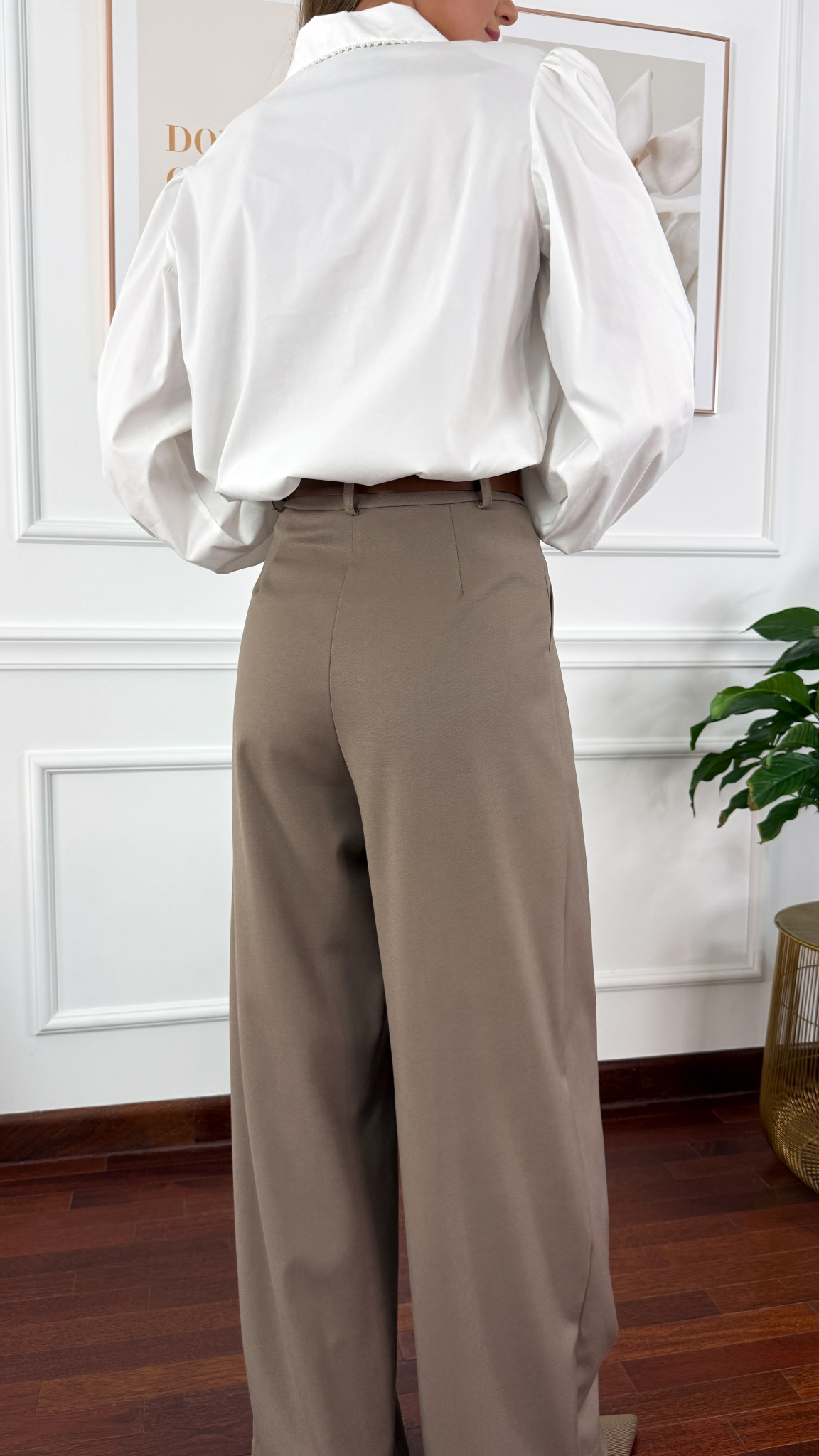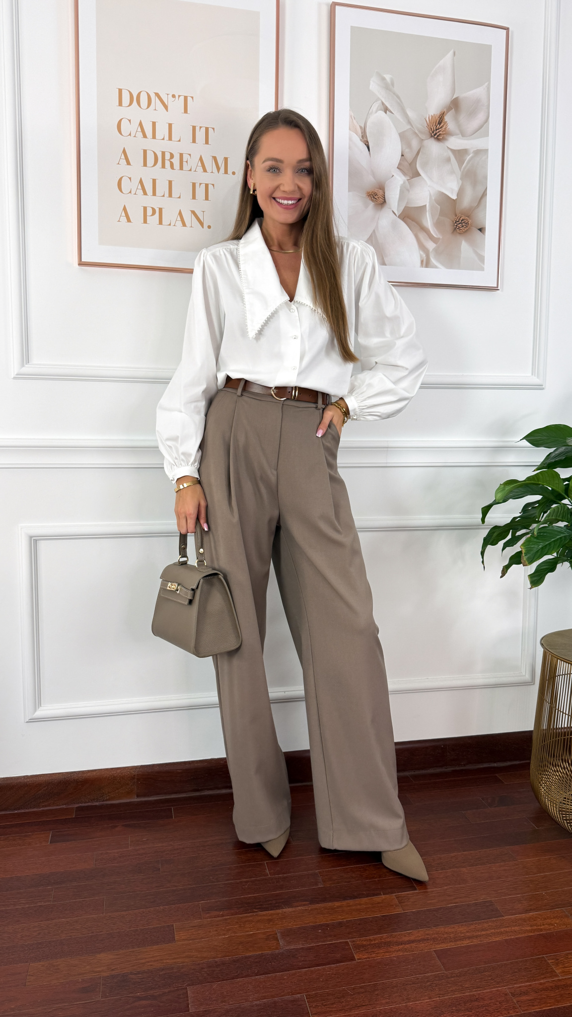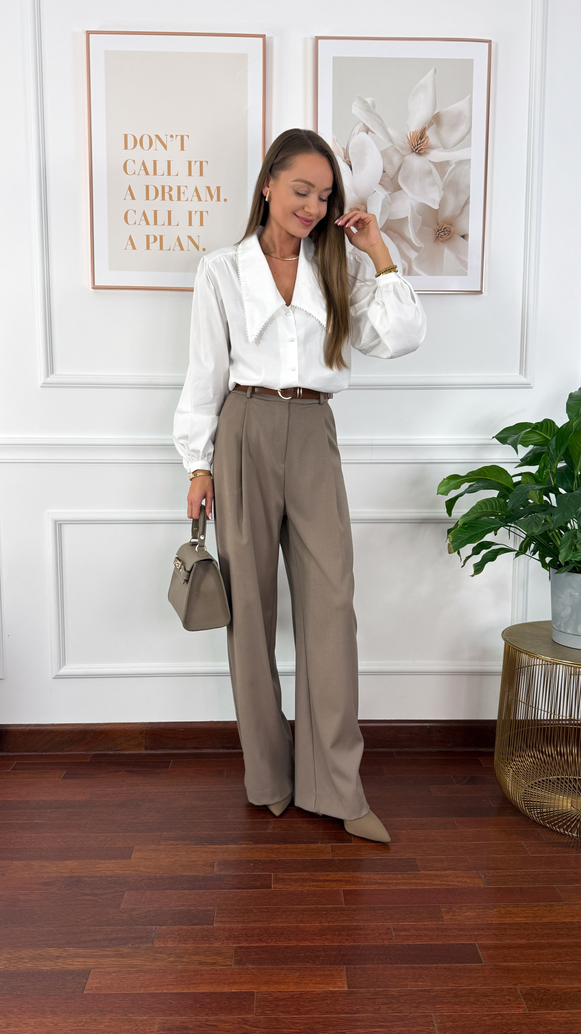 Materiałowe spodnie z szeroką nogawką w kant. Zapinane na zamek oraz guzik. Posiadają szlufki oraz praktyczne kieszonki. Spodnie bez problemu można skrócić u krawca, aby idealnie dopasować ich długość do swojej sylwetki. Można je również wydłużyć dodatkowo o 2-3cm odpruwając szew na dole.
