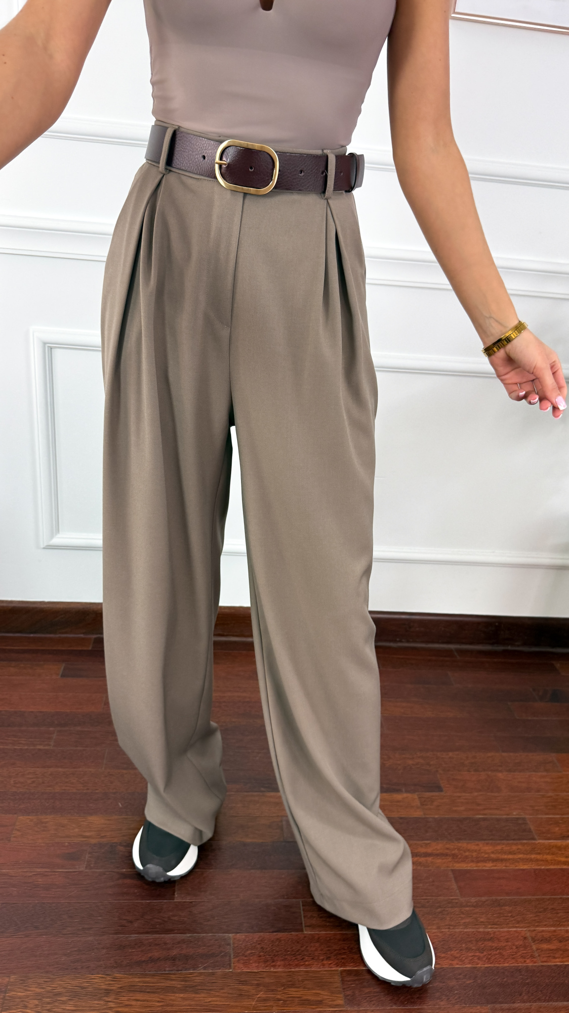 Materiałowe spodnie z szeroką nogawką w kant. Na udzie zakładki, które się rozchodzą. Zapinane na zamek oraz guzik. Posiadają szlufki oraz praktyczne kieszonki. Spodnie bez problemu można skrócić u krawca, aby idealnie dopasować ich długość do swojej sylwetki. Można je również wydłużyć dodatkowo o 2-3cm odpruwając szew na dole.