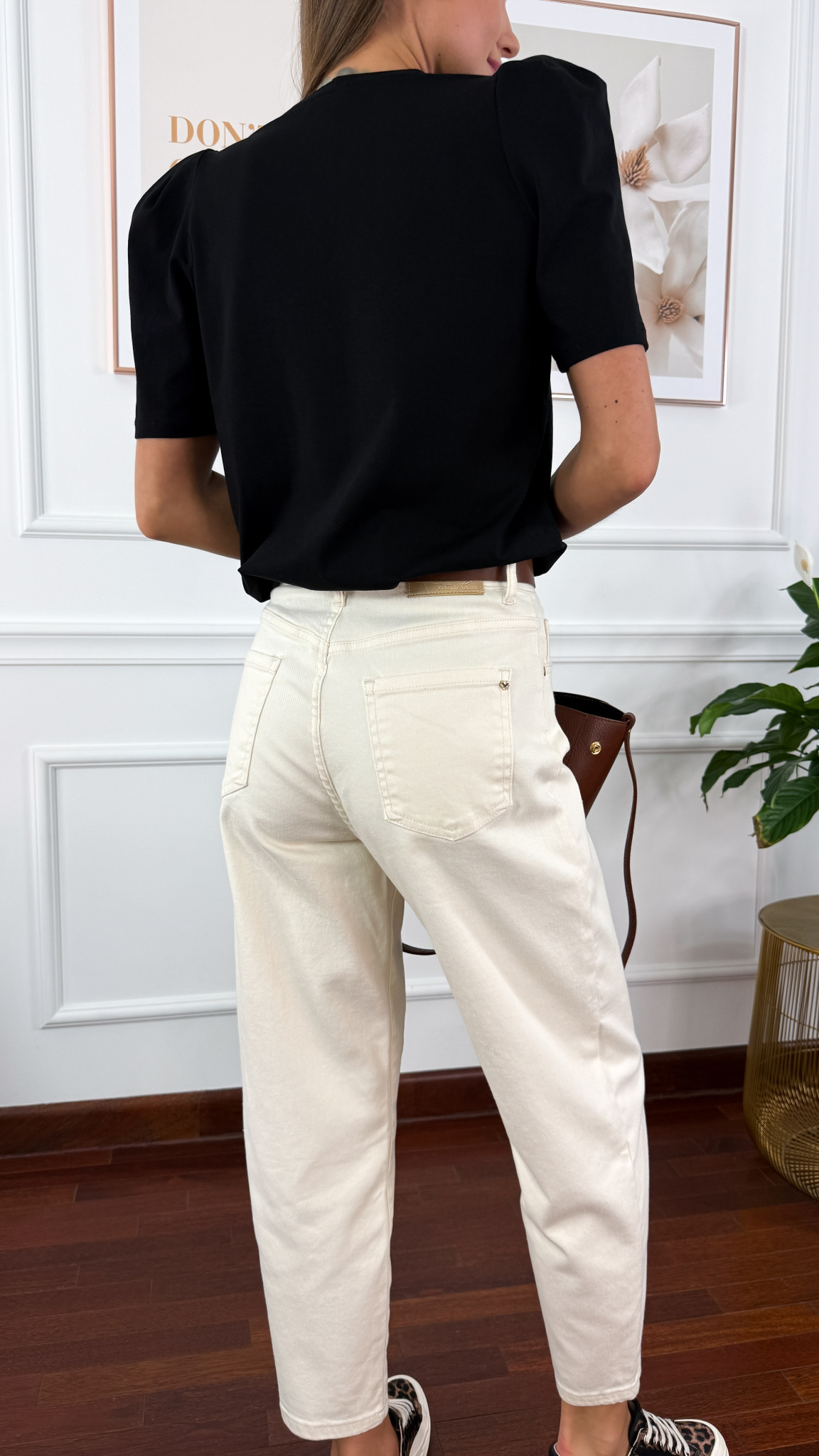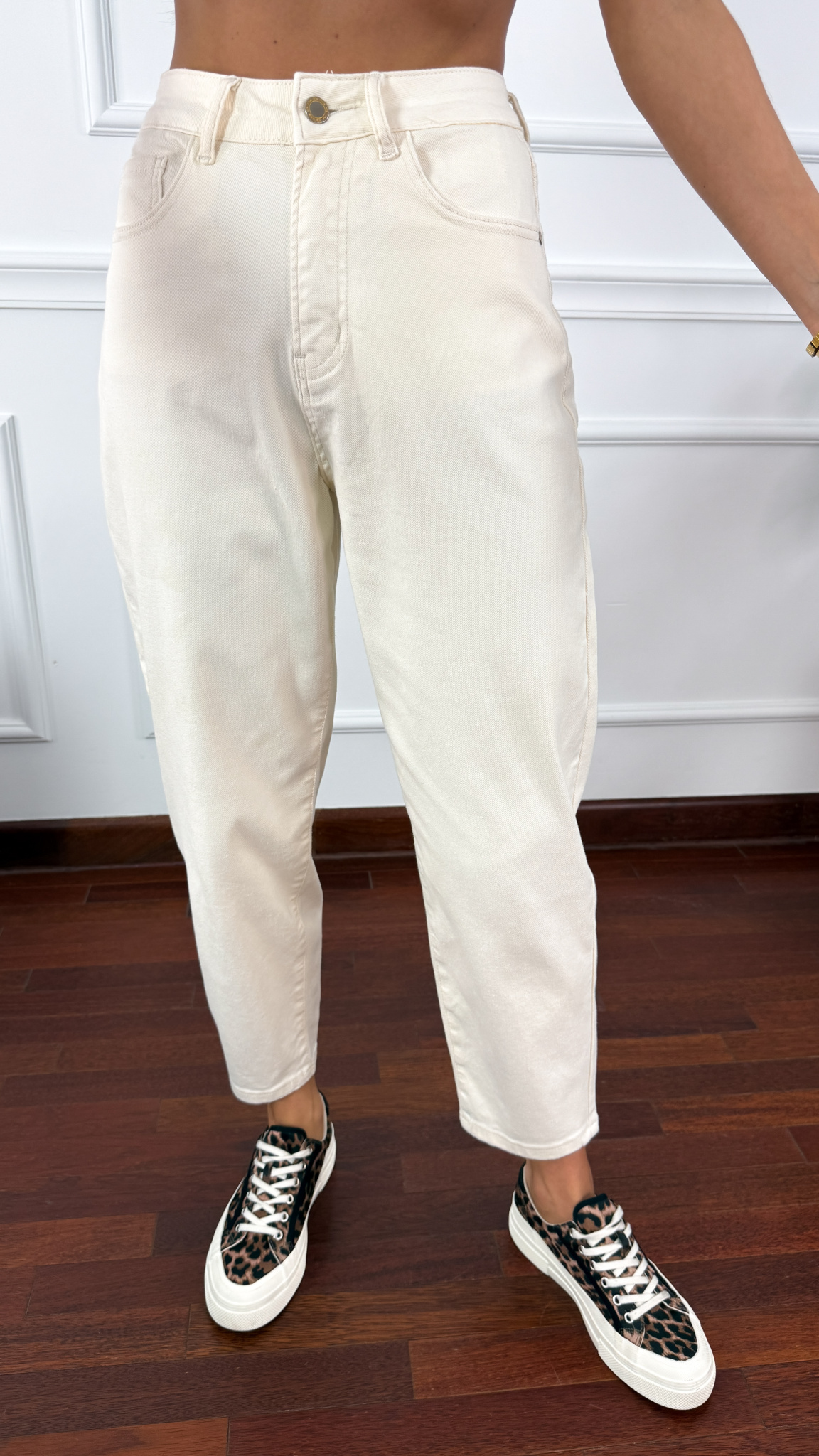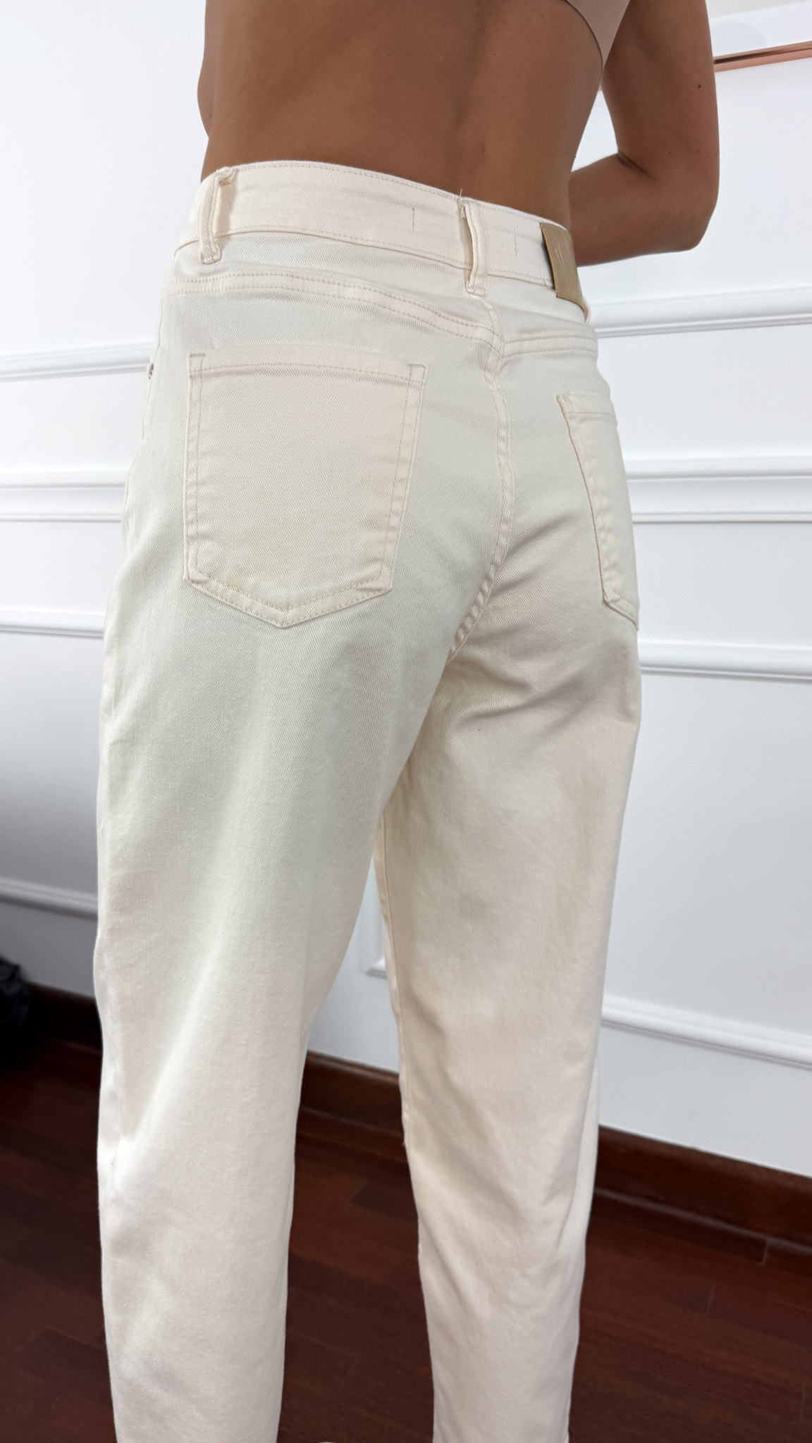 Jeansowe spodnie mom fit z wysokim stanem. Elastyczny materiał. Z przodu i z tyłu spodni wszyto praktyczne kieszonki.