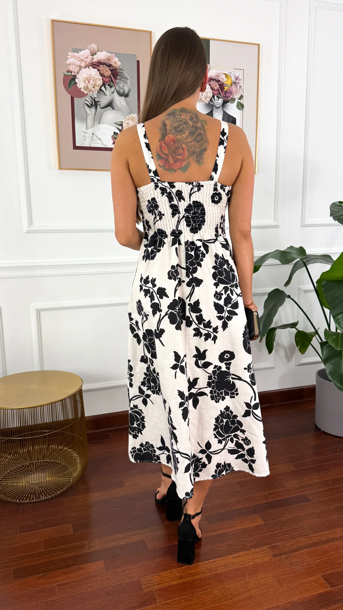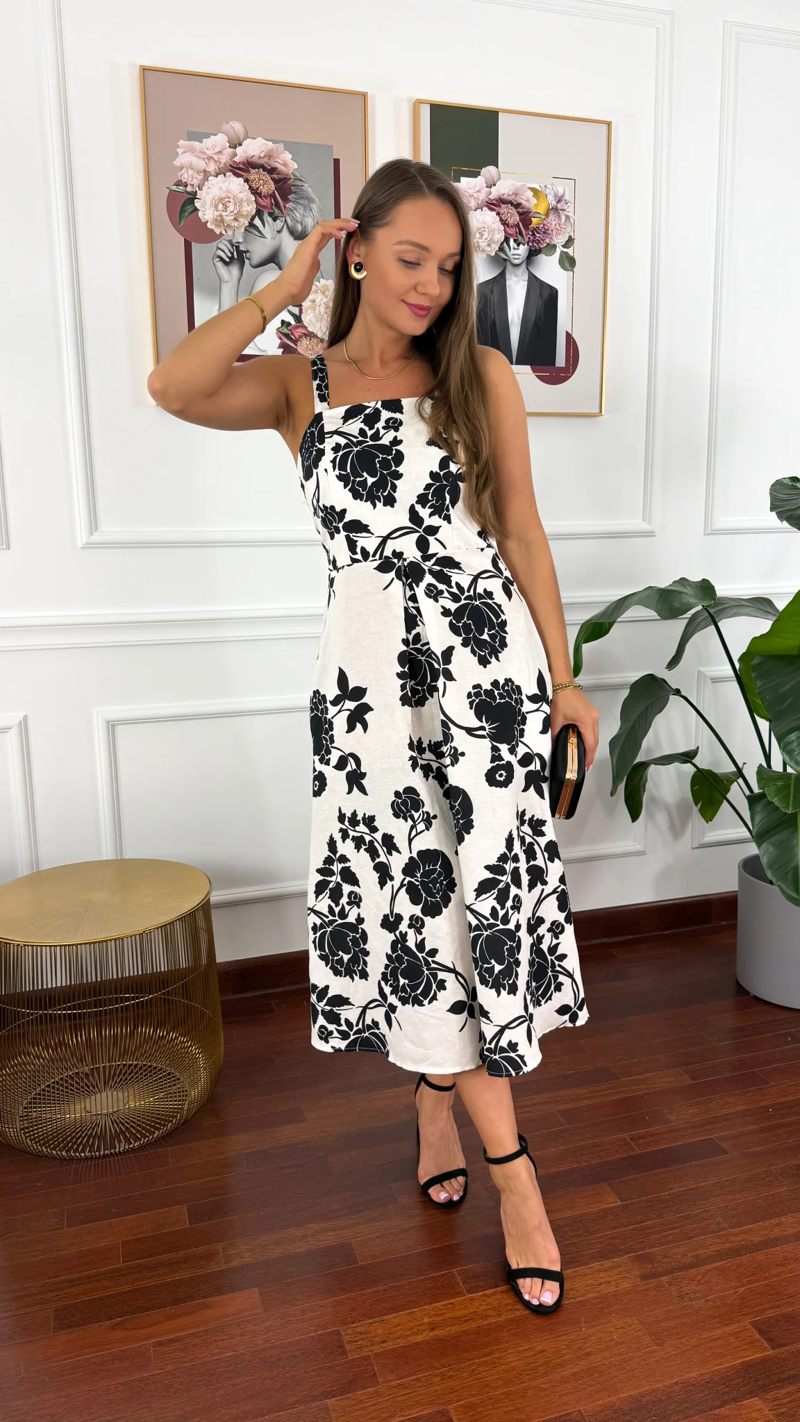 Sukienka sprawdzi się na sylwetkę w rozmiarze od S do L. Model midi na szerszych ramiączkach. W górnej części wszyto szerszy ściągacz. Posiada praktyczne kieszonki.