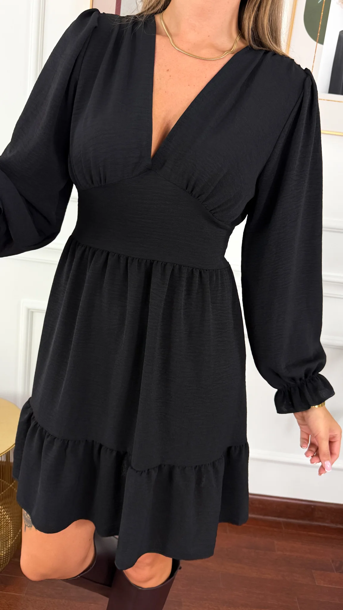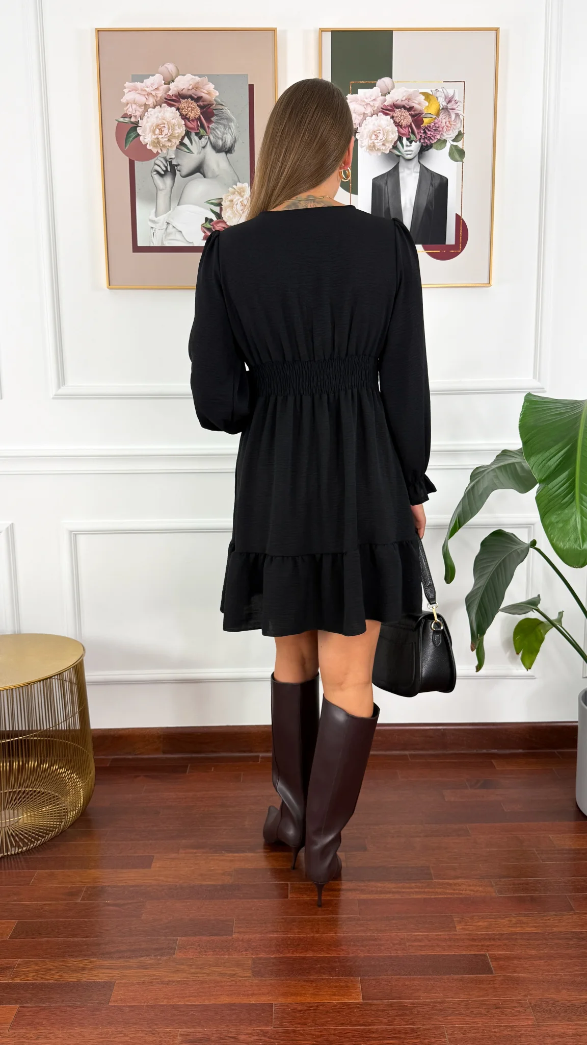 Sukienka sprawdzi się na sylwetkę w rozmiarze od S do L. Głębszym dekoltem w serek. Z przodu jest przeszycie, które tworzy a'la gorset. Z tyłu znajduje się szersza gumka. Długi rękaw na którego zakończeniu wszyto gumkę. W dolnej części wszyto falbanę.