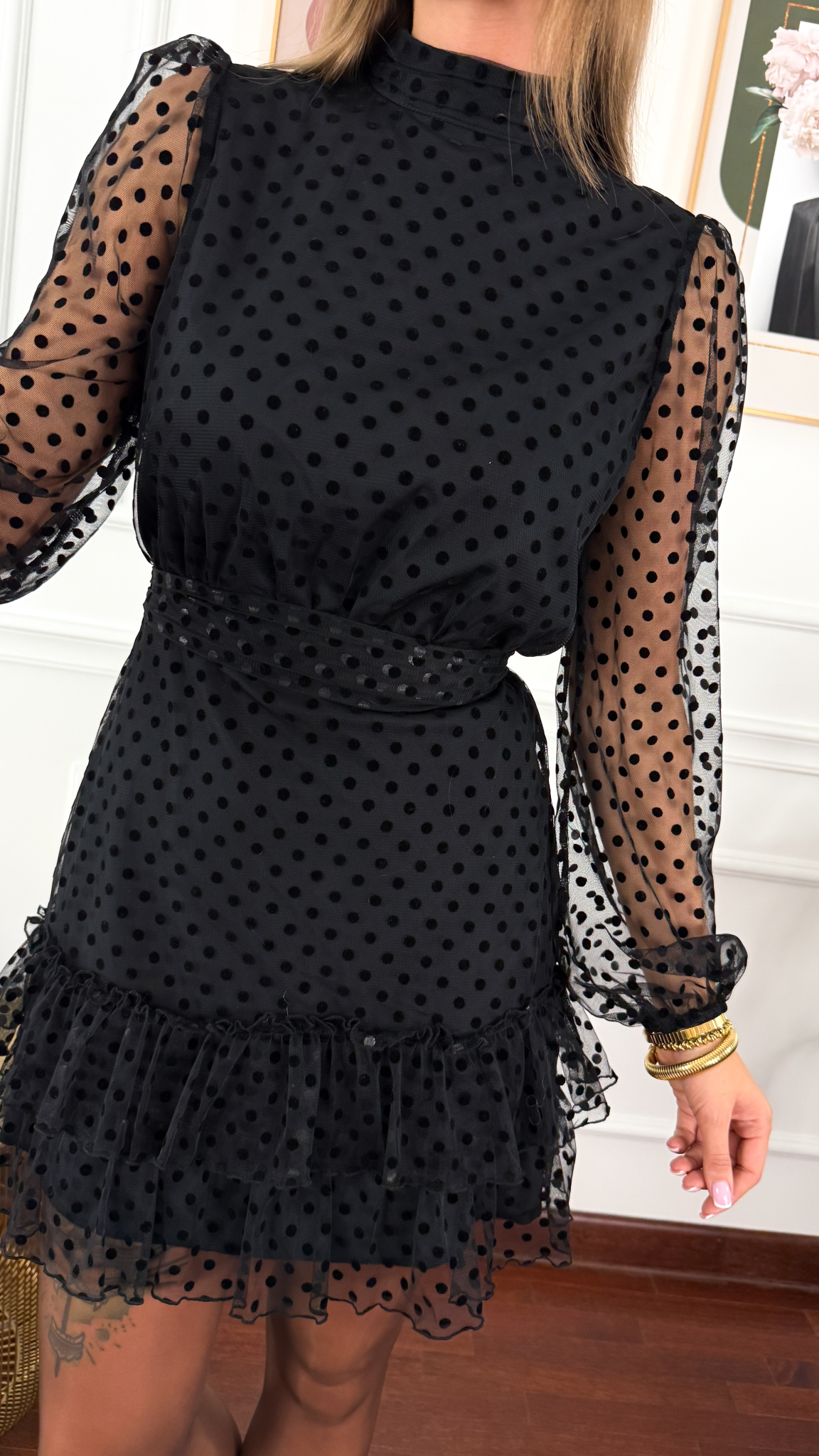 Sukienka sprawdzi się na sylwetkę w rozmiarze od XS do M/L. Model obszyty tiulem w czarne kropki z zabudowanym dekoltem, zapinana z tyłu na 3 guziki. Poszerzane rękawy z subtelną bufką, zakończone gumką. Z tyłu na wysokości talii wszyta gumka. Dół zakończony podwójną falbaną.