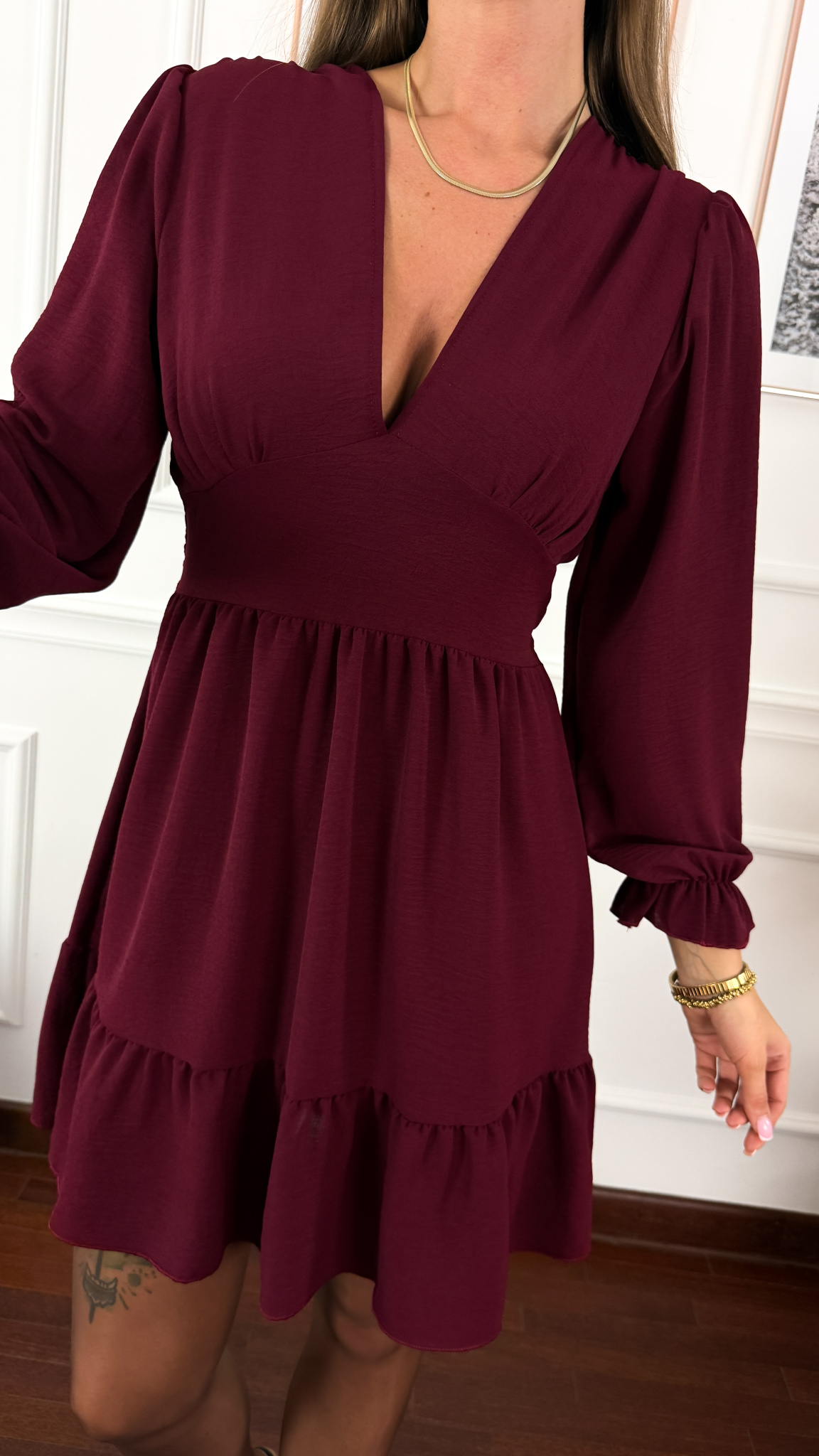 Sukienka sprawdzi się na sylwetkę w rozmiarze od S do L. Głębszym dekoltem w serek. Z przodu jest przeszycie, które tworzy a'la gorset. Z tyłu znajduje się szersza gumka. Długi rękaw na którego zakończeniu wszyto gumkę. W dolnej części wszyto falbanę.
