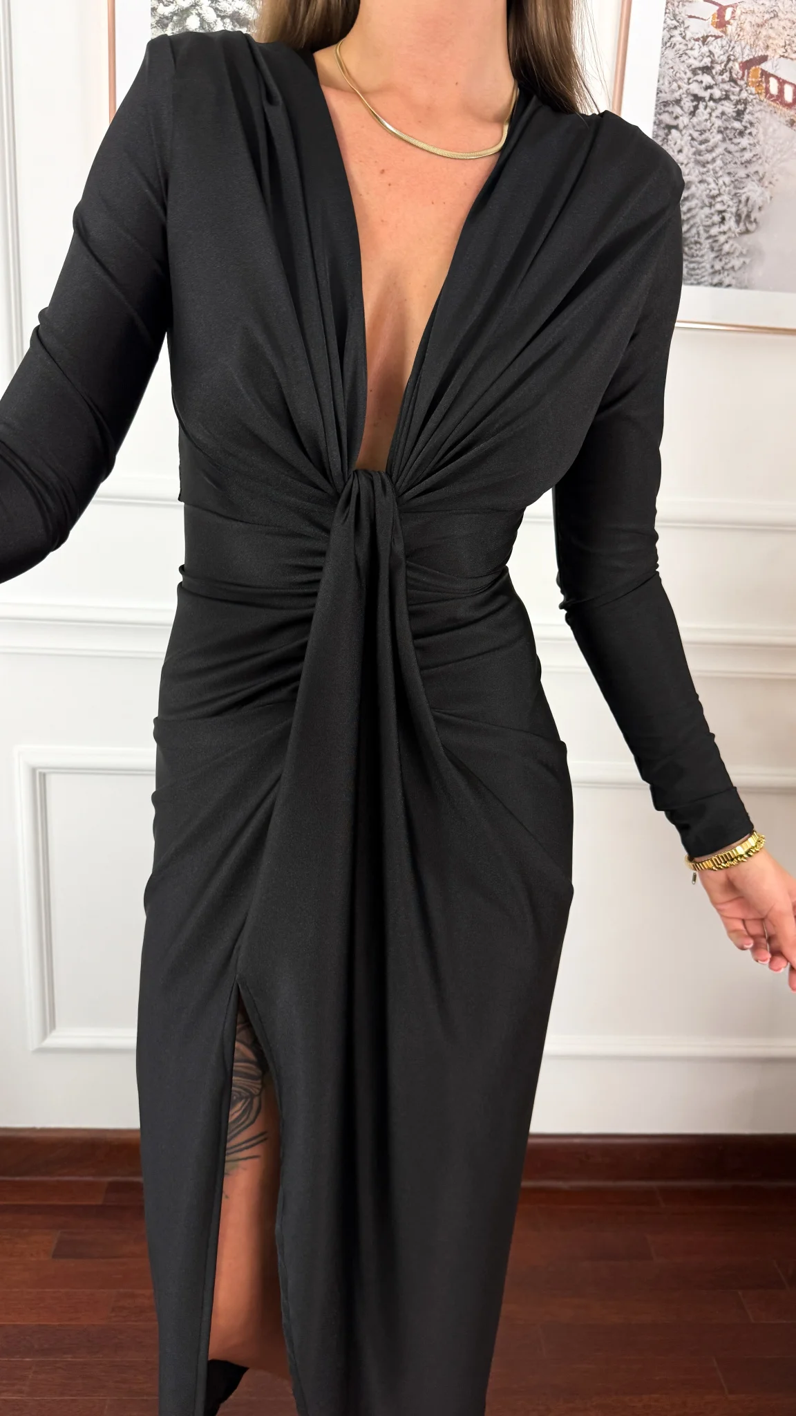 Model sprawdzi się na sylwetkę w rozmiarze od XS do M/L. Połyskująca sukienka z długim rękawem oraz głębokim dekoltem. W ramionach wszyto poduszki. Pod żebrami wszyto gumkę. Posiada wycięcie na prawą nogę.