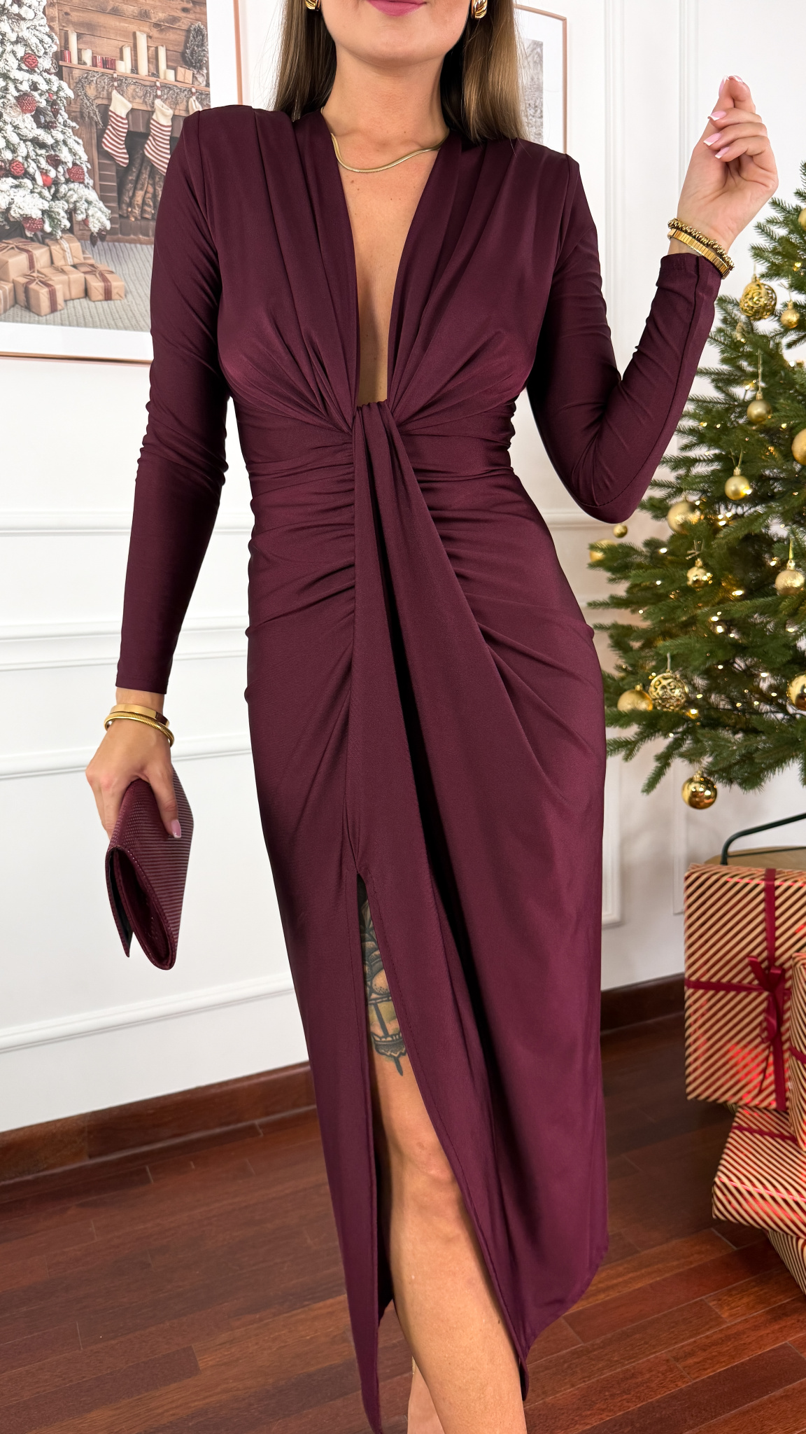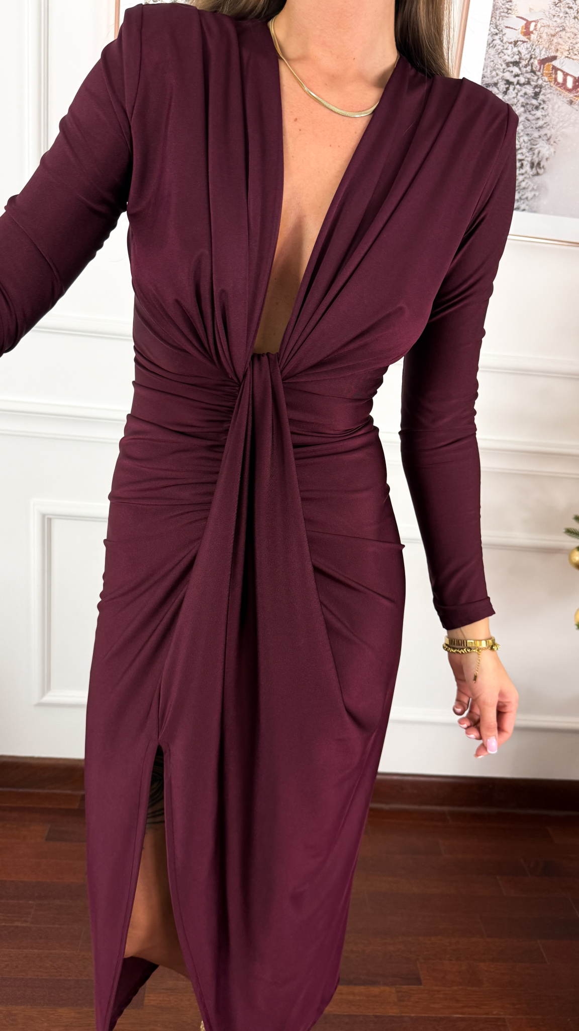 Model sprawdzi się na sylwetkę w rozmiarze od XS do M/L. Połyskująca sukienka z długim rękawem oraz głębokim dekoltem. W ramionach wszyto poduszki. Pod żebrami wszyto gumkę. Posiada wycięcie na prawą nogę.