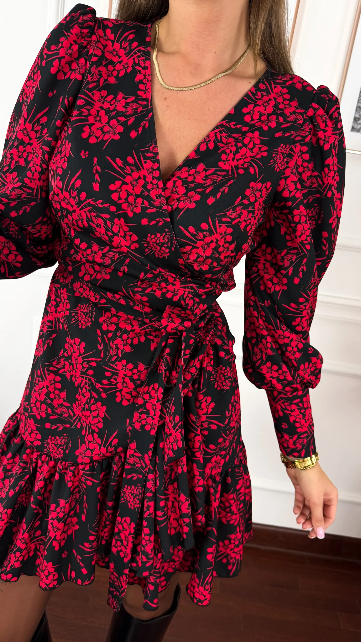 Model przekładany, który przewiązuje się w pasie sznurkami. W dolnej części sukienka zakończona jest falbaną. Długi rękaw zakończony mankietem zapinany pozłacanymi guzikami.