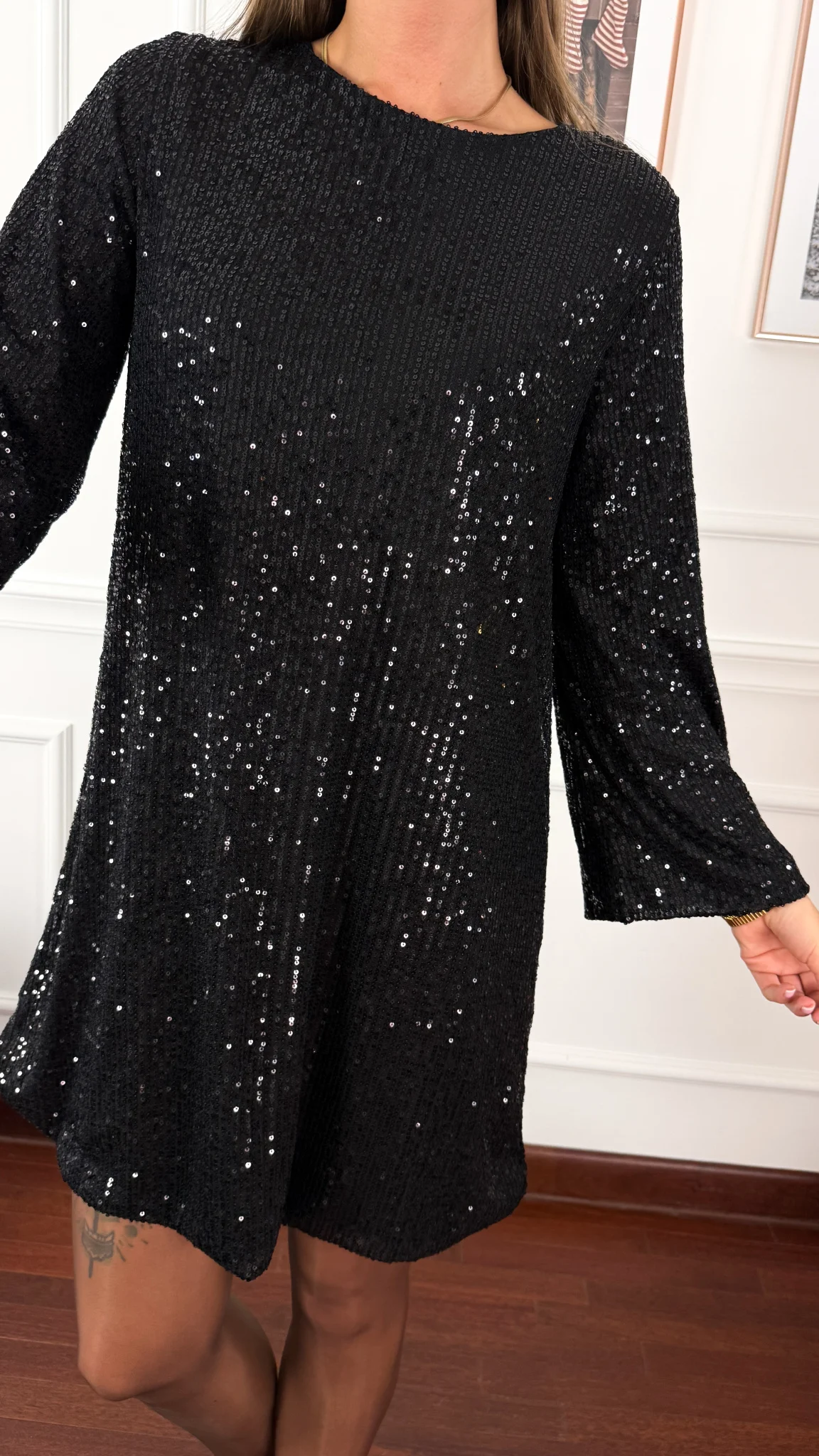 Model sprawdzi się na sylwetkę w rozmiarze od S do L. Cekinowa trapezowa sukienka z okrągłym dekoltem. Lekko rozkloszowany rękaw układający się w dzwonek. Z tyłu posiada satynową kokardę oraz wycięcie na plecach. Zakłada się ją przez głowę. Posiada podszewkę.