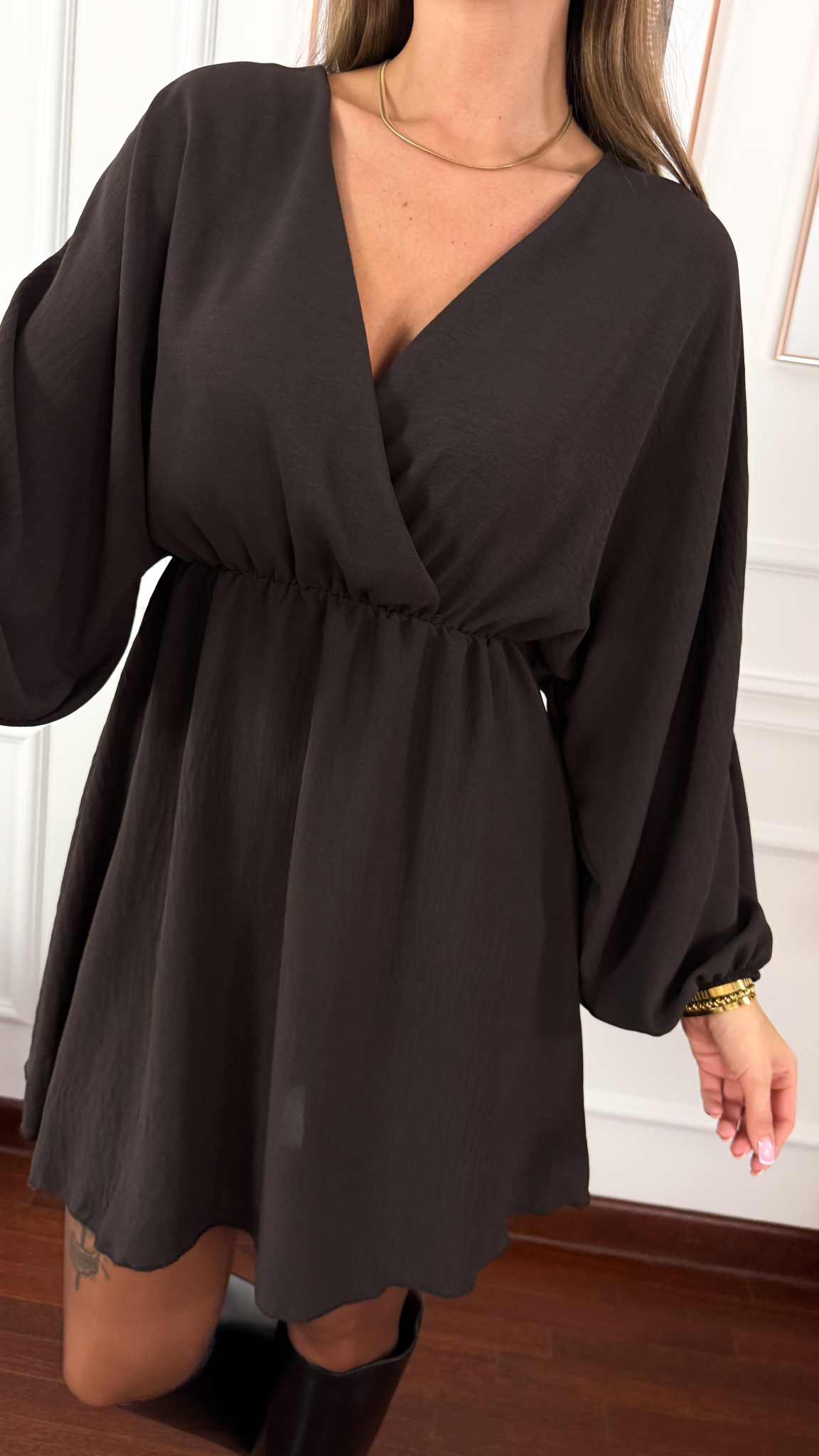 Sukienka sprawdzi się na sylwetkę w rozmiarze od S/M do XL. Model z dekoltem w serek o fasonie nietoperza/kimono. Posiada poszerzane rękawy. Na wysokości żeber wszyto gumkę.