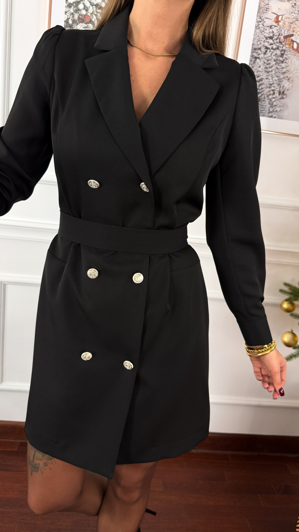 Jednolita sukienka żakietowa. Zapinana od przodu na ozdobne guziki. Dekolt w serek. Rękaw zakończony mankietem. Sprzedawana w zestawie z paskiem.