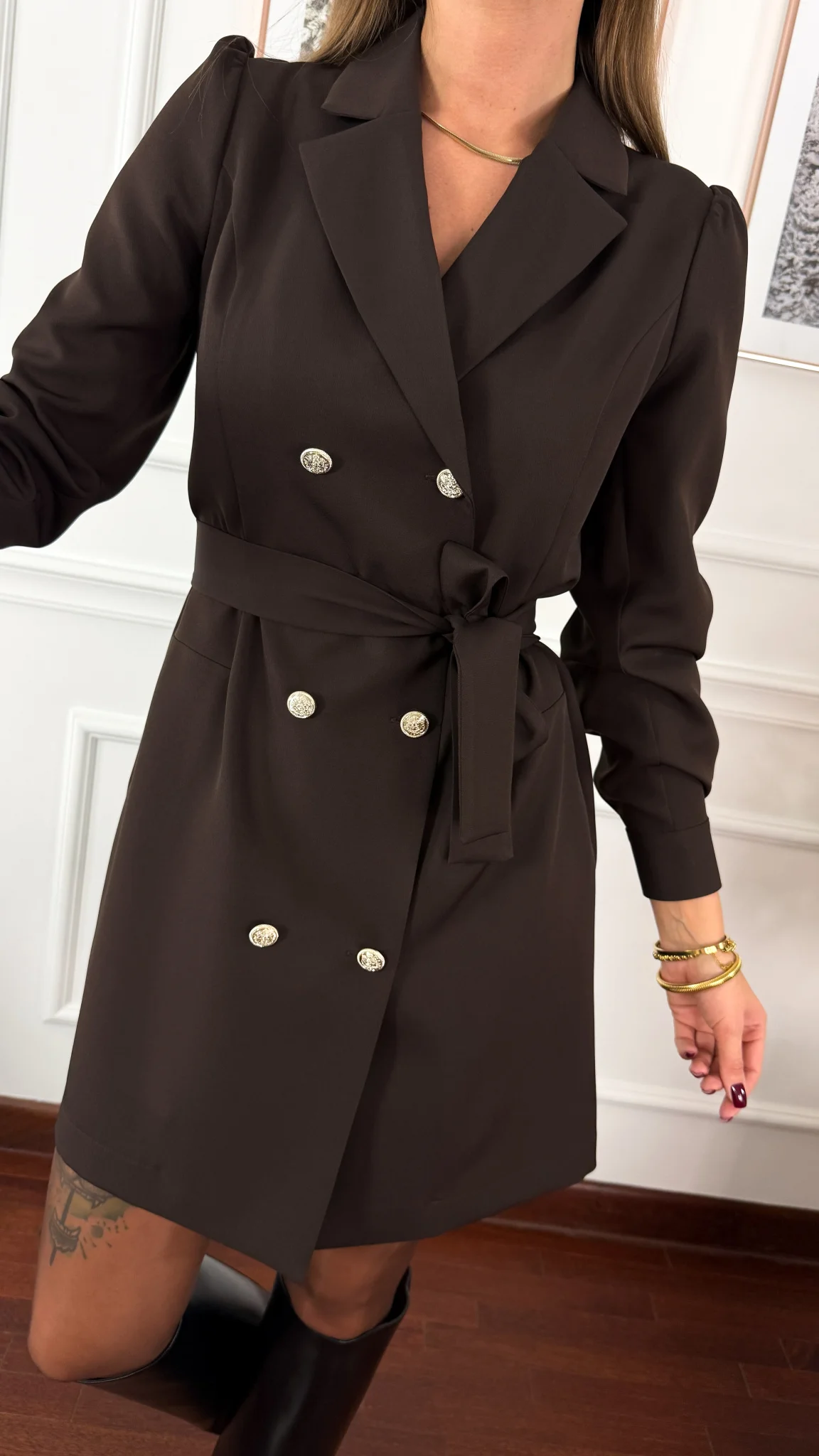 Jednolita sukienka żakietowa. Zapinana od przodu na ozdobne guziki. Dekolt w serek. Rękaw zakończony mankietem. Sprzedawana w zestawie z paskiem.