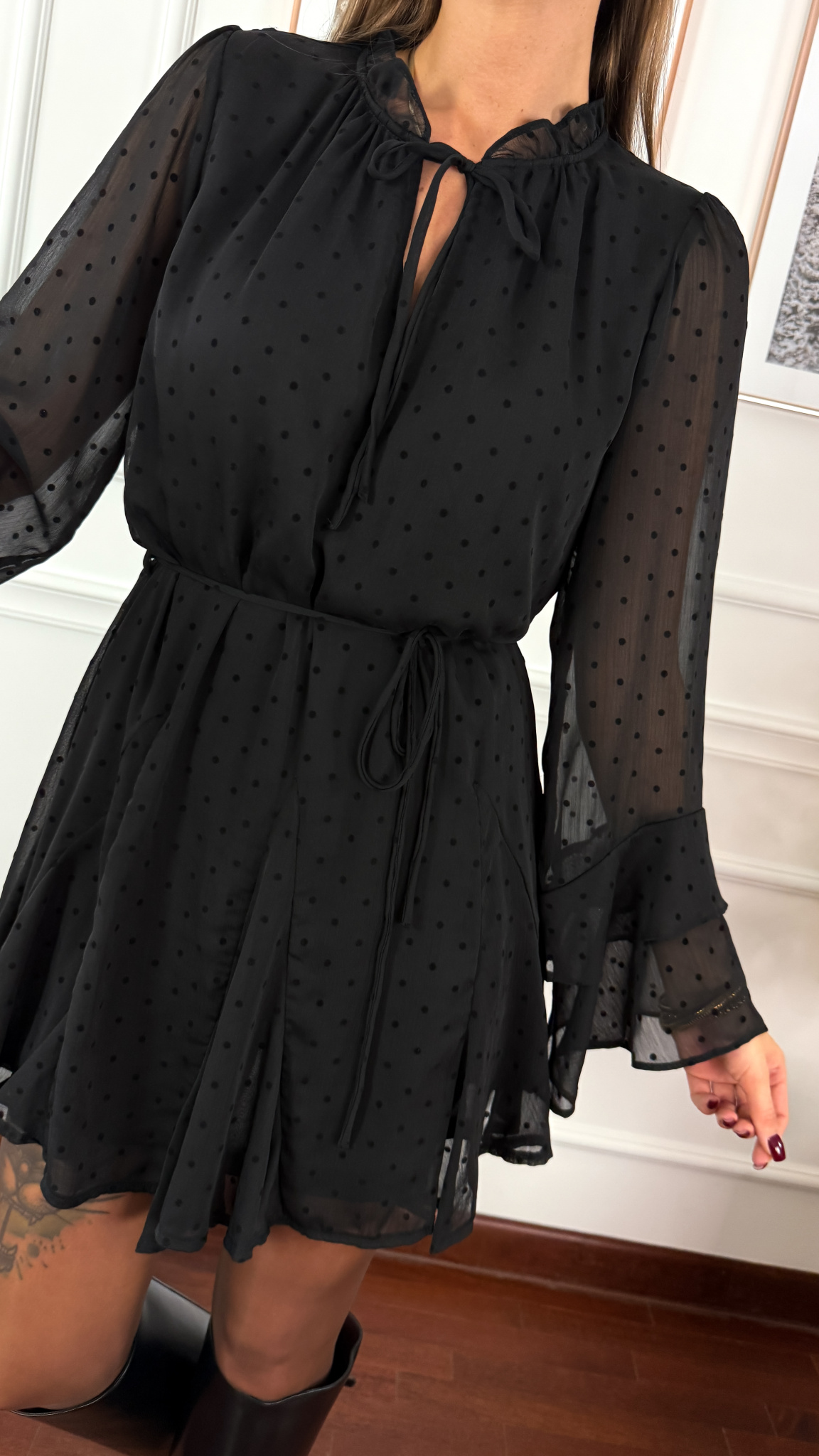 Tiulowa sukienka w kropki. Wiązany dekolt w serek ze stójką. Rękaw zakończony podwójną falbaną. Posiada podszewkę.