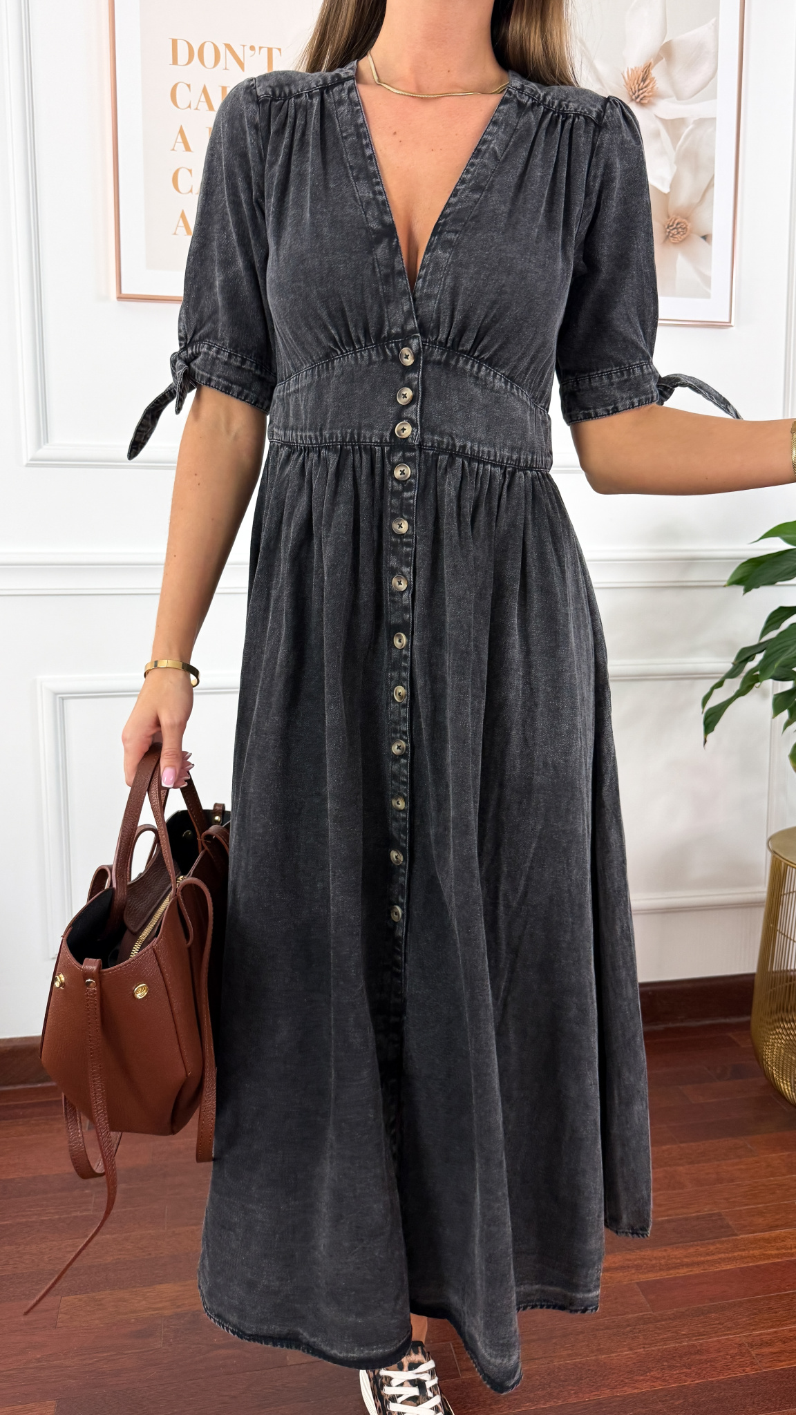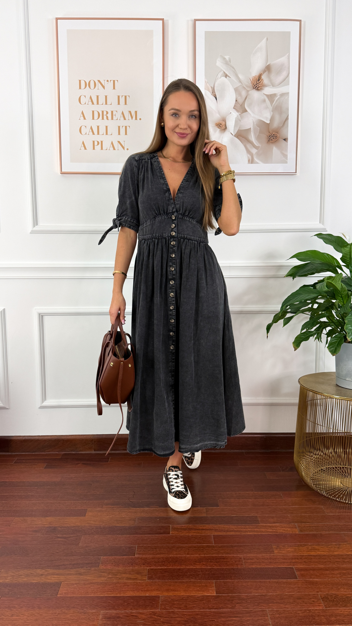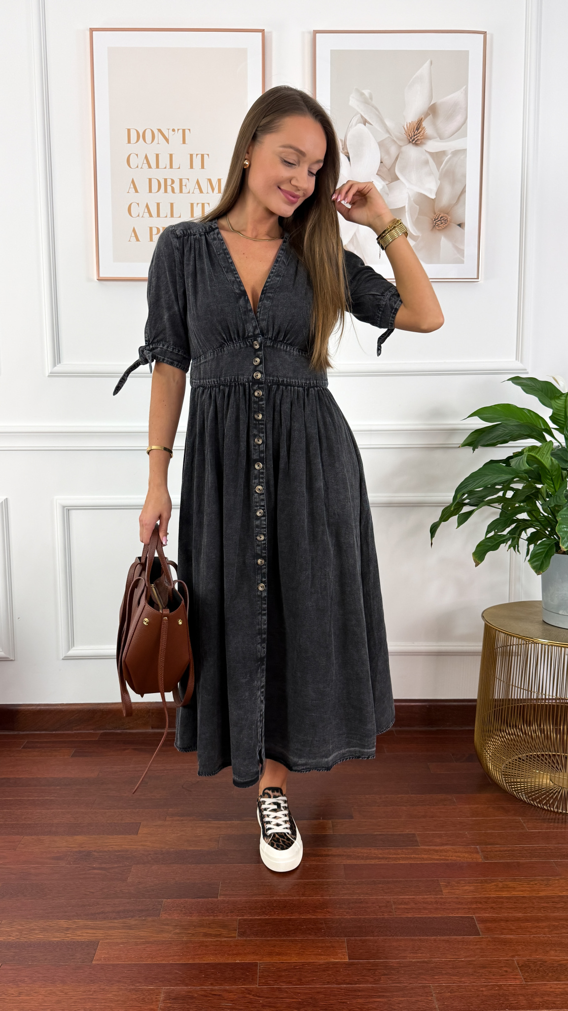Denimowa szmizjerka długości maxi z dekoltem w serek. Krótki rękaw zakończony sznurkami. Rozszerzana ku dołowi. Materiał jest dekatyzowany.