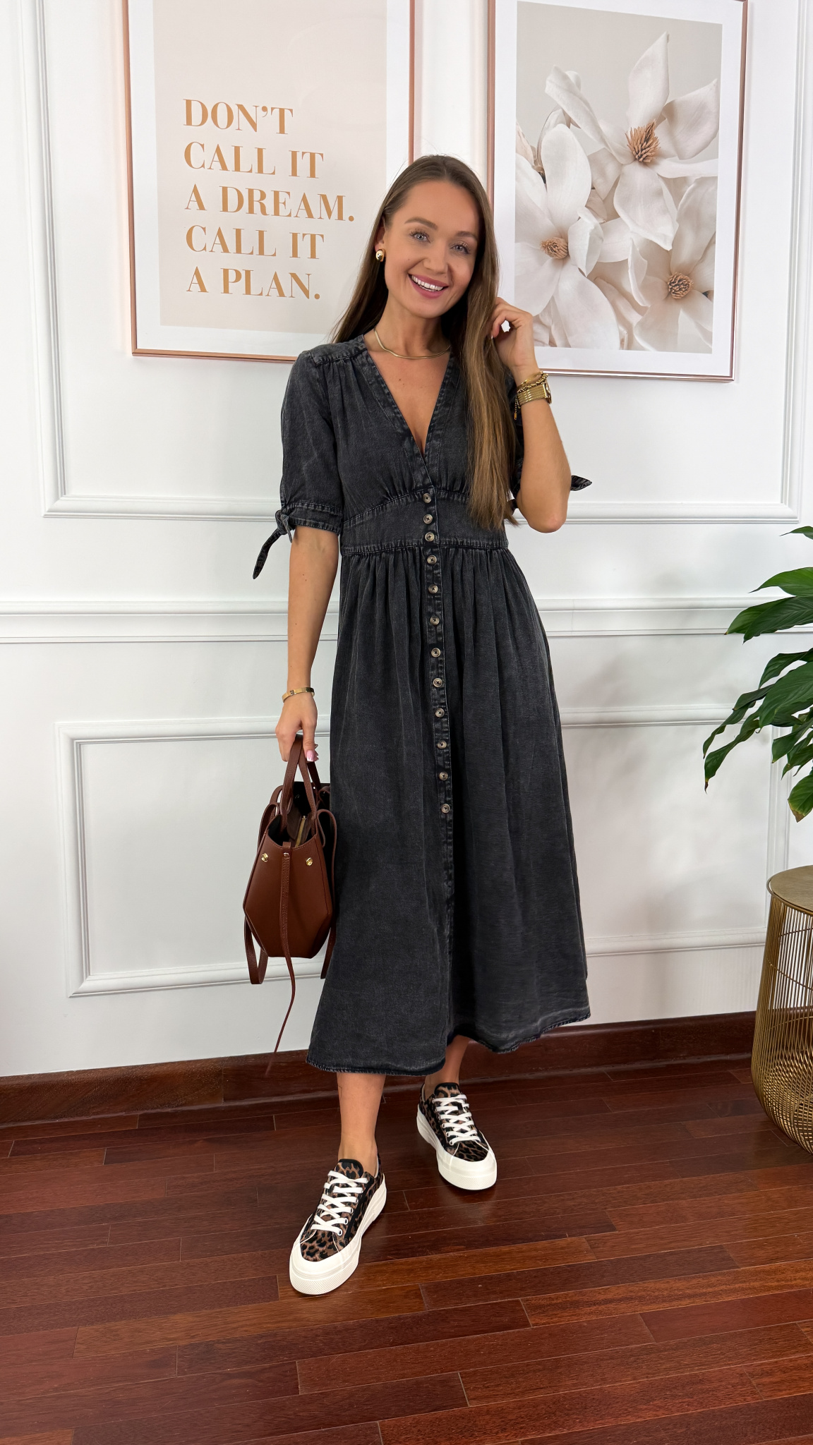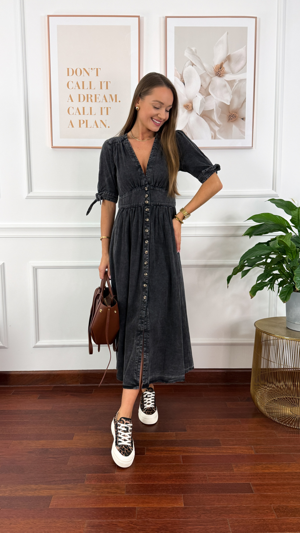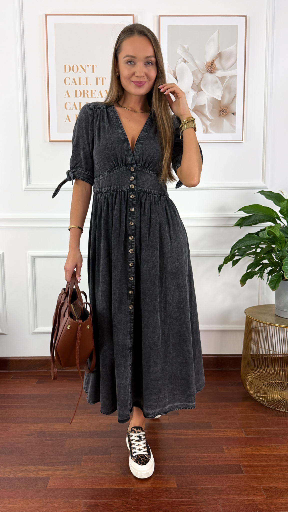 Denimowa szmizjerka długości maxi z dekoltem w serek. Krótki rękaw zakończony sznurkami. Rozszerzana ku dołowi. Materiał jest dekatyzowany.