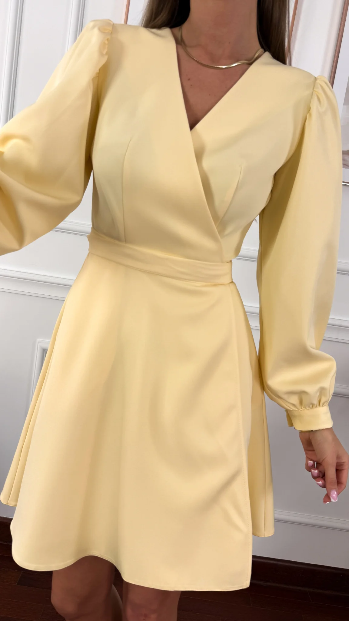 Jest to model przekładany, który pozwala idealnie dopasować szerokość sukienki do sylwetki. Rękaw zakończony szerszym mankietem zapinanym na guzik. Posiada praktyczne kieszonki.