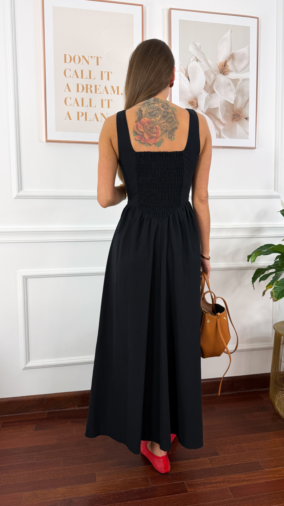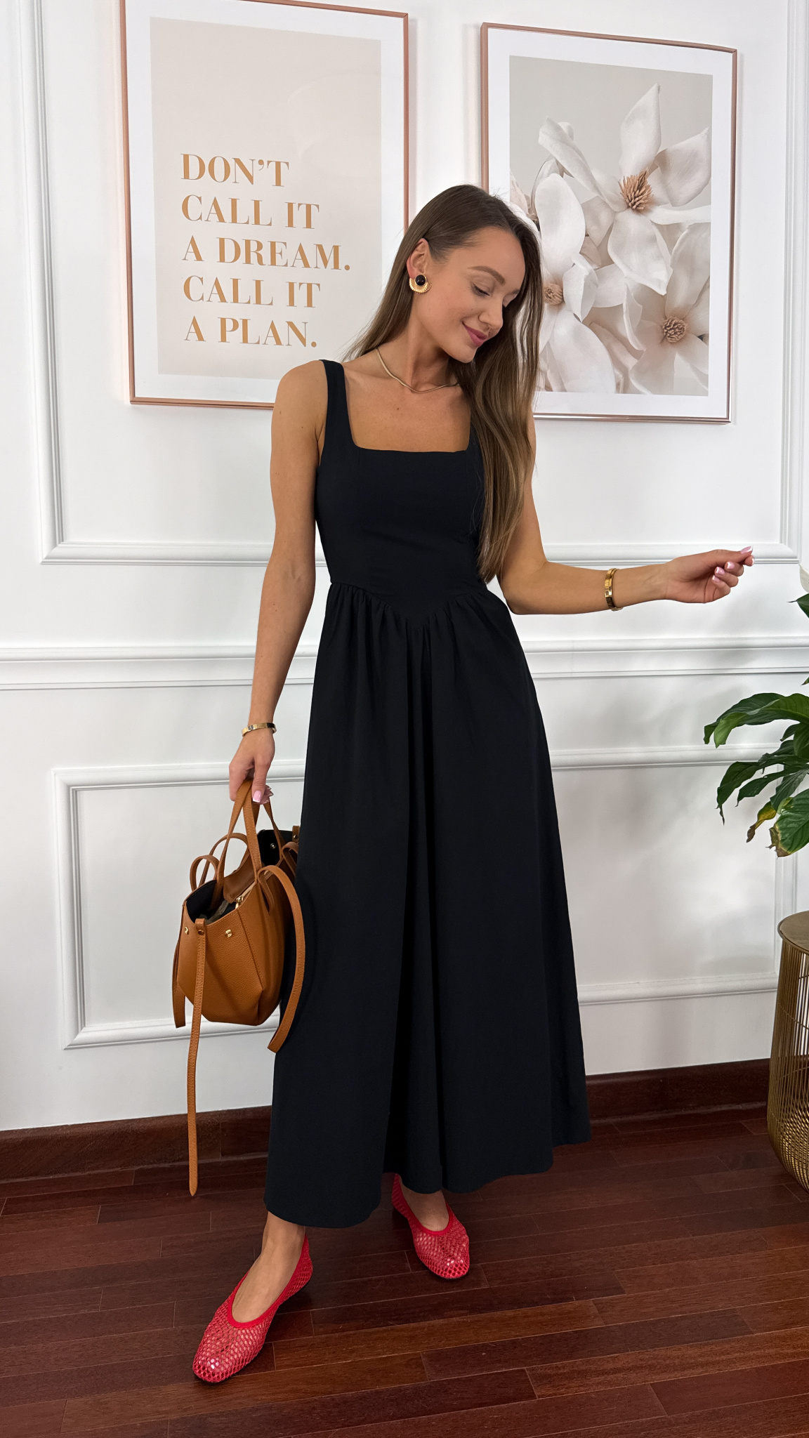 Sukienka midi na szerszych ramiączkach. W górnej części wszyto szerszy ściągacz. Zapinana od boku na zamek. Posiada podszewkę.