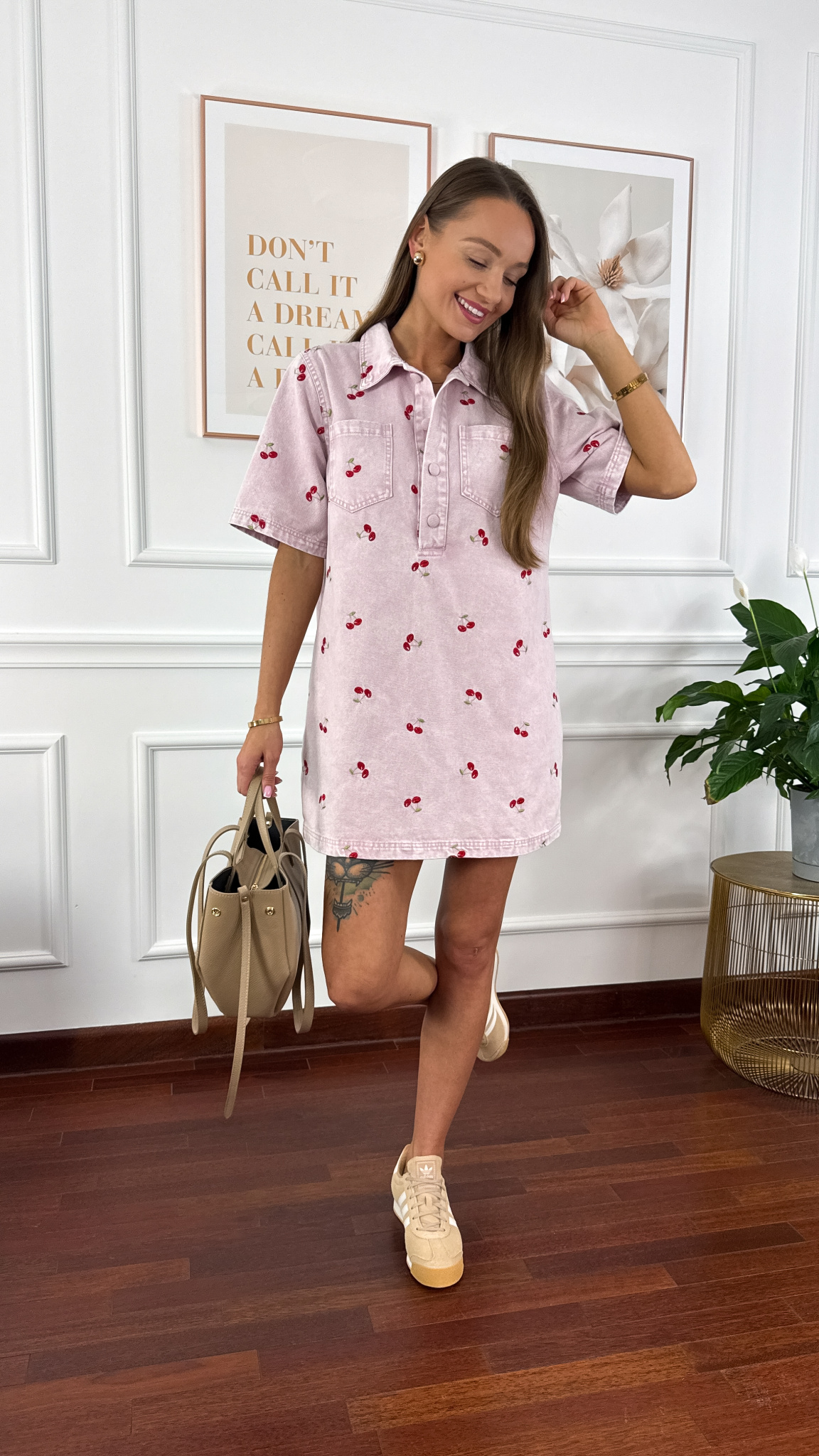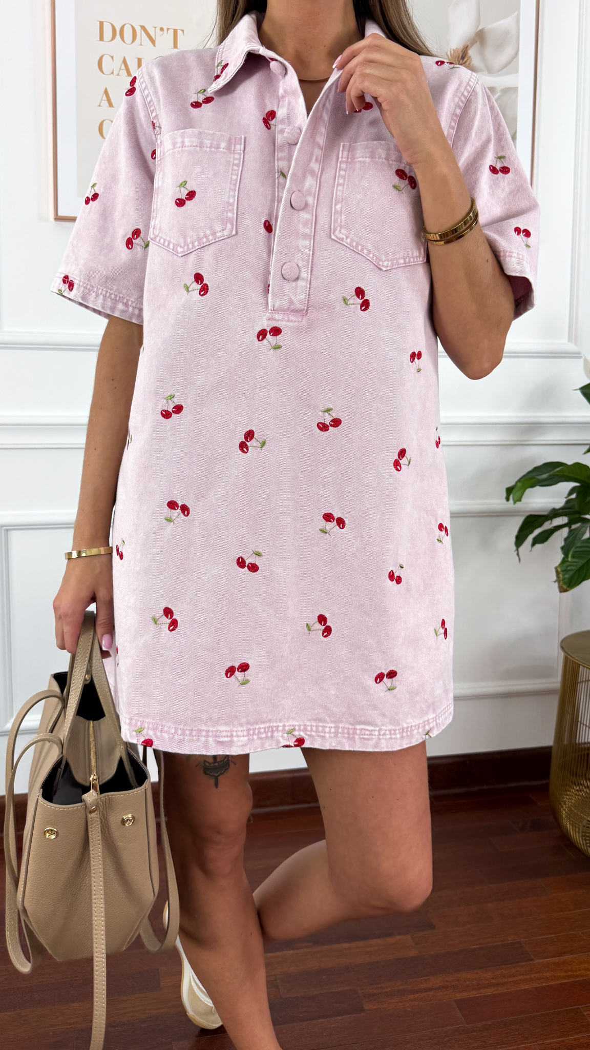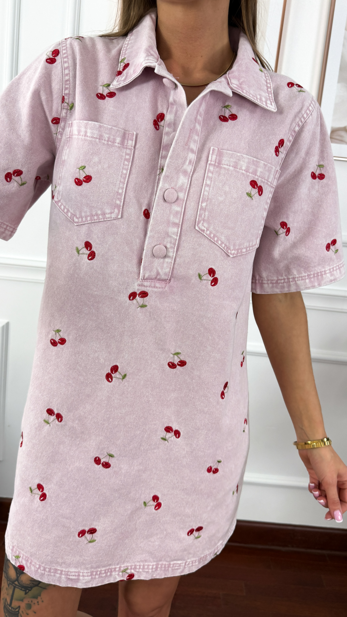 Model sprawdzi się na sylwetkę w rozmiarze od S do L. Sukienka zapinana na guzik. Od przodu dwie praktyczne kieszonki. Jako element dekoracyjny wyhaftowane wiśnie.