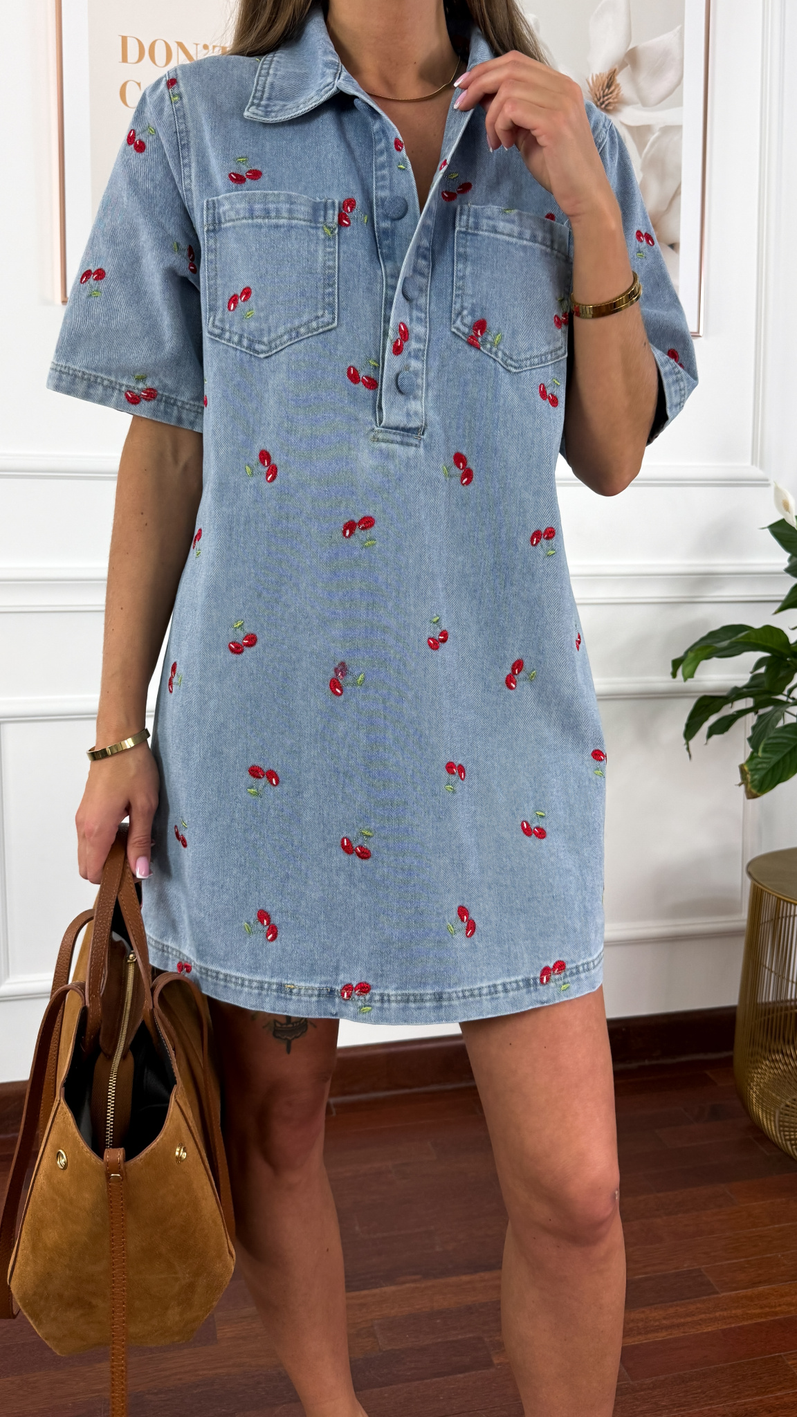 Model sprawdzi się na sylwetkę w rozmiarze od S do L. Sukienka zapinana na guzik. Od przodu dwie praktyczne kieszonki. Jako element dekoracyjny wyhaftowane wiśnie.