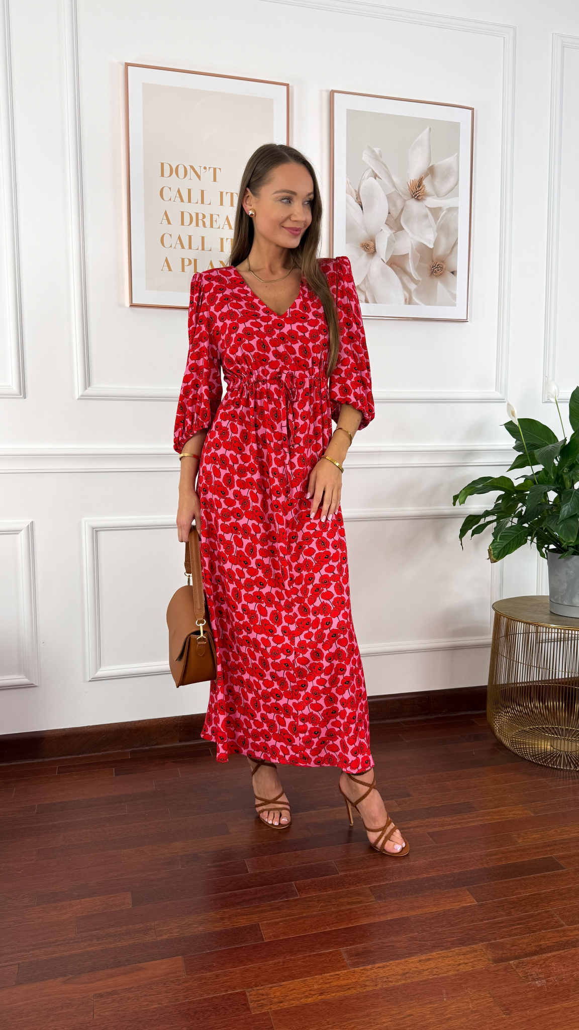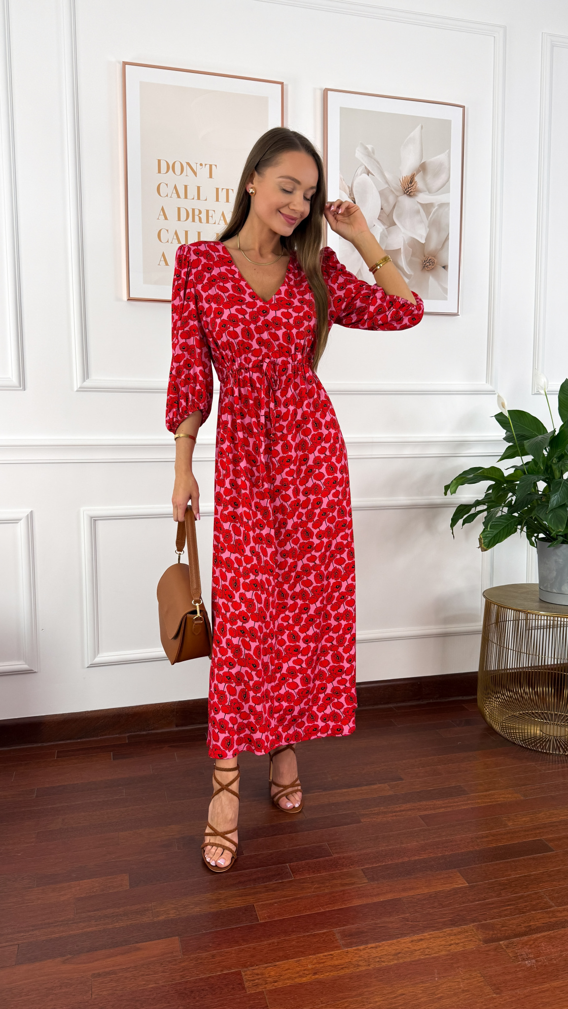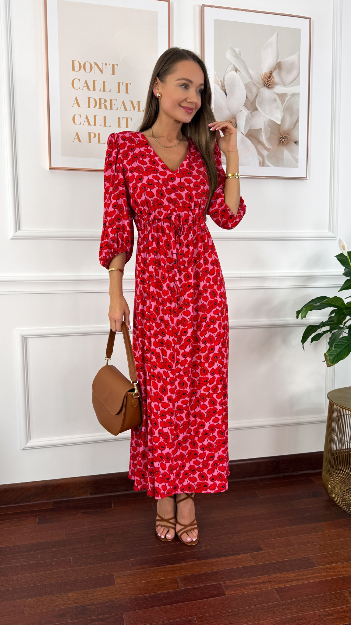 Wiskozowa sukienka maxi. W ramionach wszyto poduszki. Dekolt w serek oraz rękaw zakończonym gumką. W talii wszyto troczek.